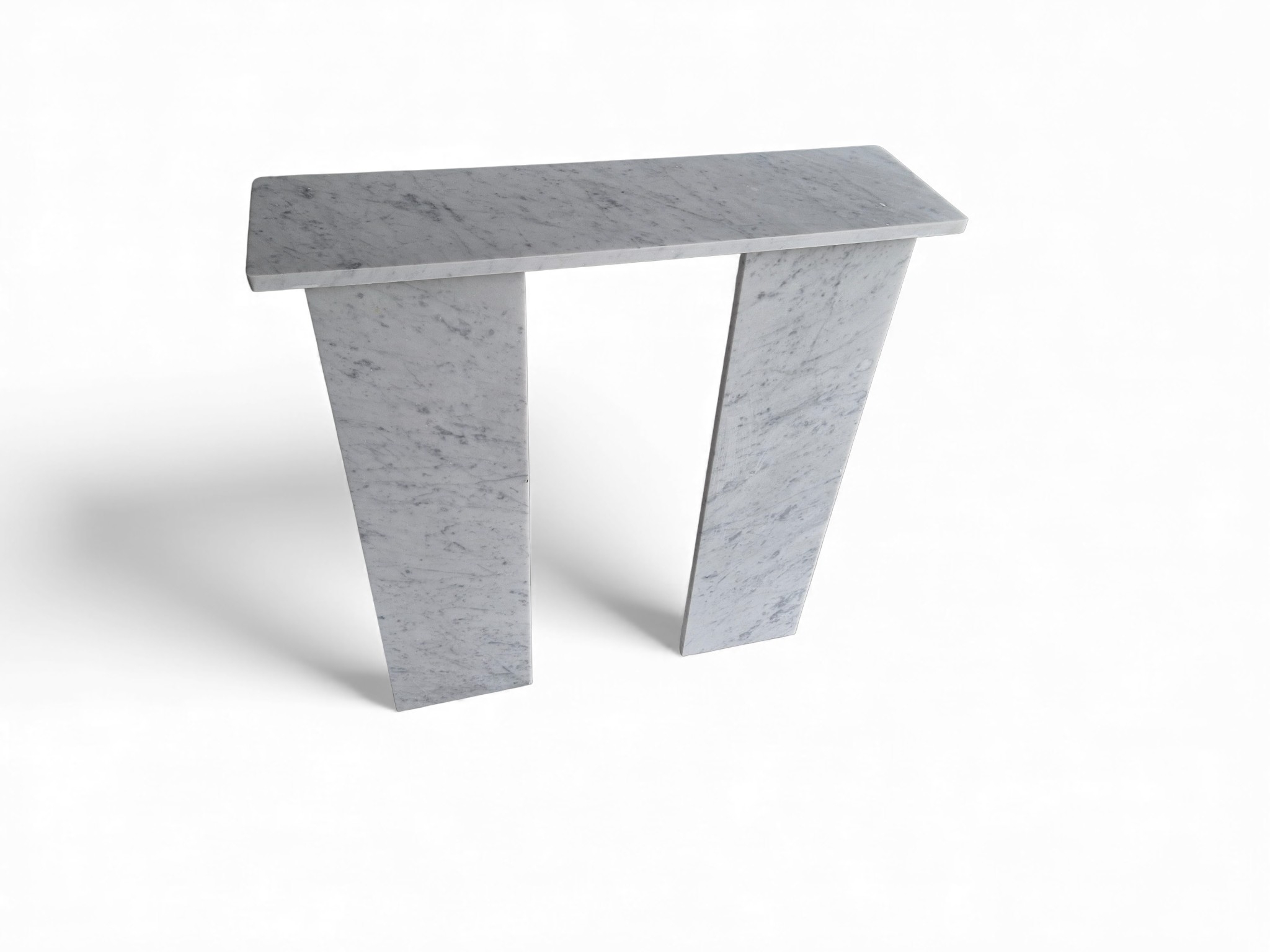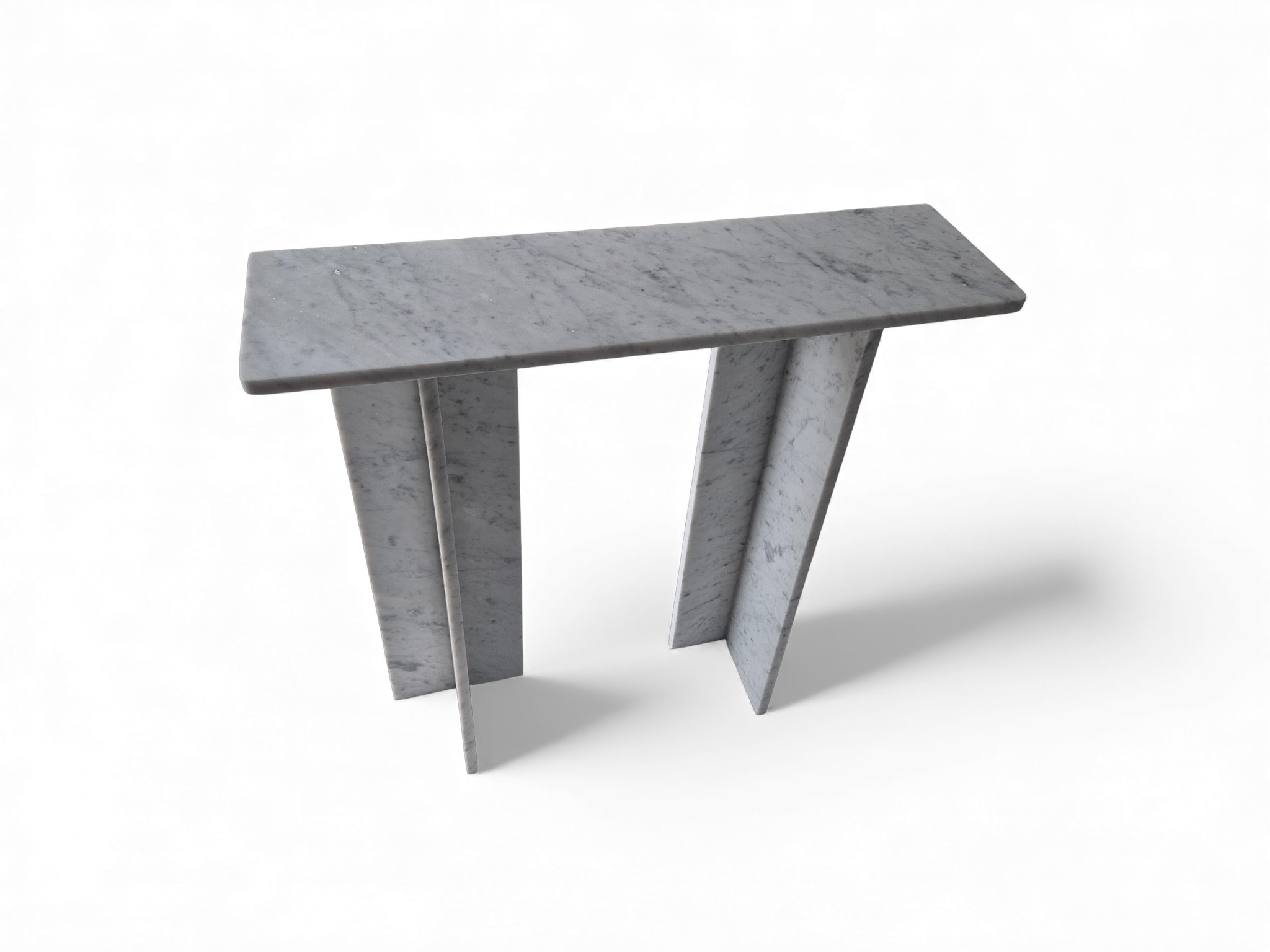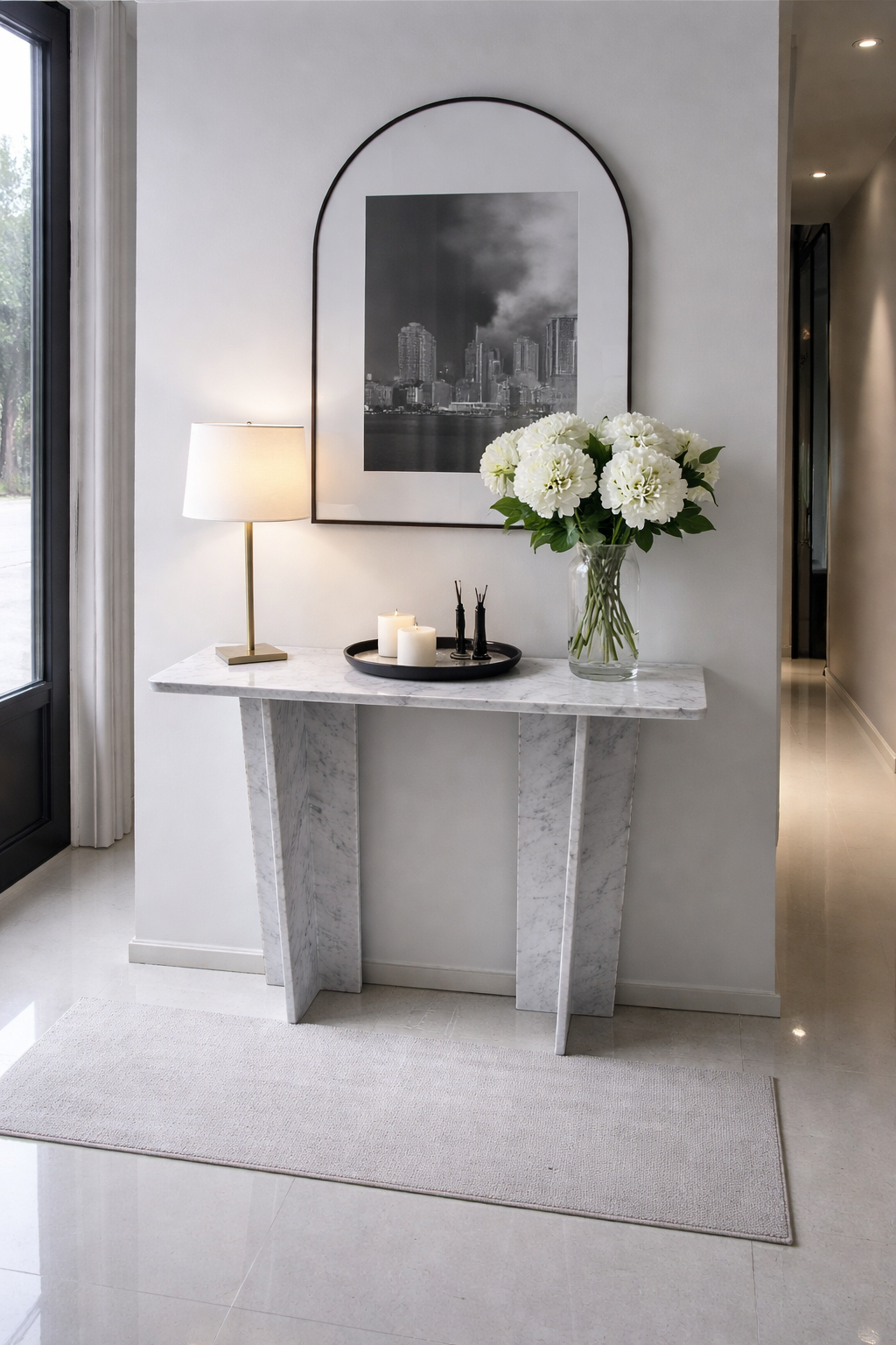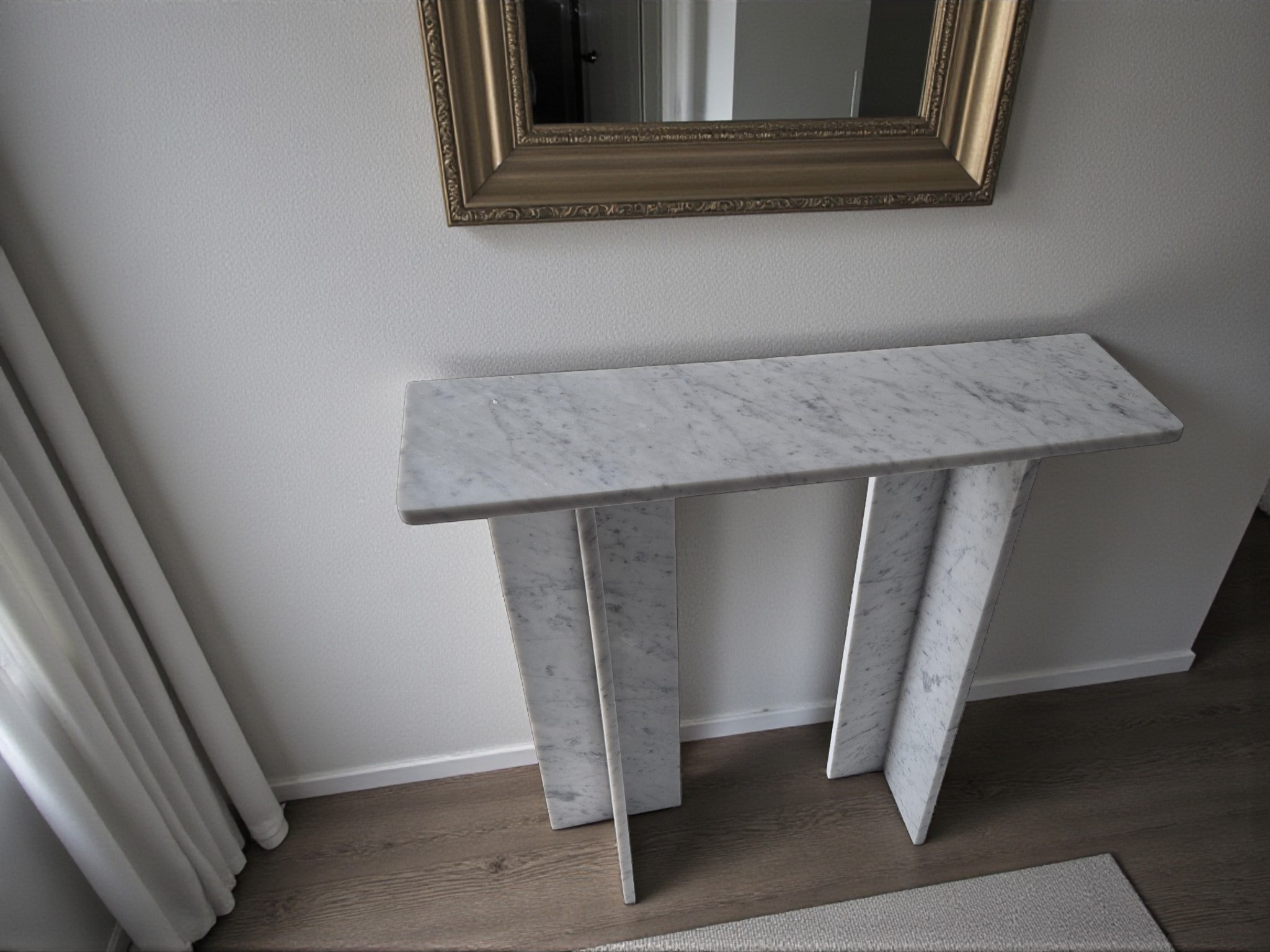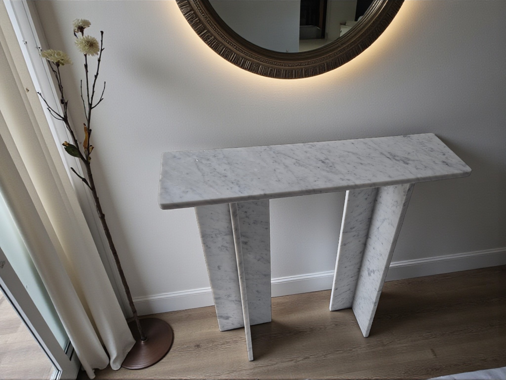 Wąska konsola Bianco Carrara (marmur) to elegancki i ponadczasowy element aranżacji wnętrza. Jasna kolorystyka z delikatnym, szarym użyleniem oraz polerowana powierzchnia podkreślają luksusowy charakter kamienia. Minimalistyczna forma sprawia, że konsola doskonale sprawdzi się w nowoczesnych i klasycznych przestrzeniach.