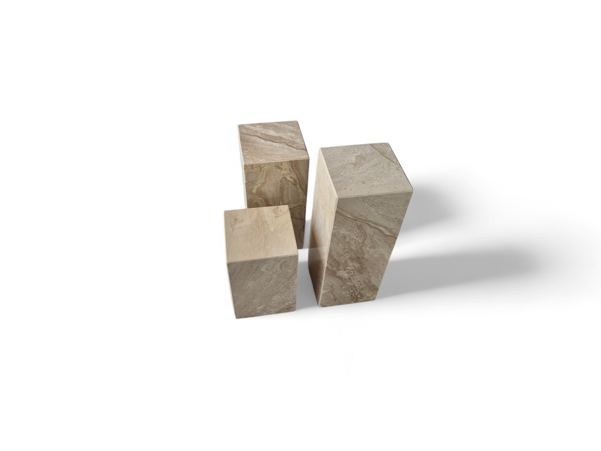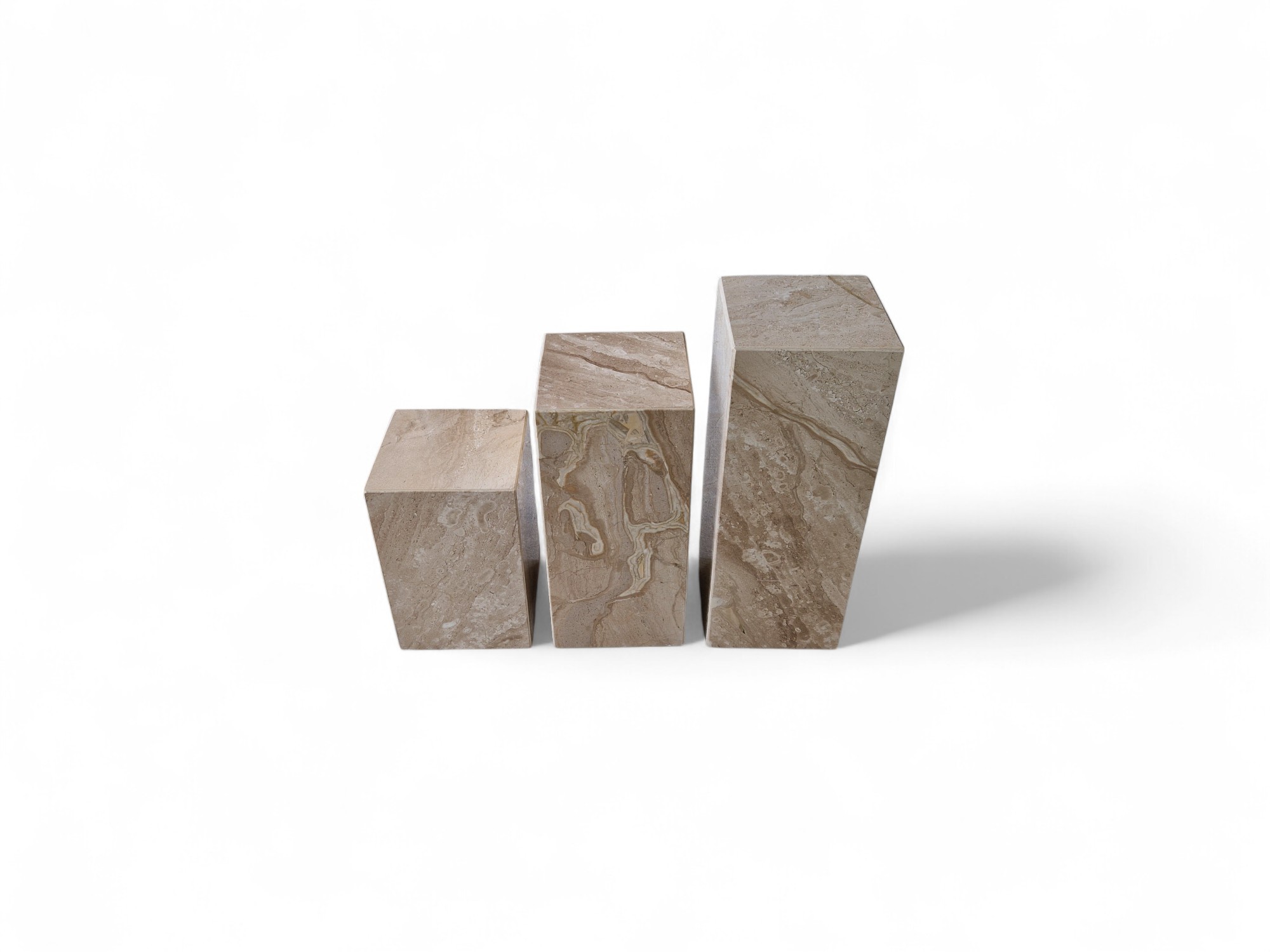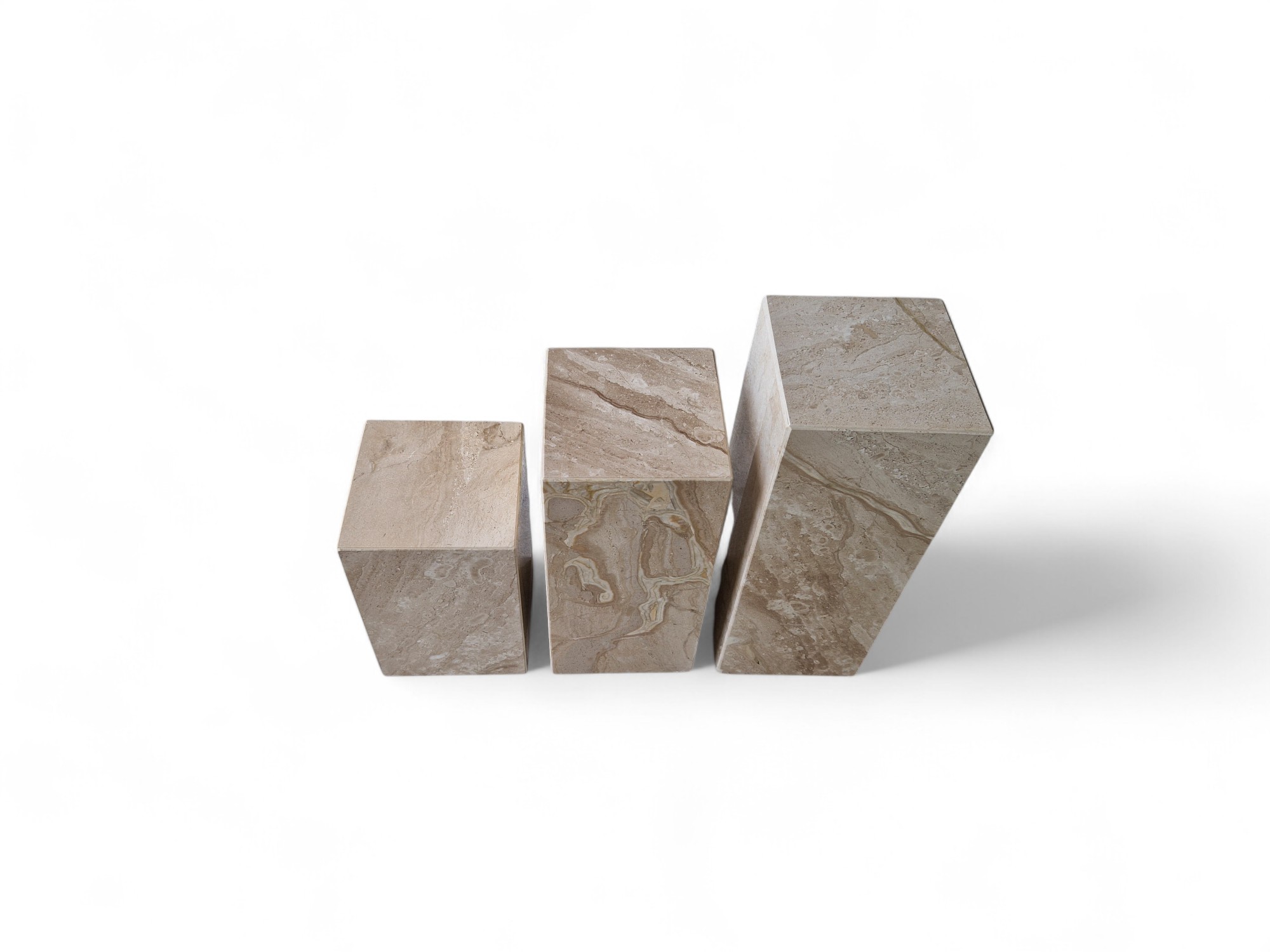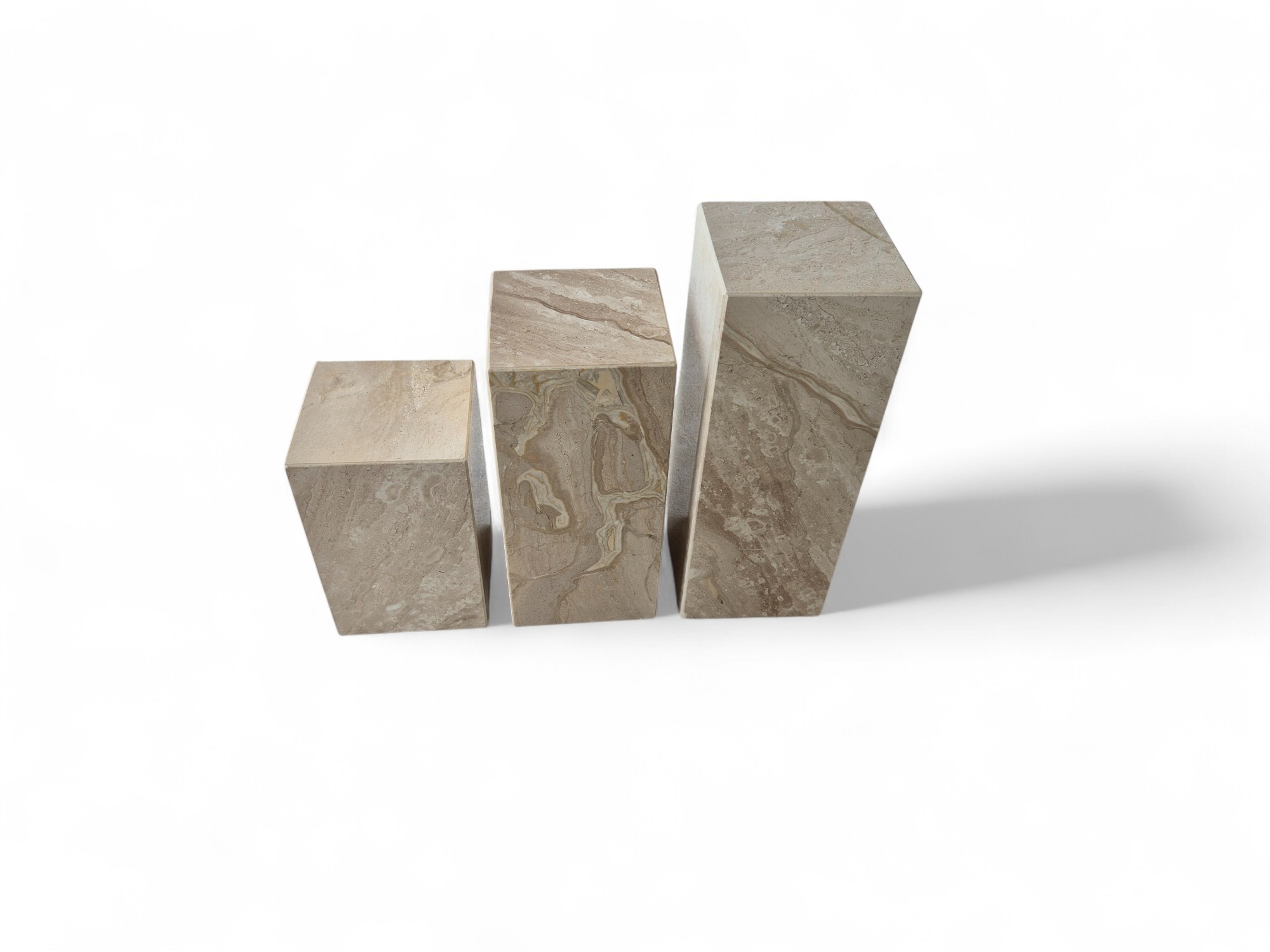 Kwietnik marmurowy stojący z naturalnego marmuru Daino Reale to elegancki zestaw ekspozycyjny o ciepłych, kremowo-beżowych odcieniach. Trzy kamienne kolumny o zróżnicowanych wysokościach tworzą spójną, dekoracyjną kompozycję idealną do salonu i przestrzeni reprezentacyjnych.