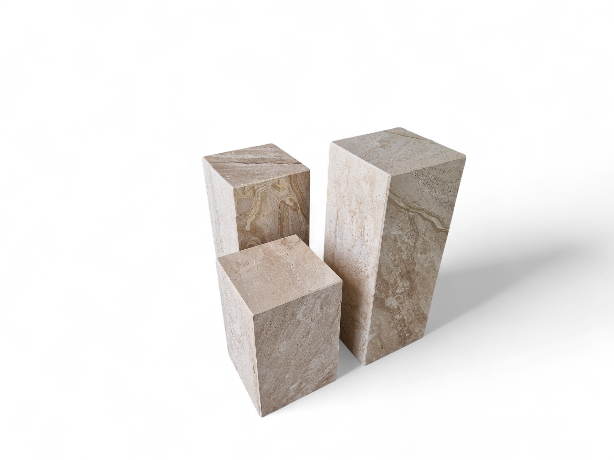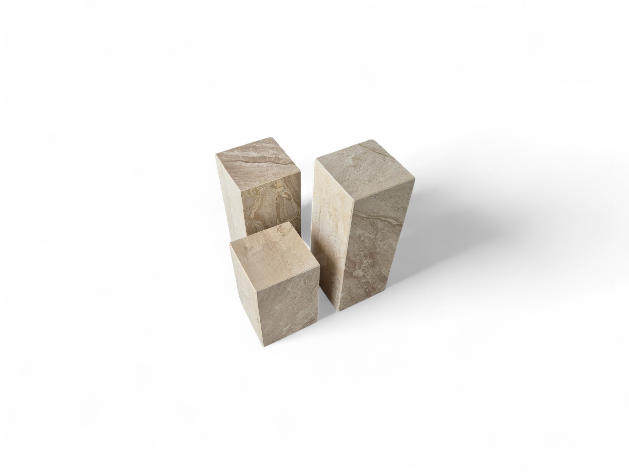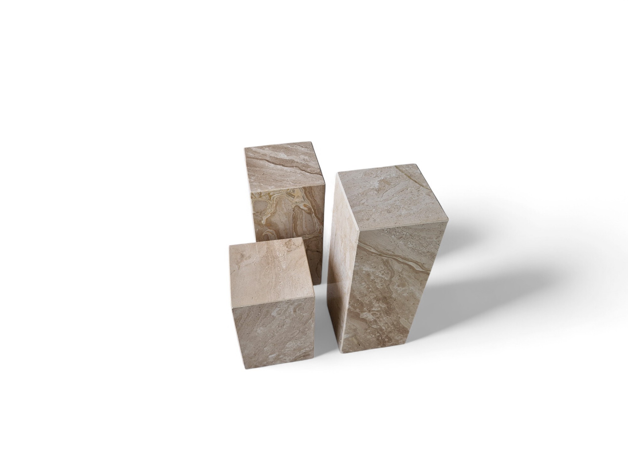 Kwietnik marmurowy stojący z naturalnego marmuru Daino Reale to elegancki zestaw ekspozycyjny o ciepłych, kremowo-beżowych odcieniach. Trzy kamienne kolumny o zróżnicowanych wysokościach tworzą spójną, dekoracyjną kompozycję idealną do salonu i przestrzeni reprezentacyjnych.