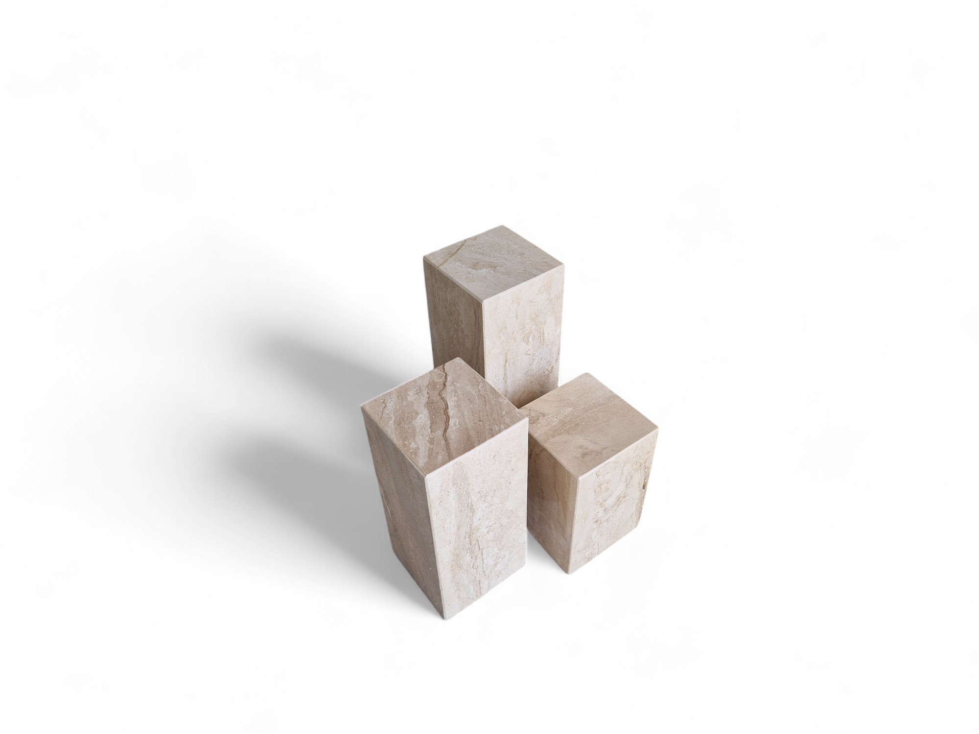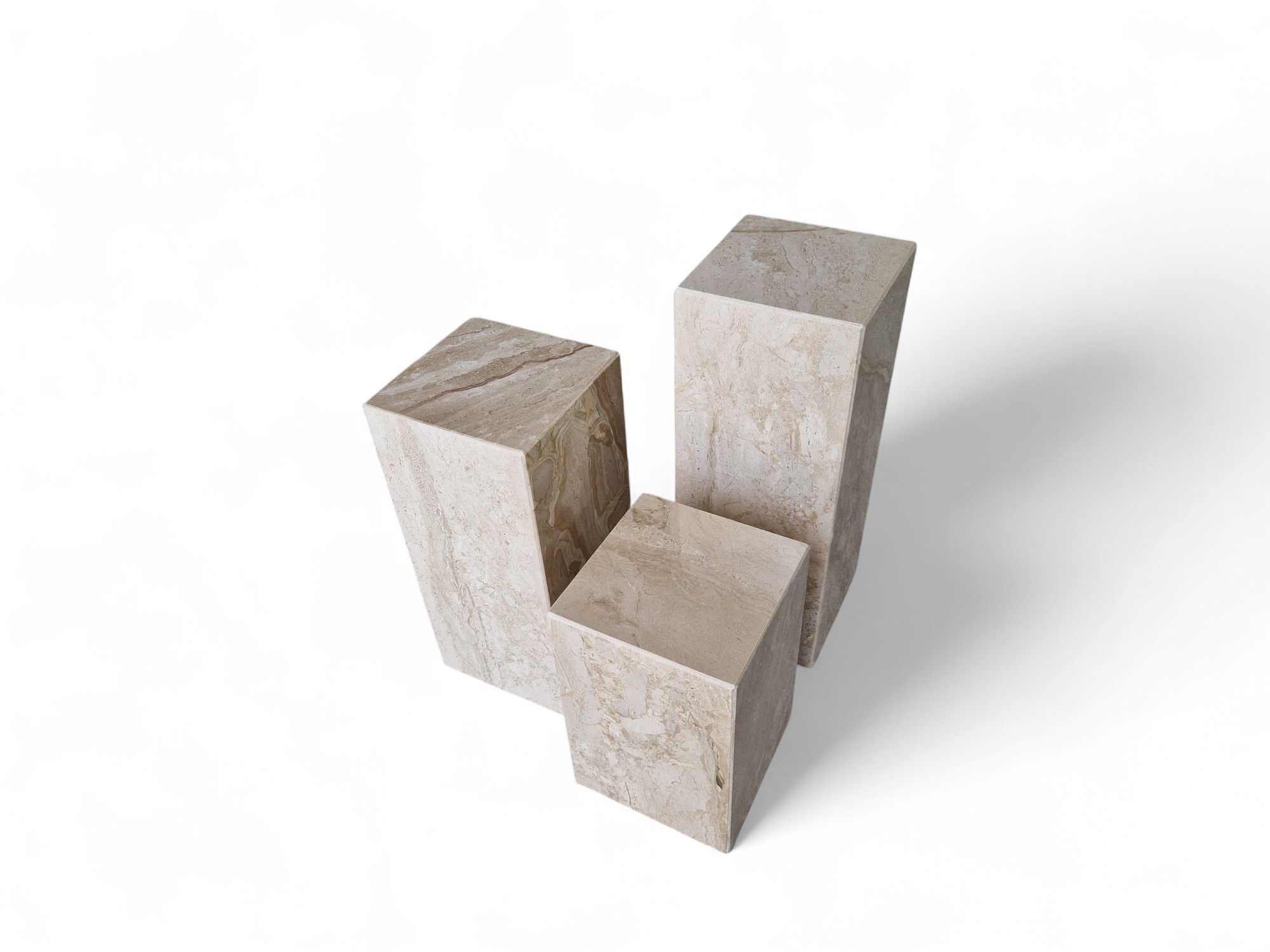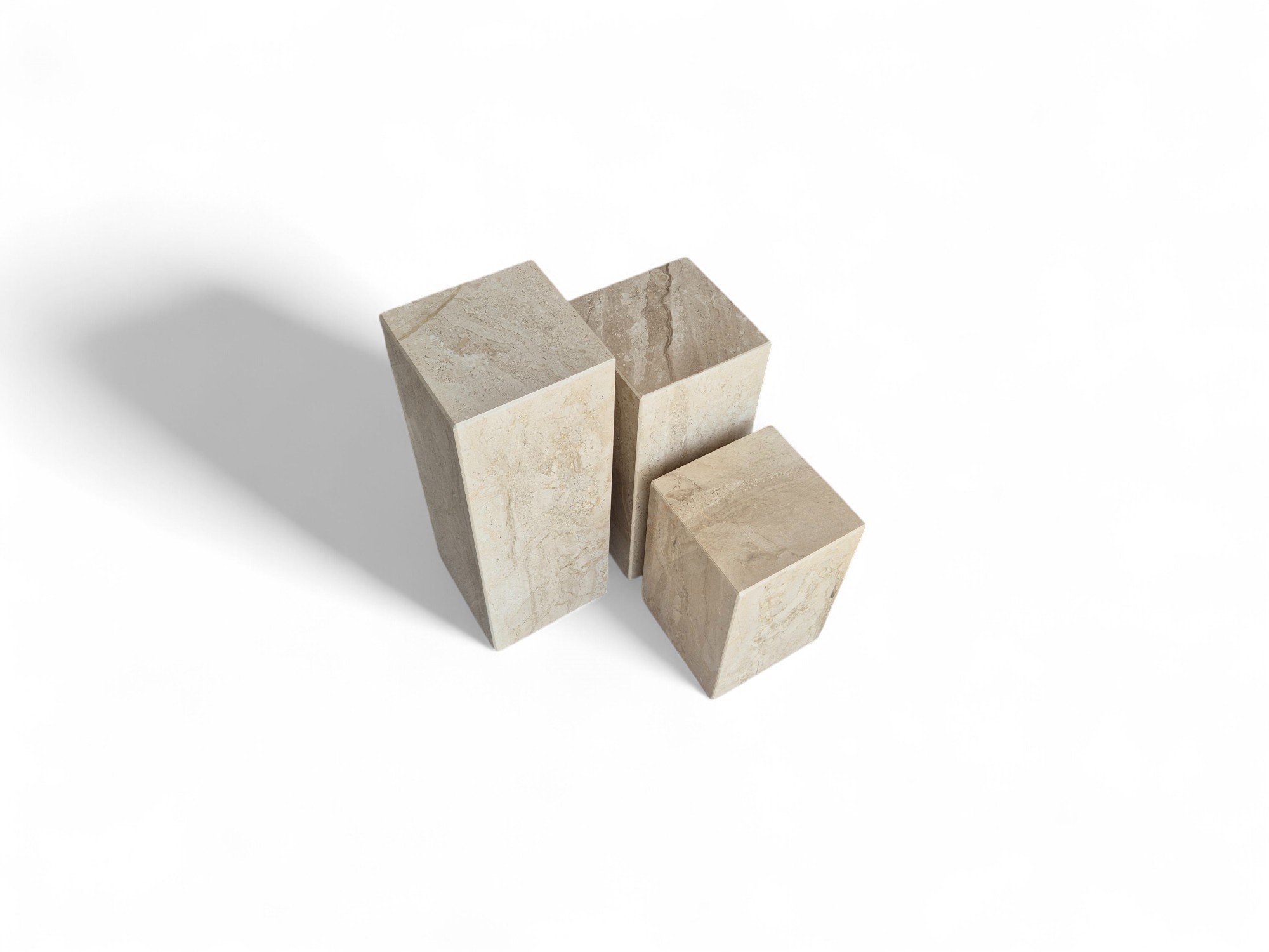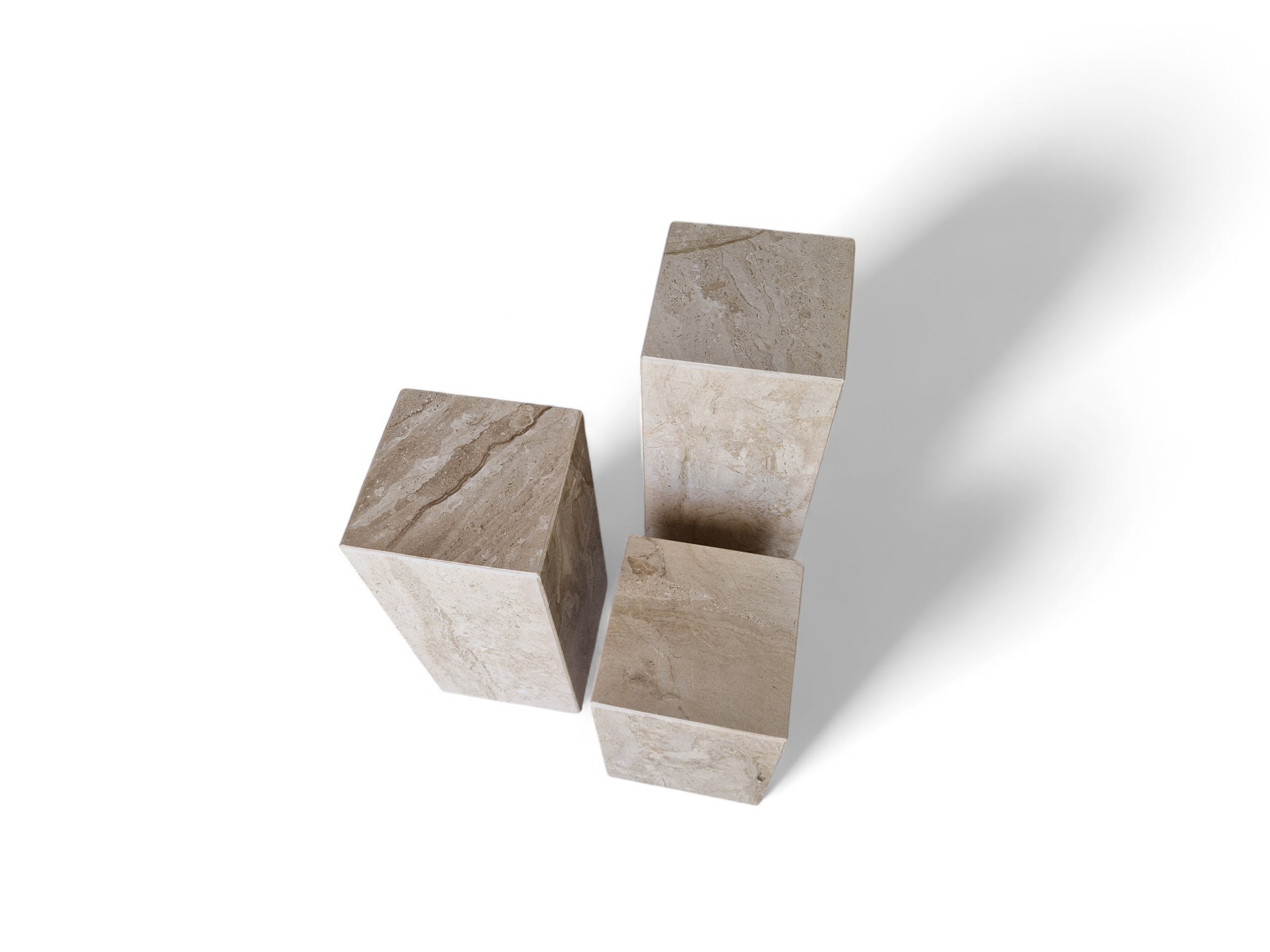 Kwietnik marmurowy stojący z naturalnego marmuru Daino Reale to elegancki zestaw ekspozycyjny o ciepłych, kremowo-beżowych odcieniach. Trzy kamienne kolumny o zróżnicowanych wysokościach tworzą spójną, dekoracyjną kompozycję idealną do salonu i przestrzeni reprezentacyjnych.