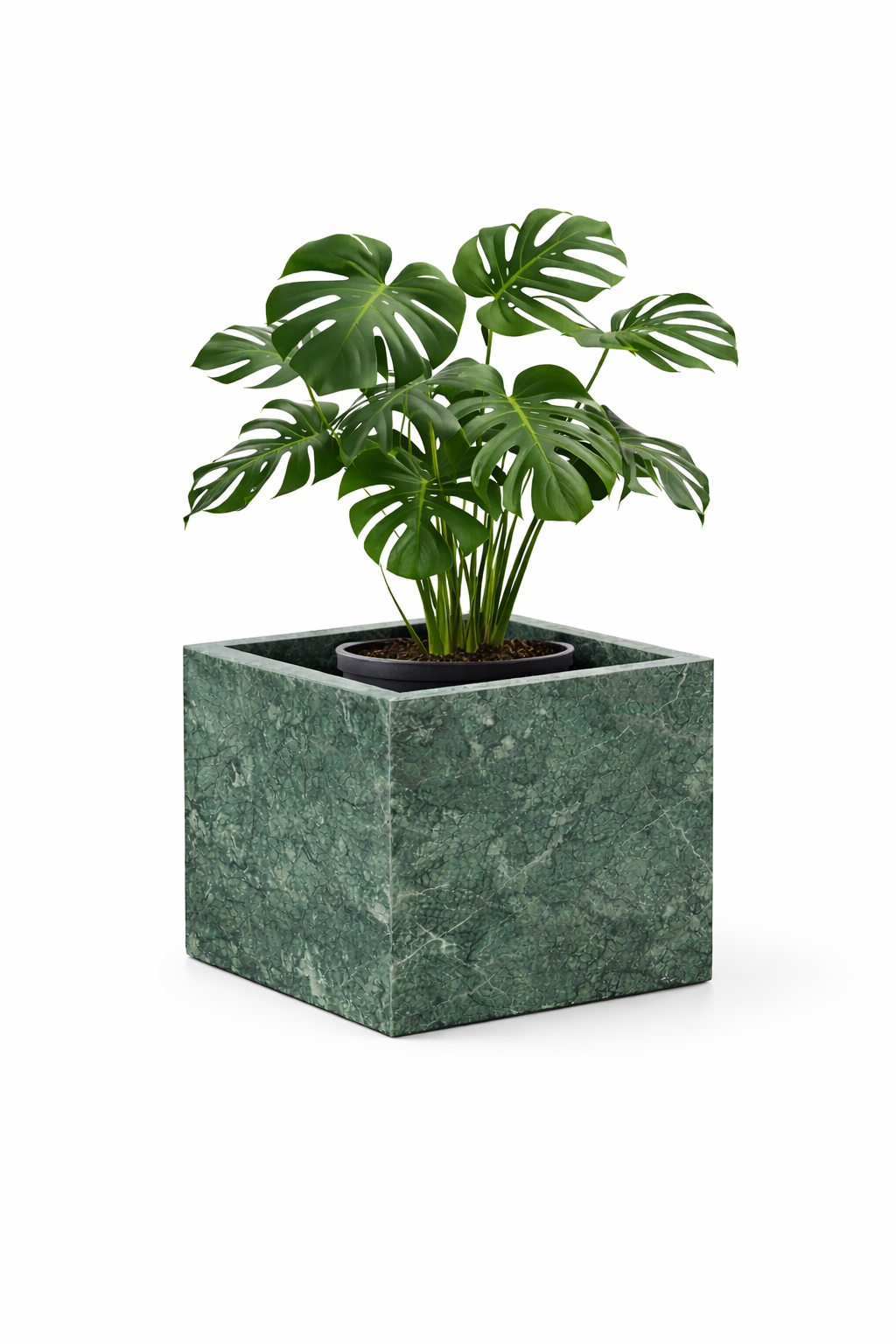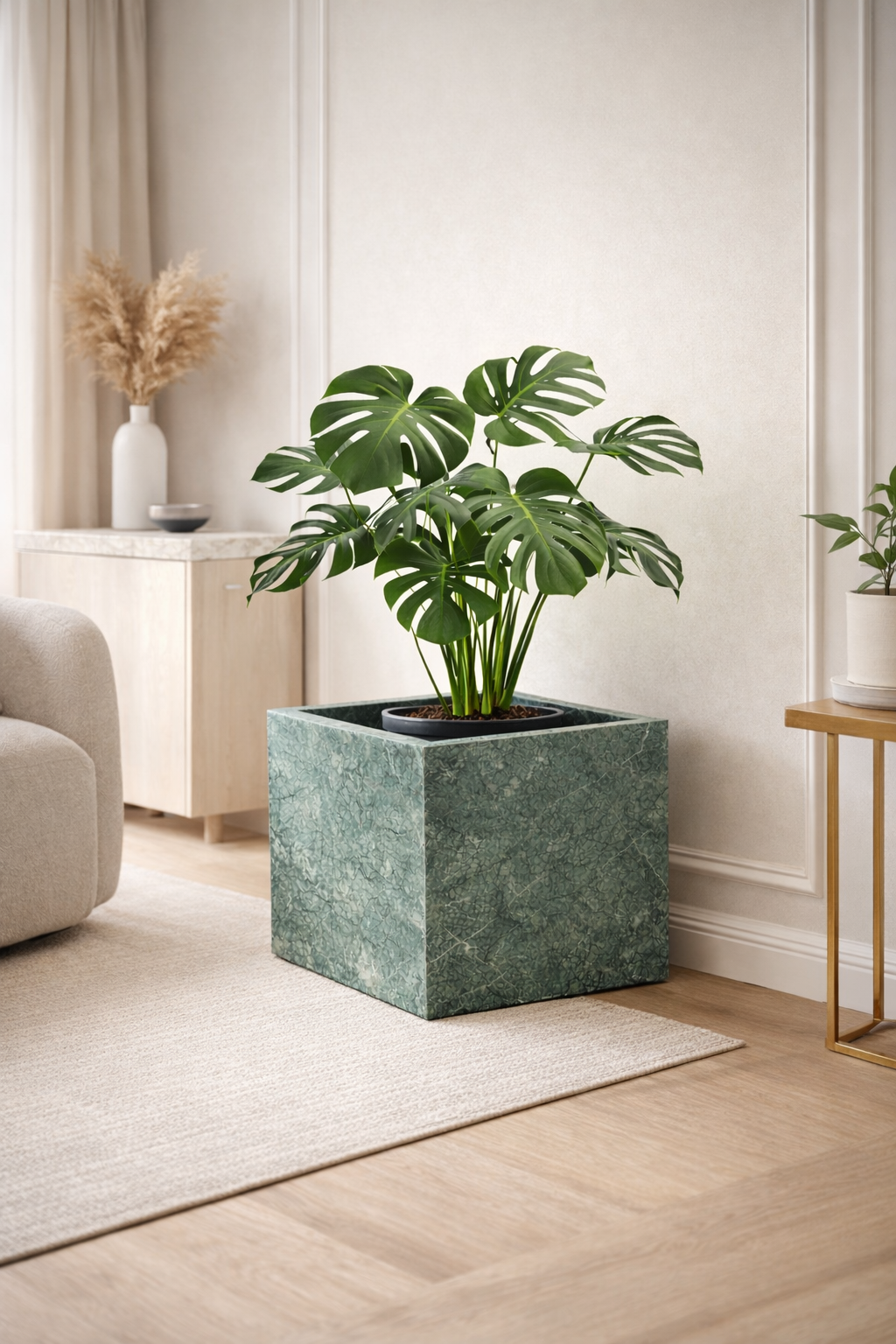 Osłona na donicę z marmuru Verde Guatemala to elegancka i wyrazista forma, która doskonale podkreśla charakter roślin we wnętrzach.