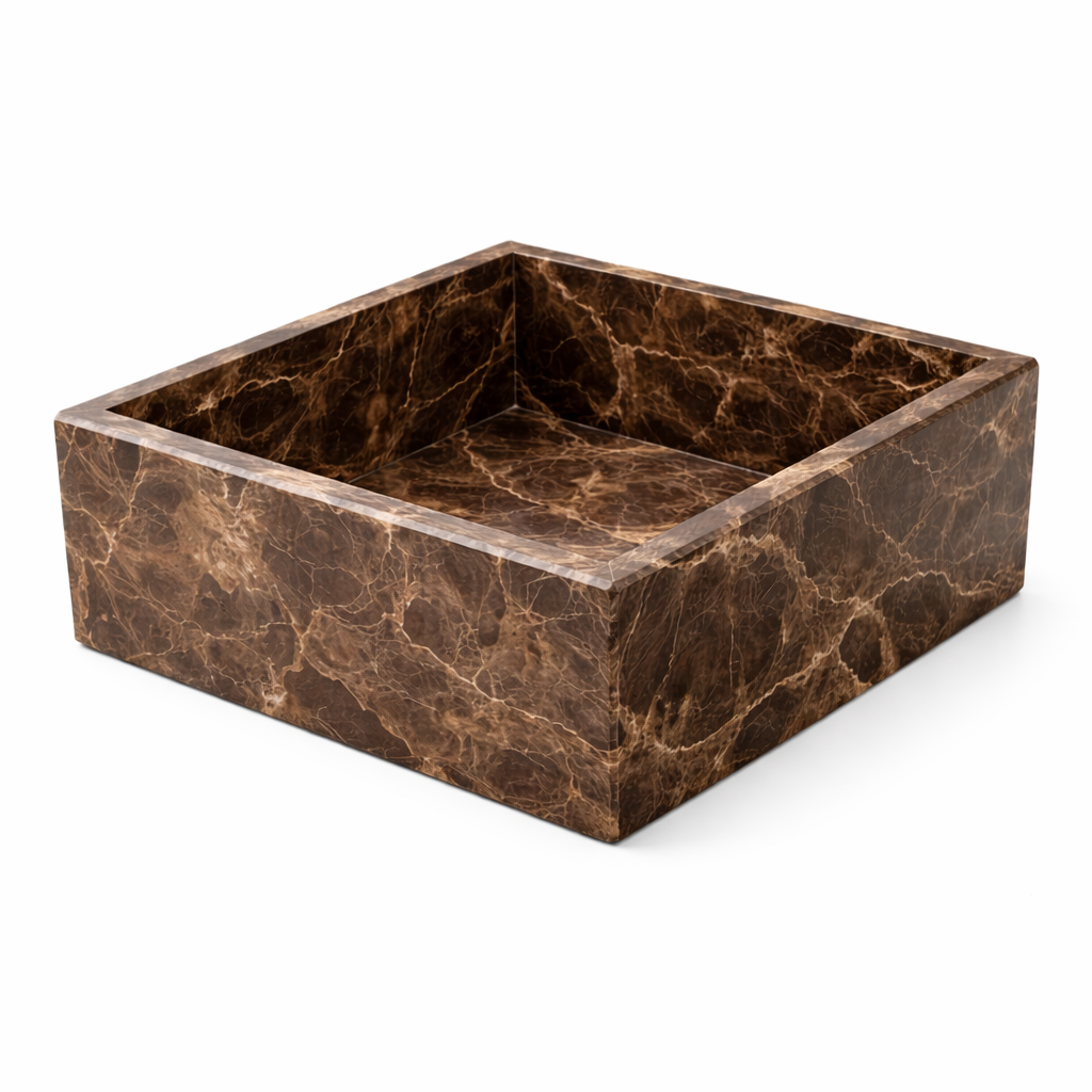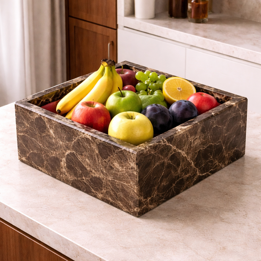 Marmurowy pojemnik dekoracyjny z Emperador Dark, jego minimalistyczna, geometryczna forma sprawia, że doskonale sprawdzi się jako misa na owoce, organizer lub stylowa dekoracja do kuchni, salonu czy jadalni.