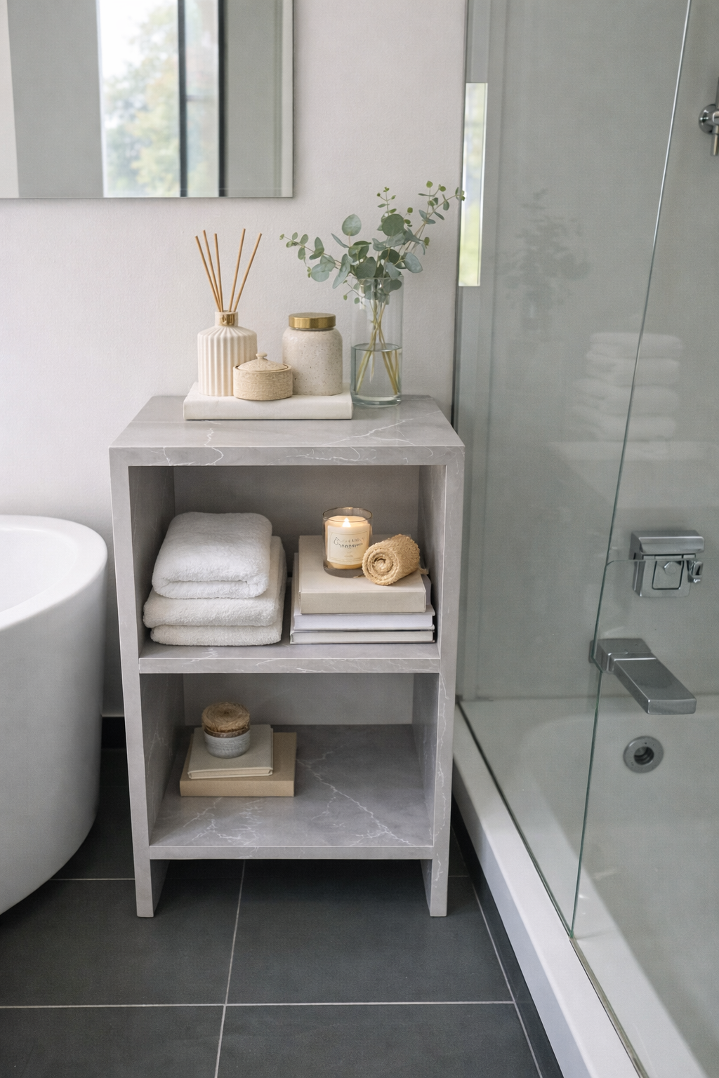 Szafka łazienkowa stojąca z kamienia (konglomeratu kwarcowego) to funkcjonalny i elegancki element wyposażenia łazienki, wykonany z trwałego materiału o wysokiej odporności.
