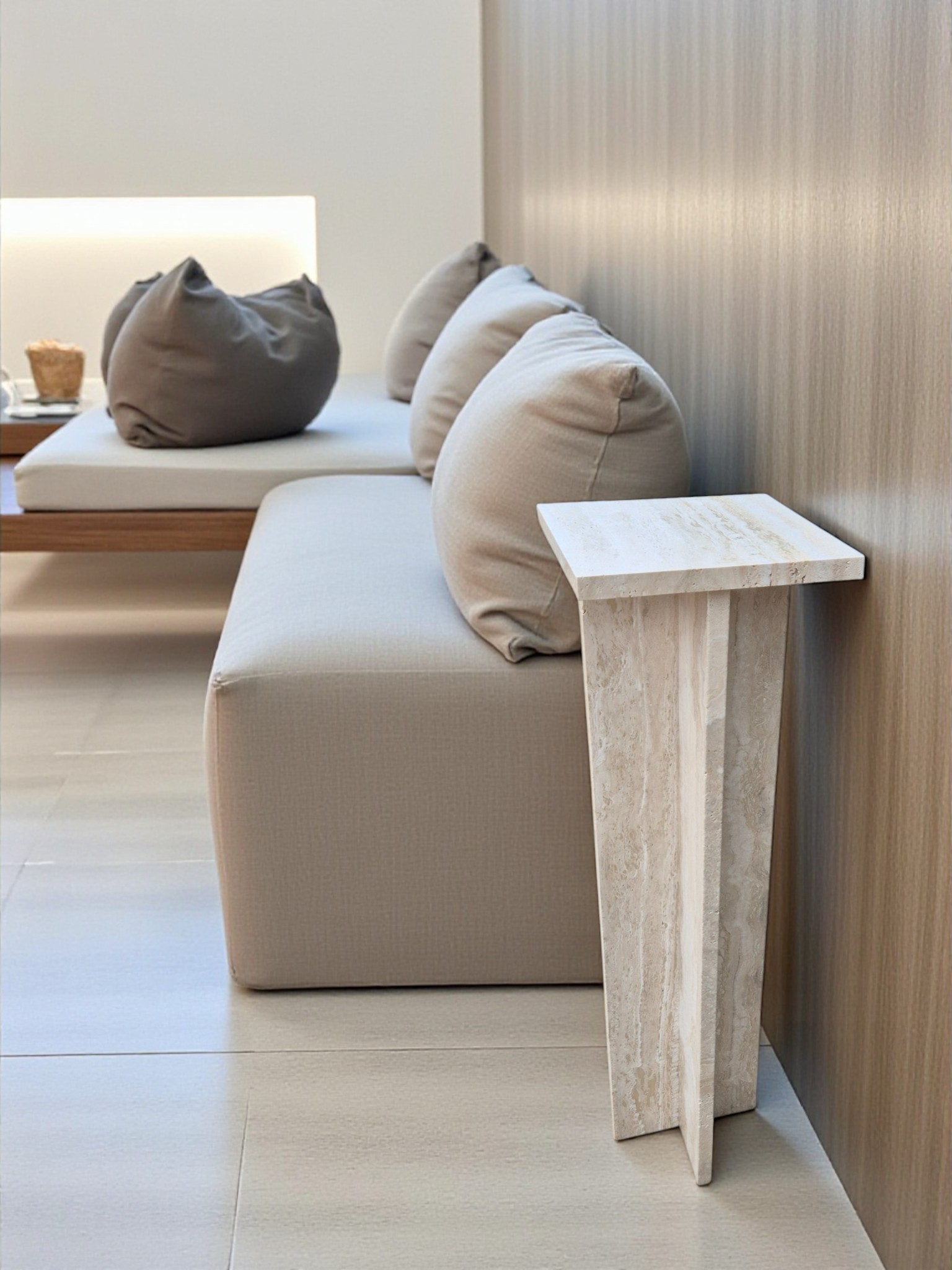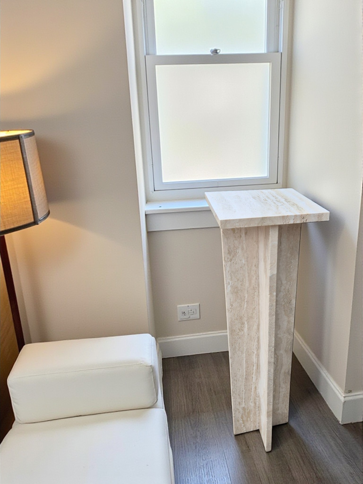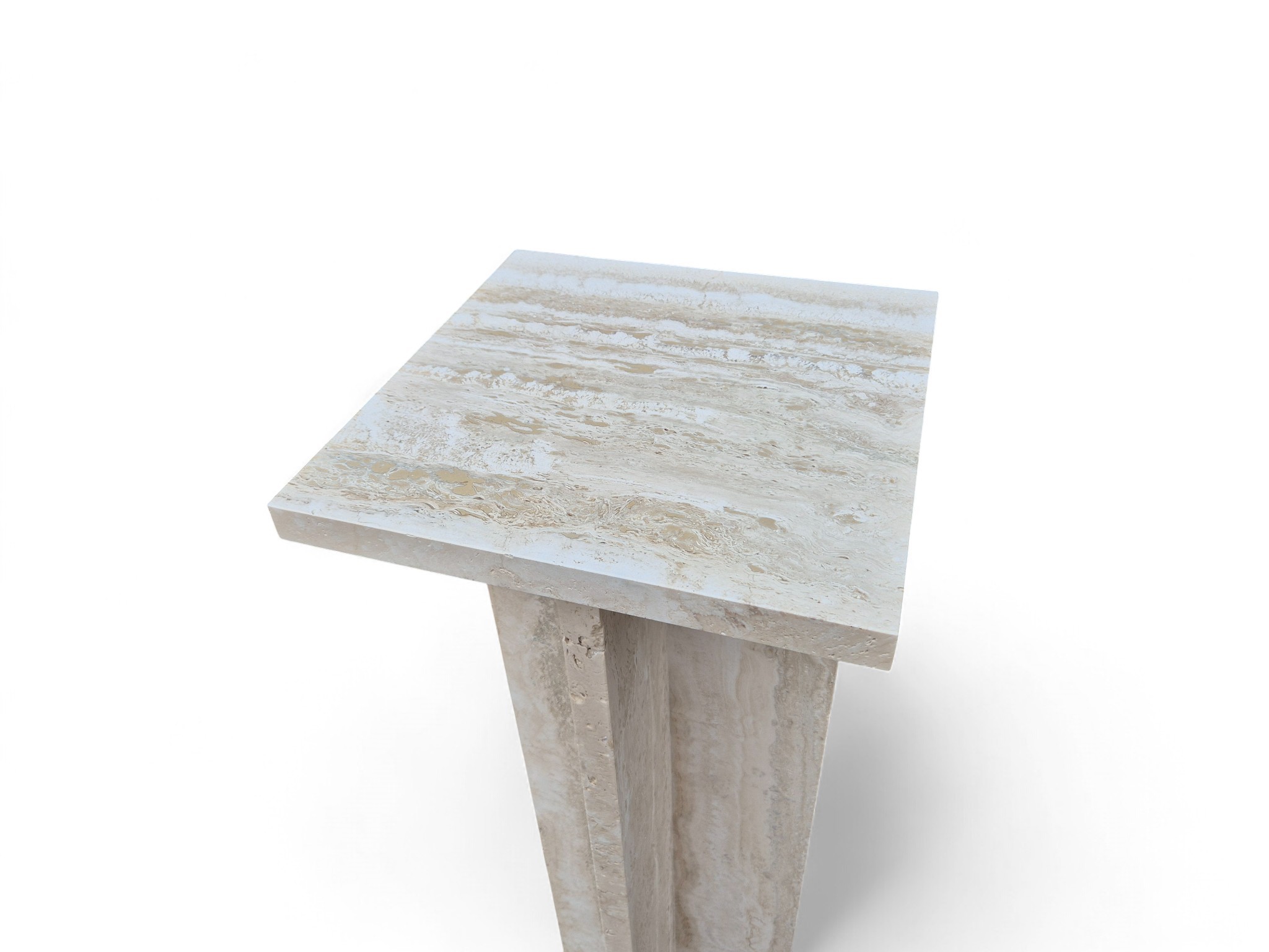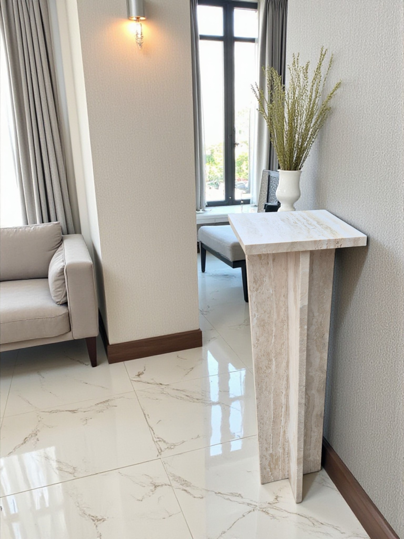 Postument z kamienia naturalnego trawertynu Romano Classico, charakteryzującego się ciepłymi odcieniami kremu i beżu. Smukła forma oraz matowe, szczotkowane wykończenie nadają produktowi ponadczasowy, architektoniczny charakter.