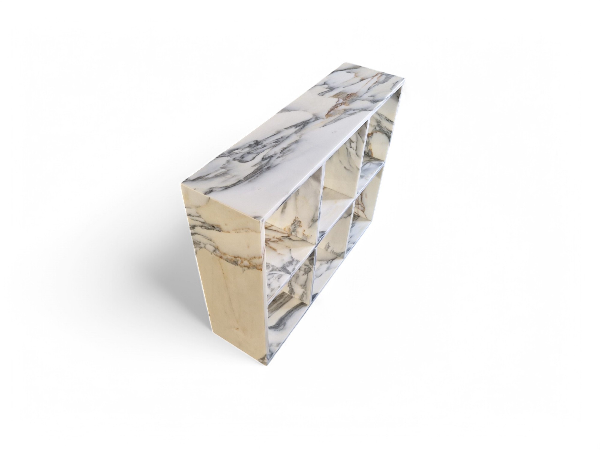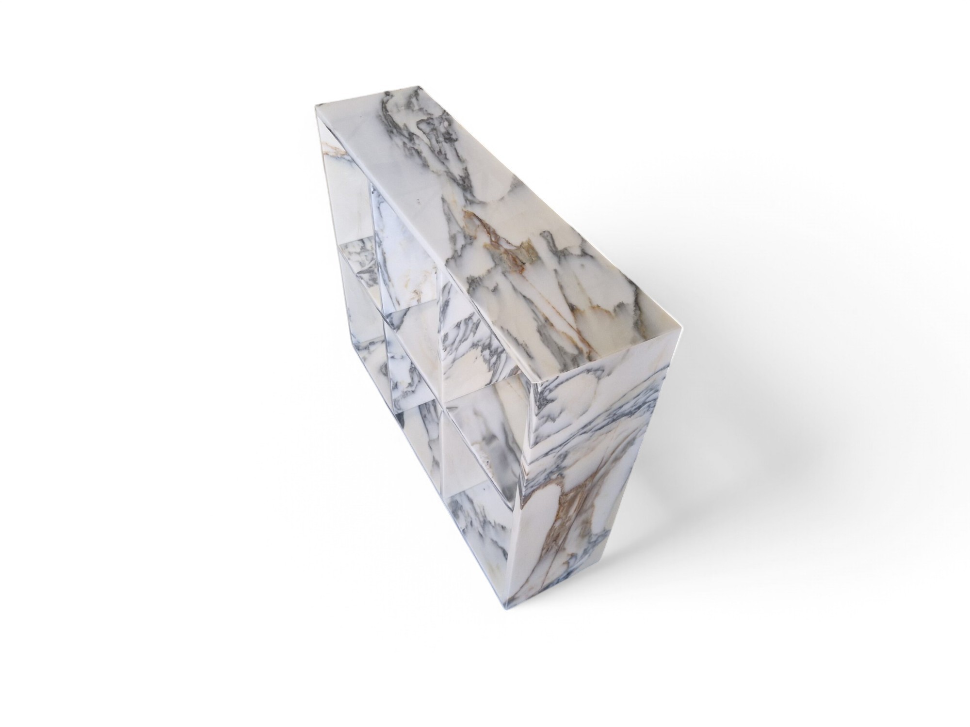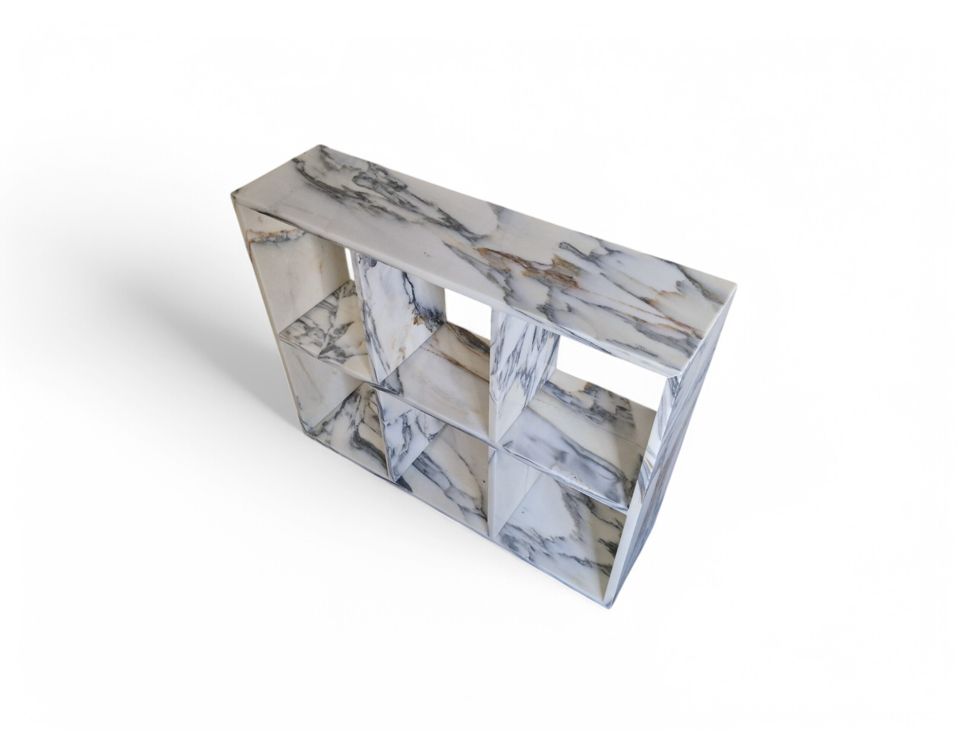 Regał na książki z marmuru Arabescato Corchia to elegancki i wyjątkowy element wyposażenia wnętrz, wykonany z naturalnego kamienia, doskonale sprawdzi się jako funkcjonalna i dekoracyjna bryła do ekspozycji książek oraz bibelotów.