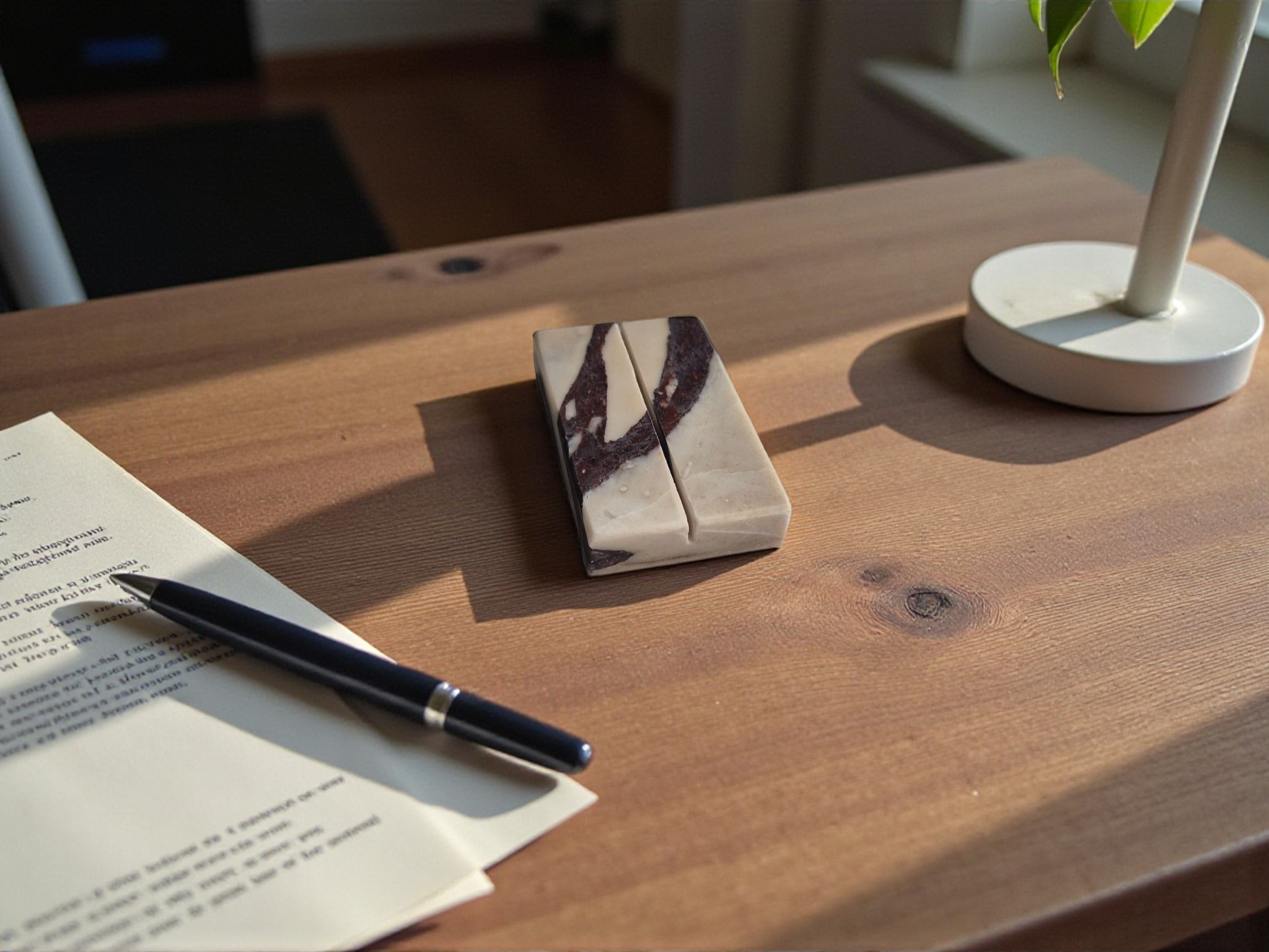 Stojak na wizytówkę z marmuru Calacatta Viola to elegancki element ekspozycyjny przeznaczony do prezentacji pojedynczej wizytówki lub karty informacyjnej.