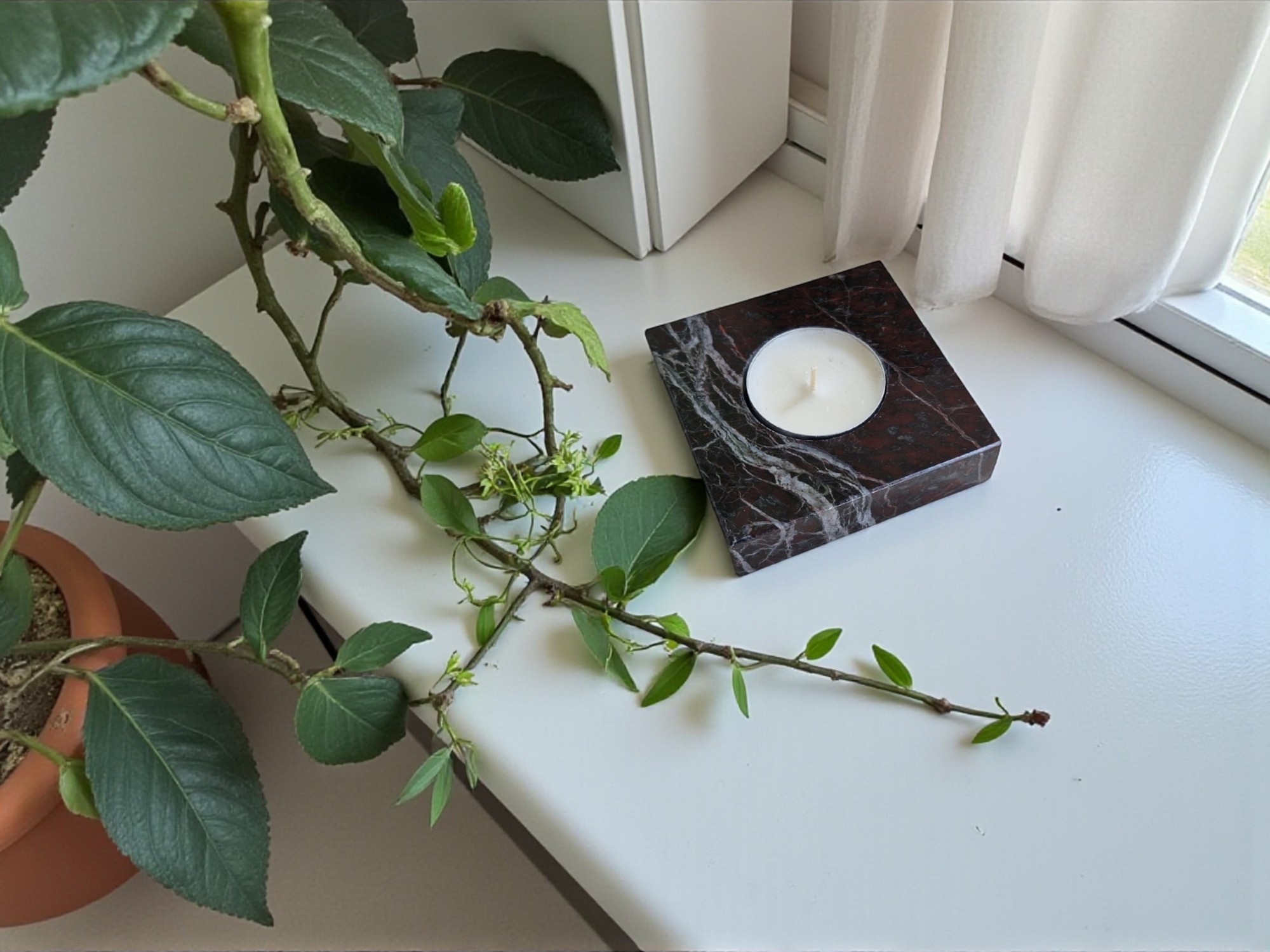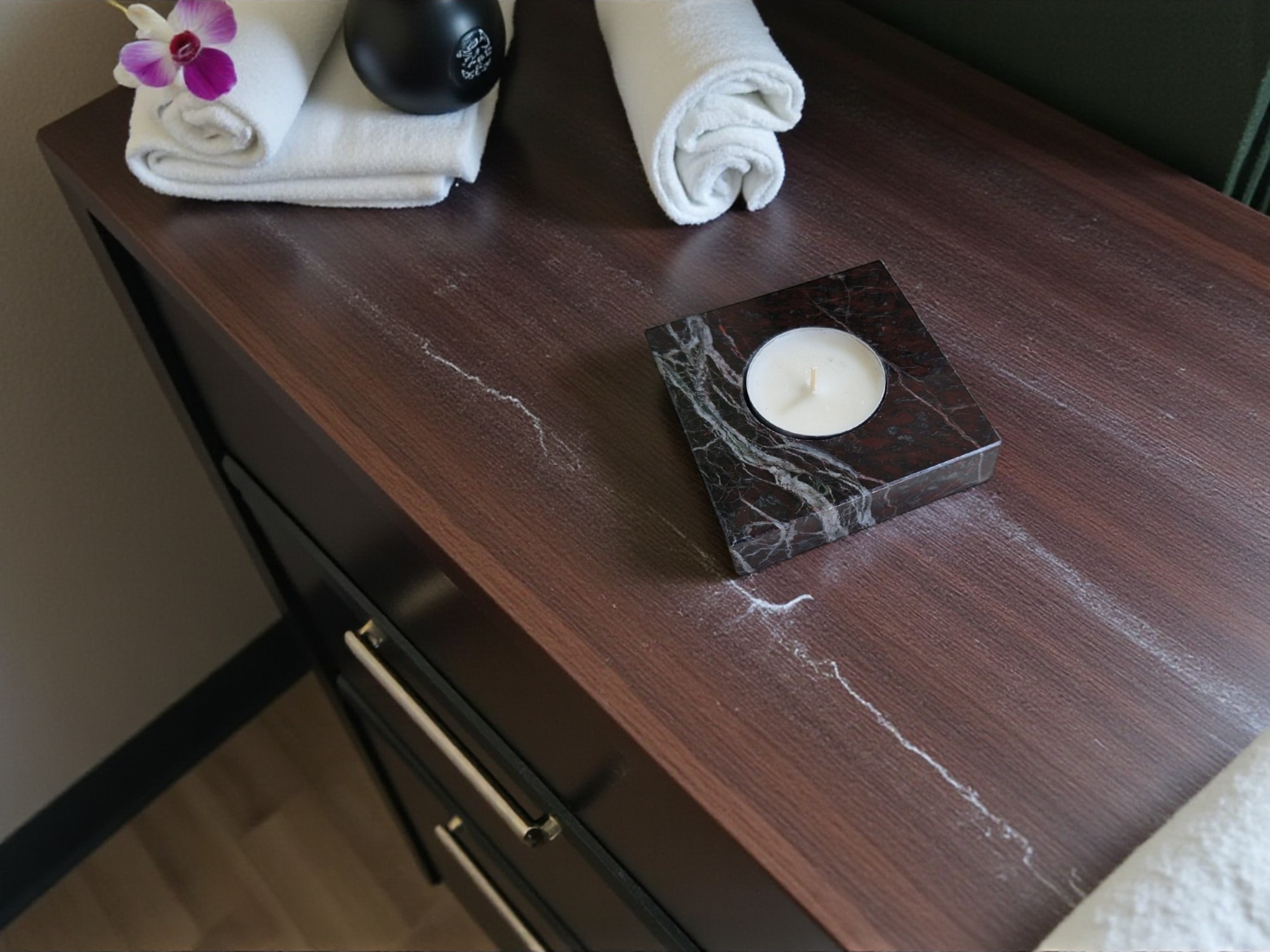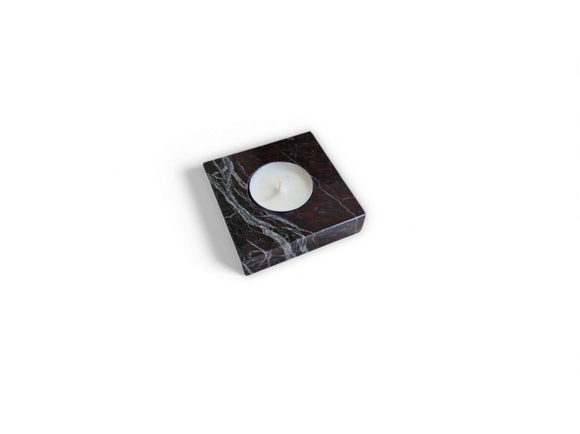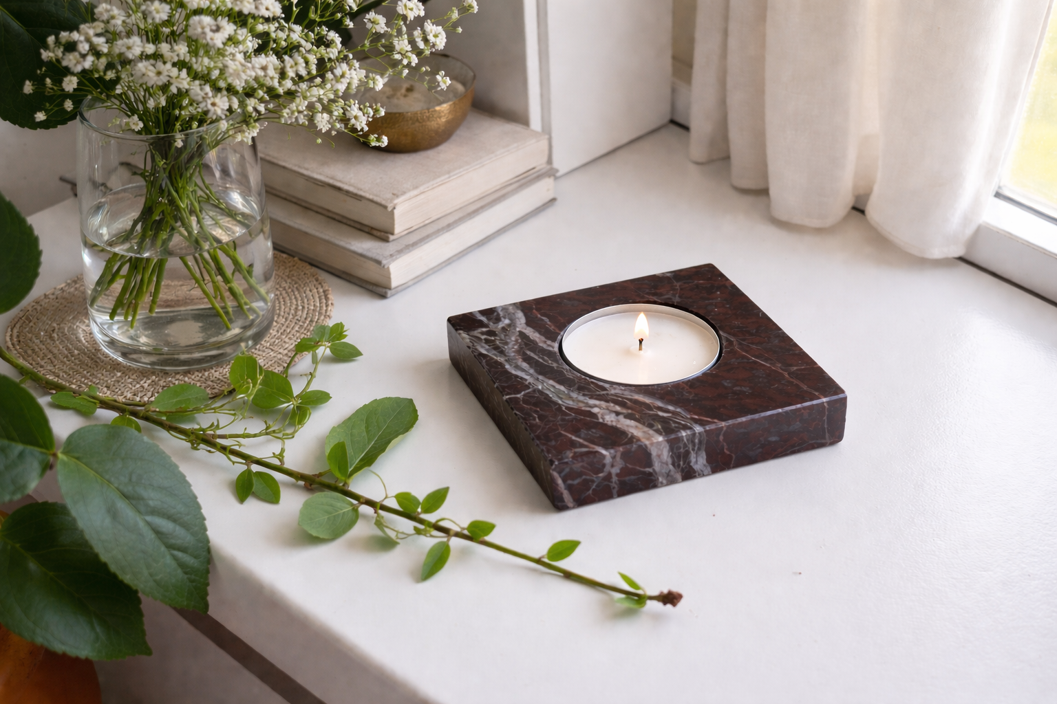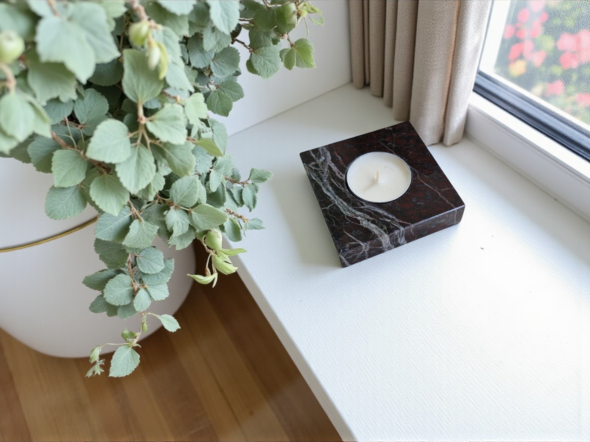 Świecznik z kamienia naturalnego Rosso Levanto to elegancki element dekoracyjny wykonany z marmuru o wyrazistej kolorystyce czerwieni, czerni i bieli.