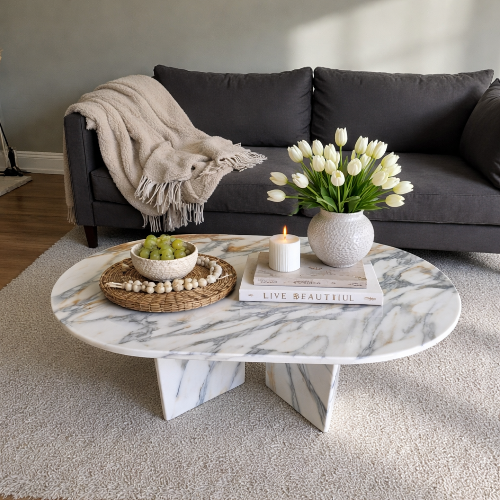 Stolik Arabescato Corchia kawowy owalny to wyjątkowy mebel wykonany z ekskluzywnego, rzadko spotykanego marmuru naturalnego.