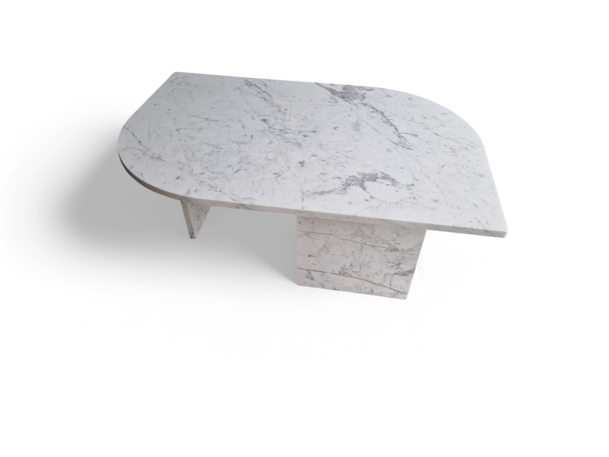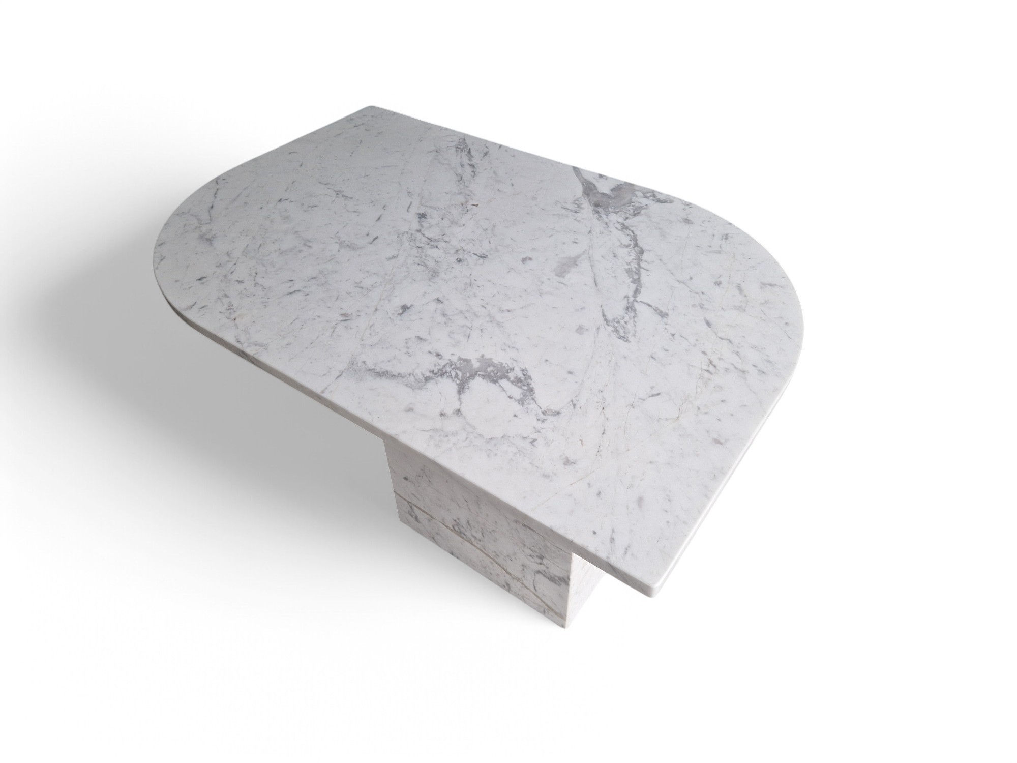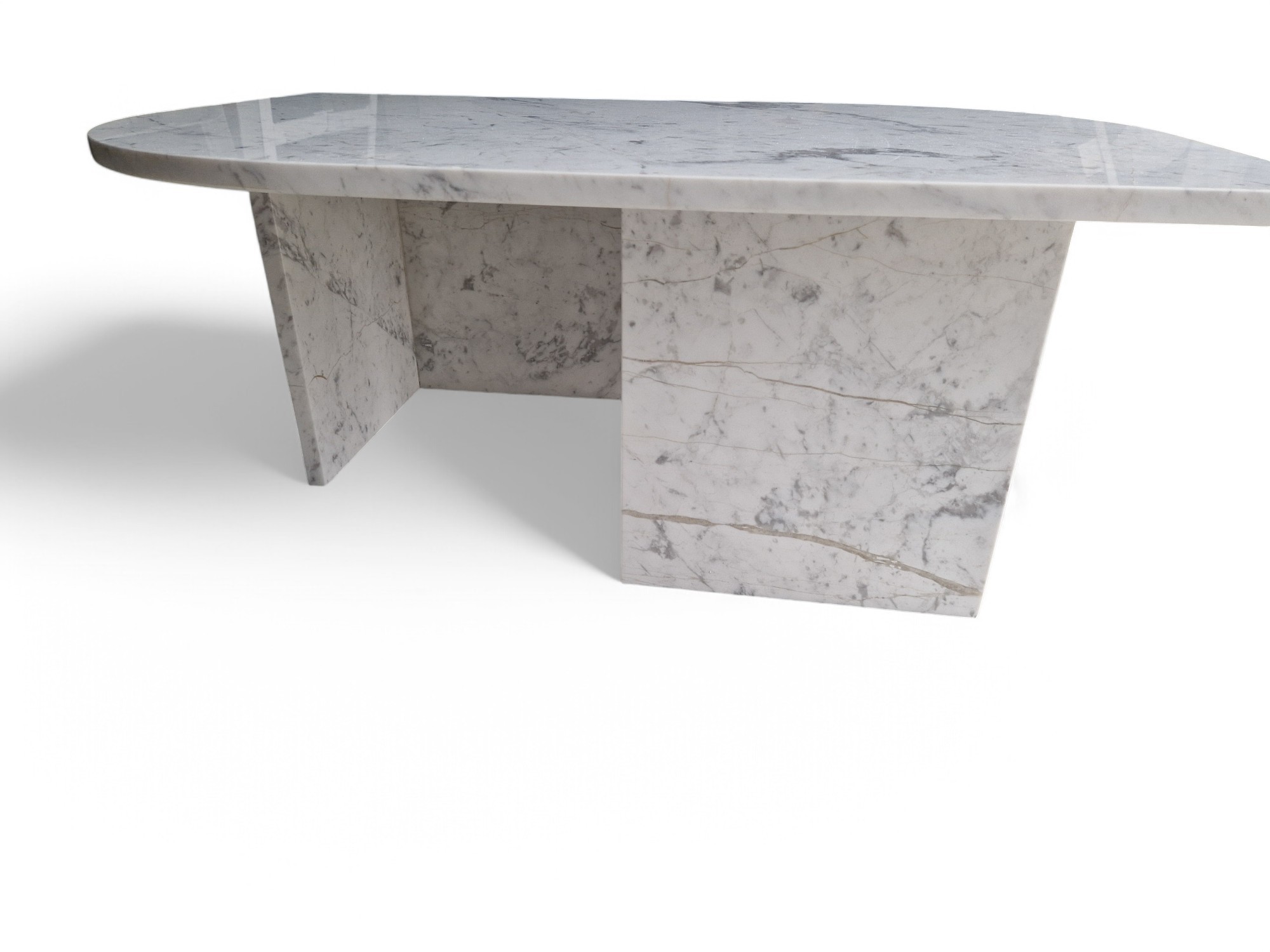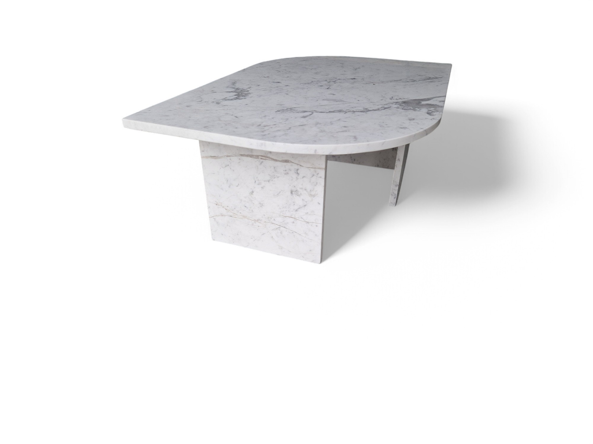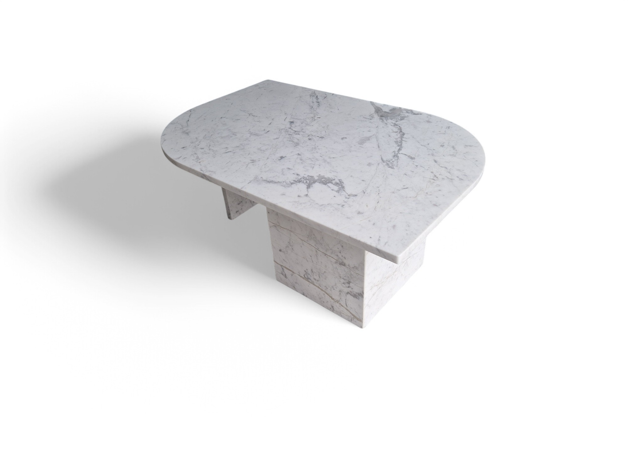 Biały stolik półowalny z marmuru Pirgon to elegancki i nowoczesny mebel wykonany z naturalnego kamienia pochodzącego z Włoch. Jasna kolorystyka z charakterystycznymi, nieregularnymi szarymi żyłkami nadaje stolikowi lekkości, a jednocześnie podkreśla unikatowy charakter marmuru.