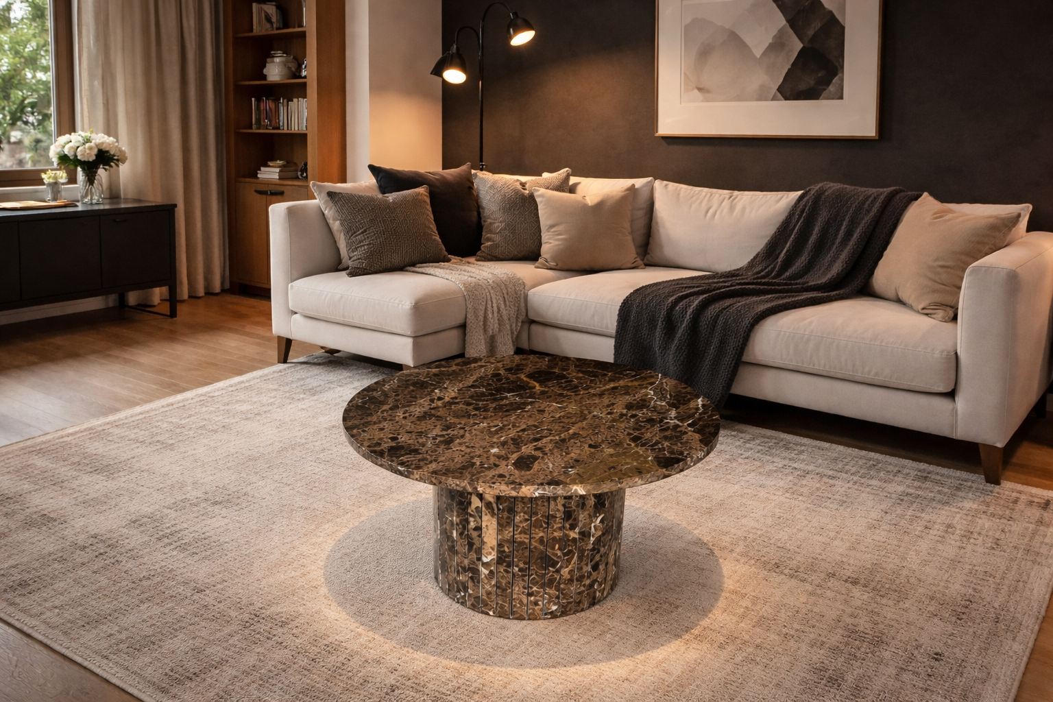 Brązowy stolik kawowy okrągły w stylu Japandi to elegancki i wyważony element aranżacji wnętrza, wykonany w całości z naturalnego marmuru Emperador Dark.