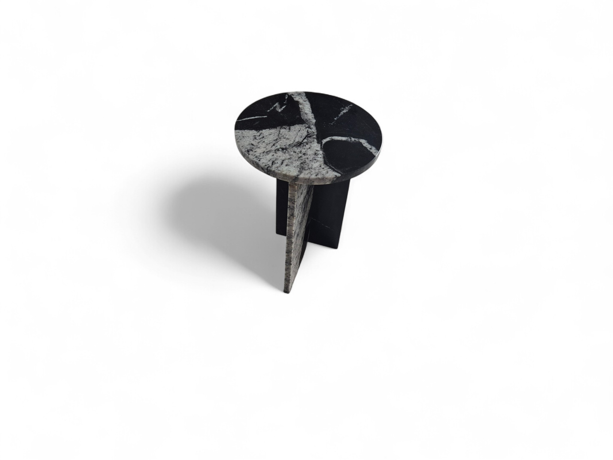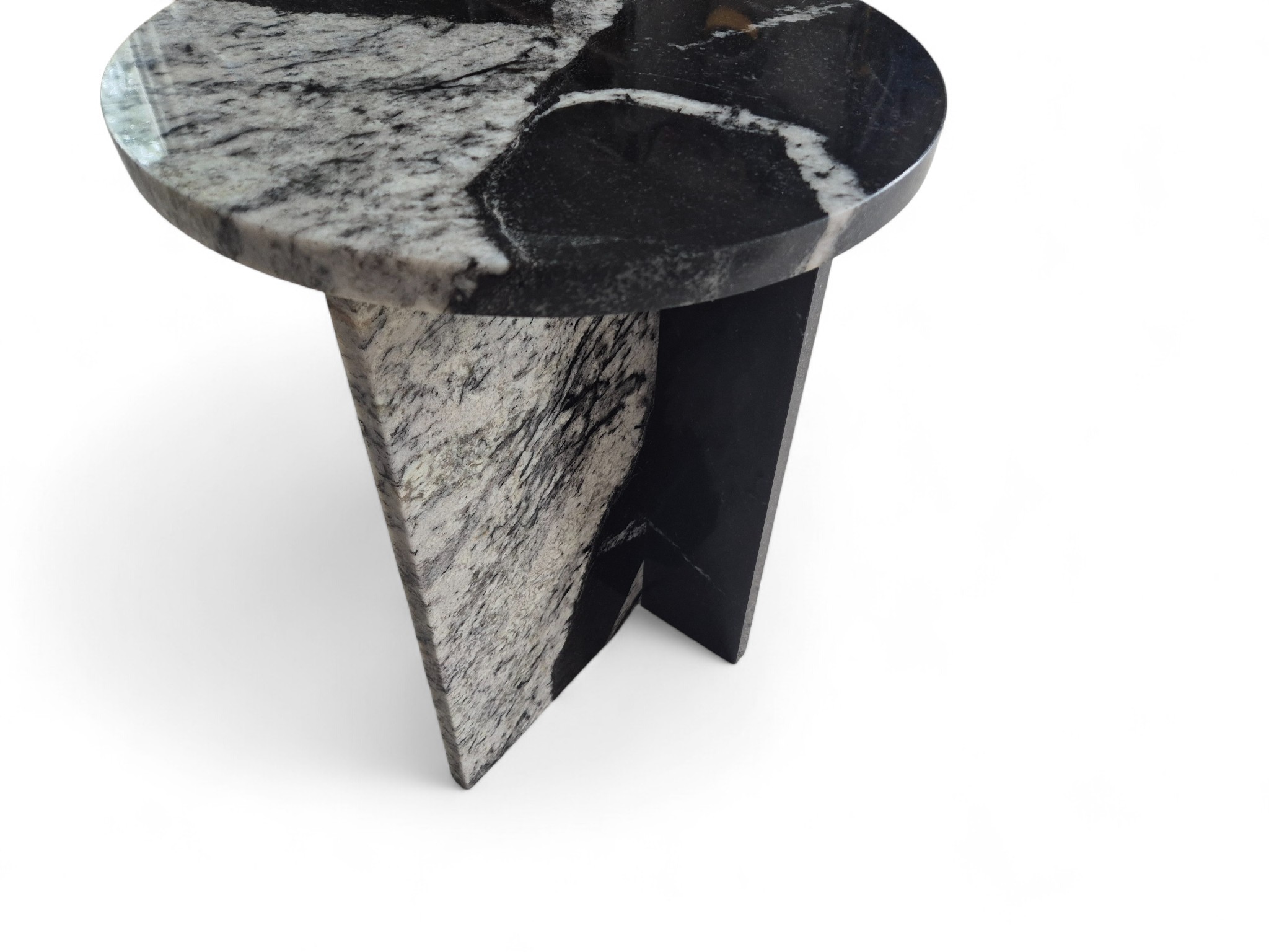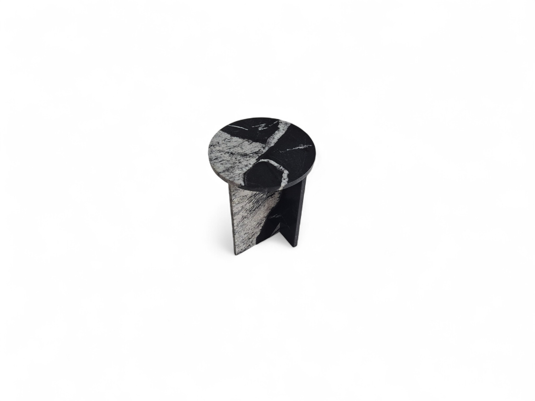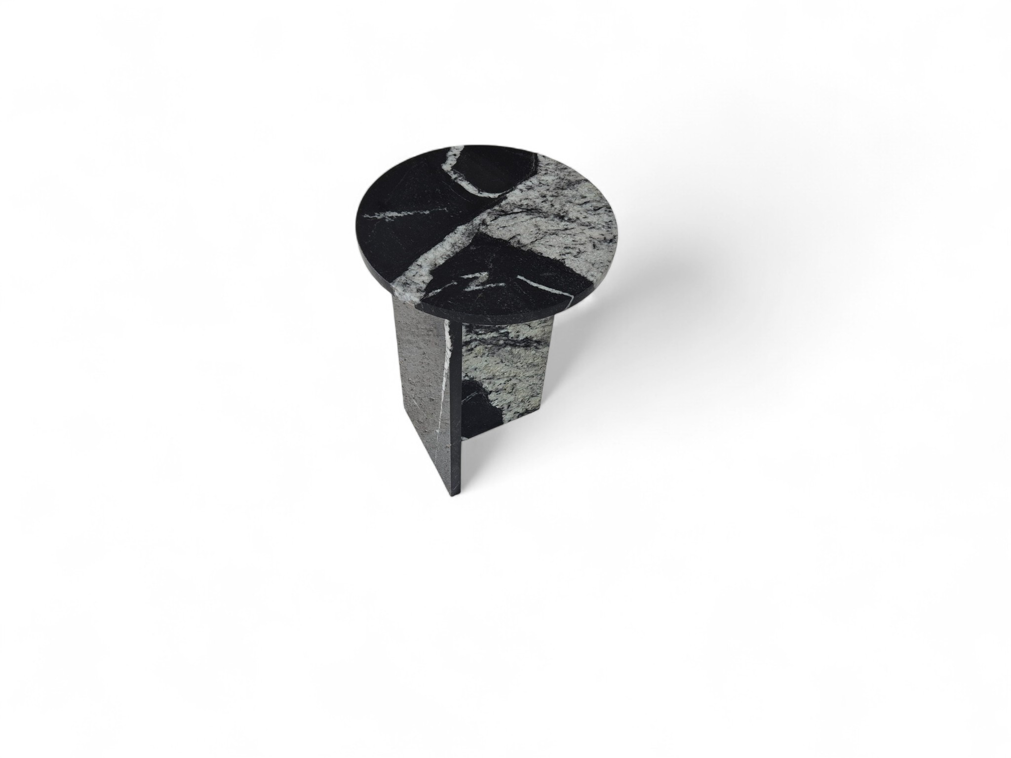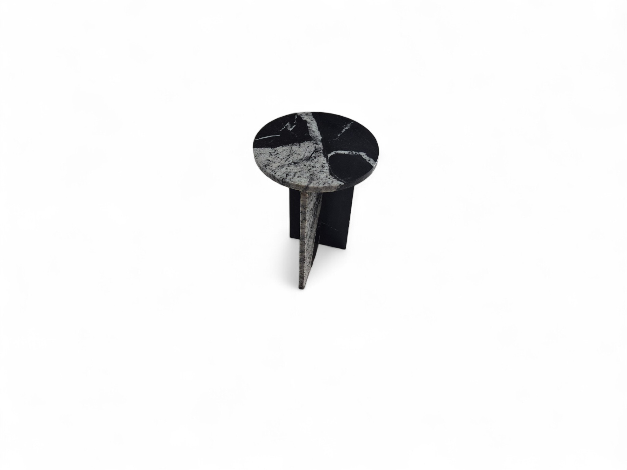 Granitowy stolik nocny Sky Fall, charakteryzujący się głęboką czernią przełamaną dynamicznymi, białymi akcentami. Okrągły blat o lustrzanym połysku oraz minimalistyczna podstawa w kształcie litery „T” nadają meblowi elegancki i nowoczesny charakter.