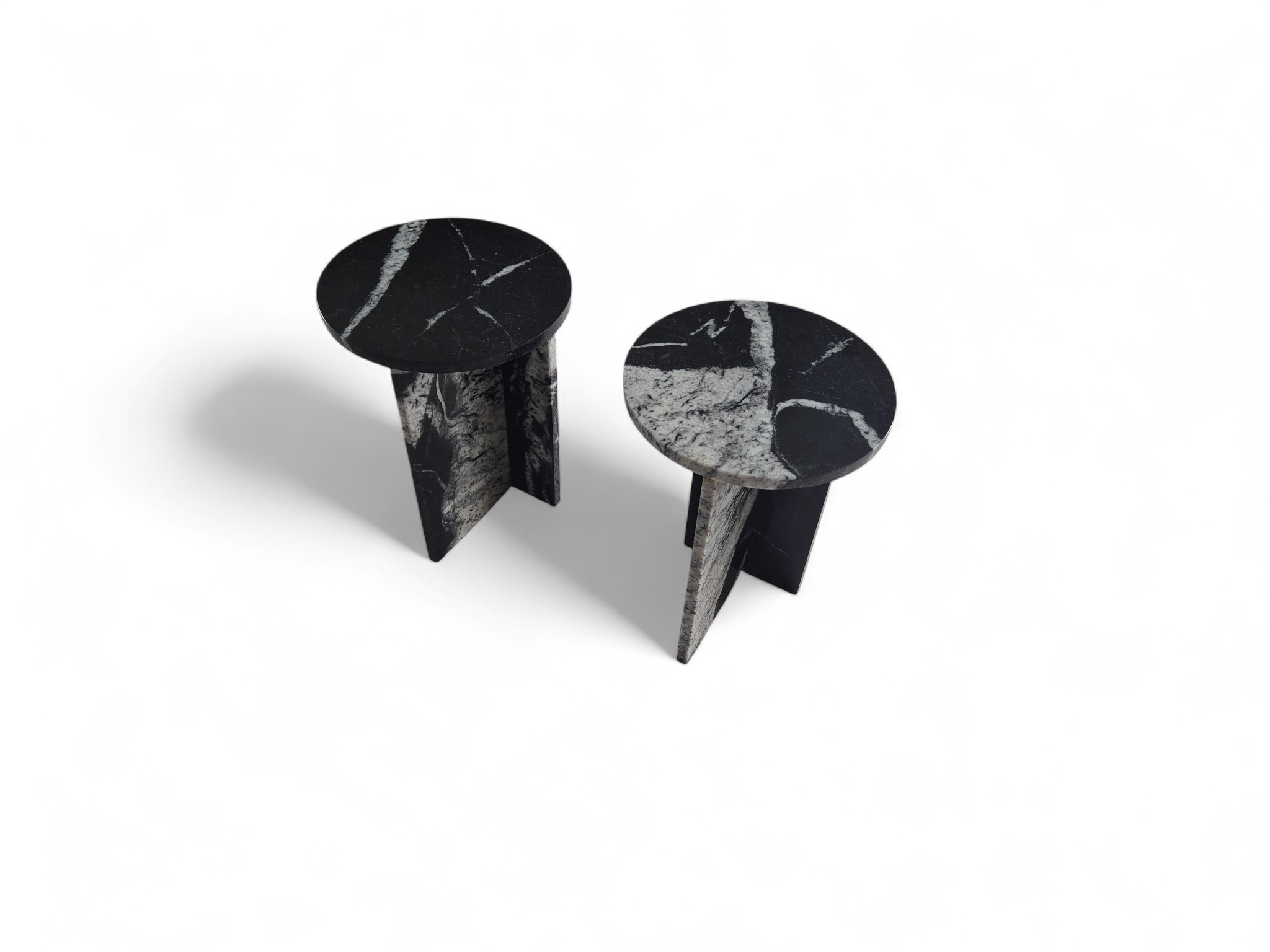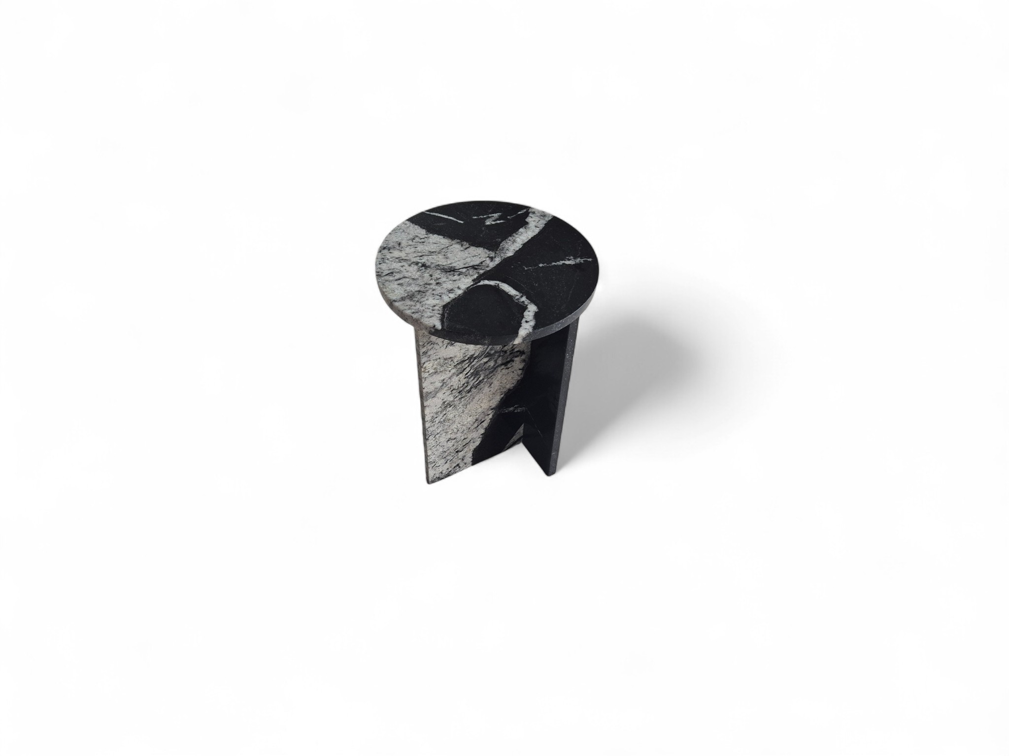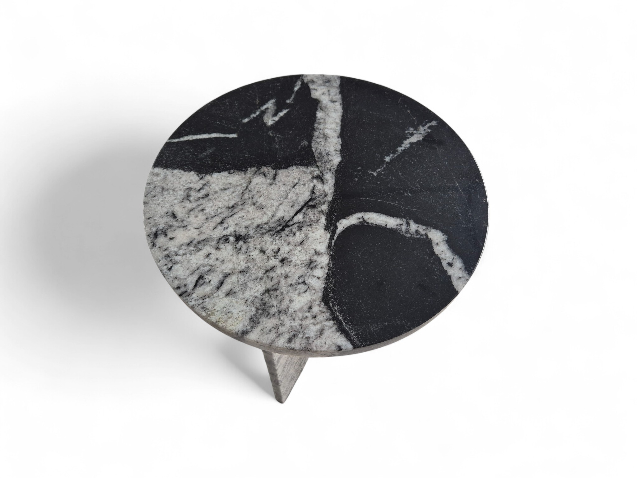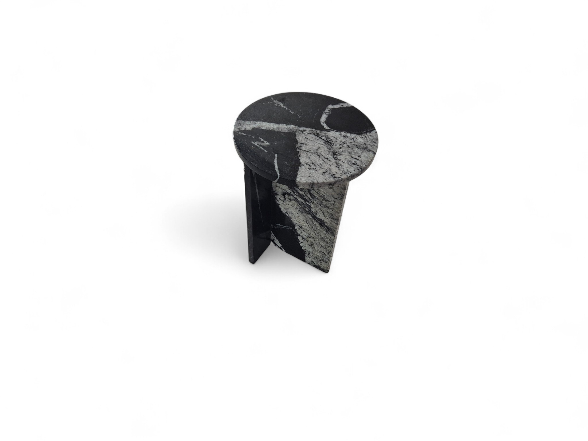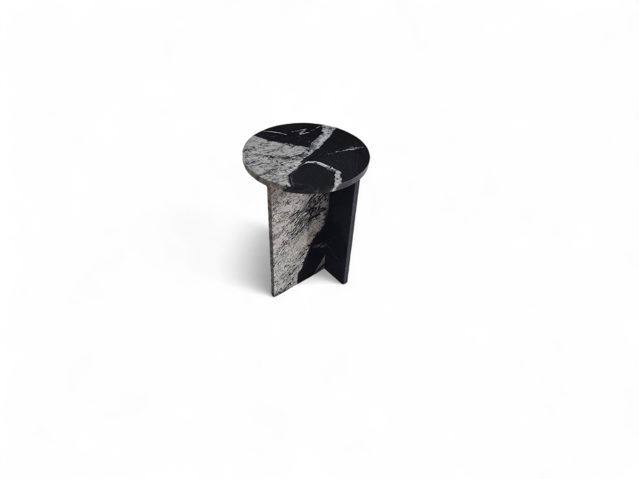 Granitowy stolik nocny Sky Fall, charakteryzujący się głęboką czernią przełamaną dynamicznymi, białymi akcentami. Okrągły blat o lustrzanym połysku oraz minimalistyczna podstawa w kształcie litery „T” nadają meblowi elegancki i nowoczesny charakter.