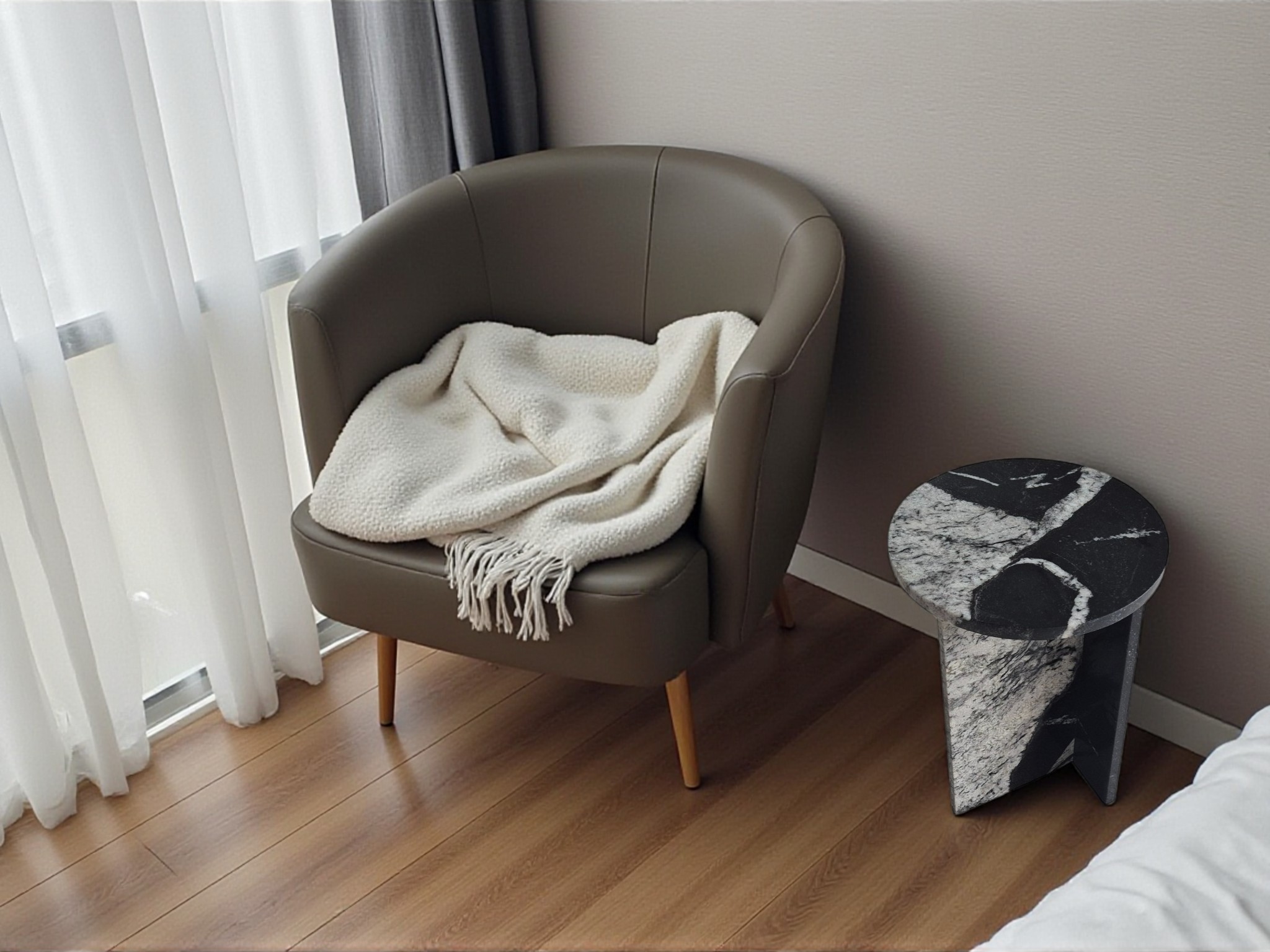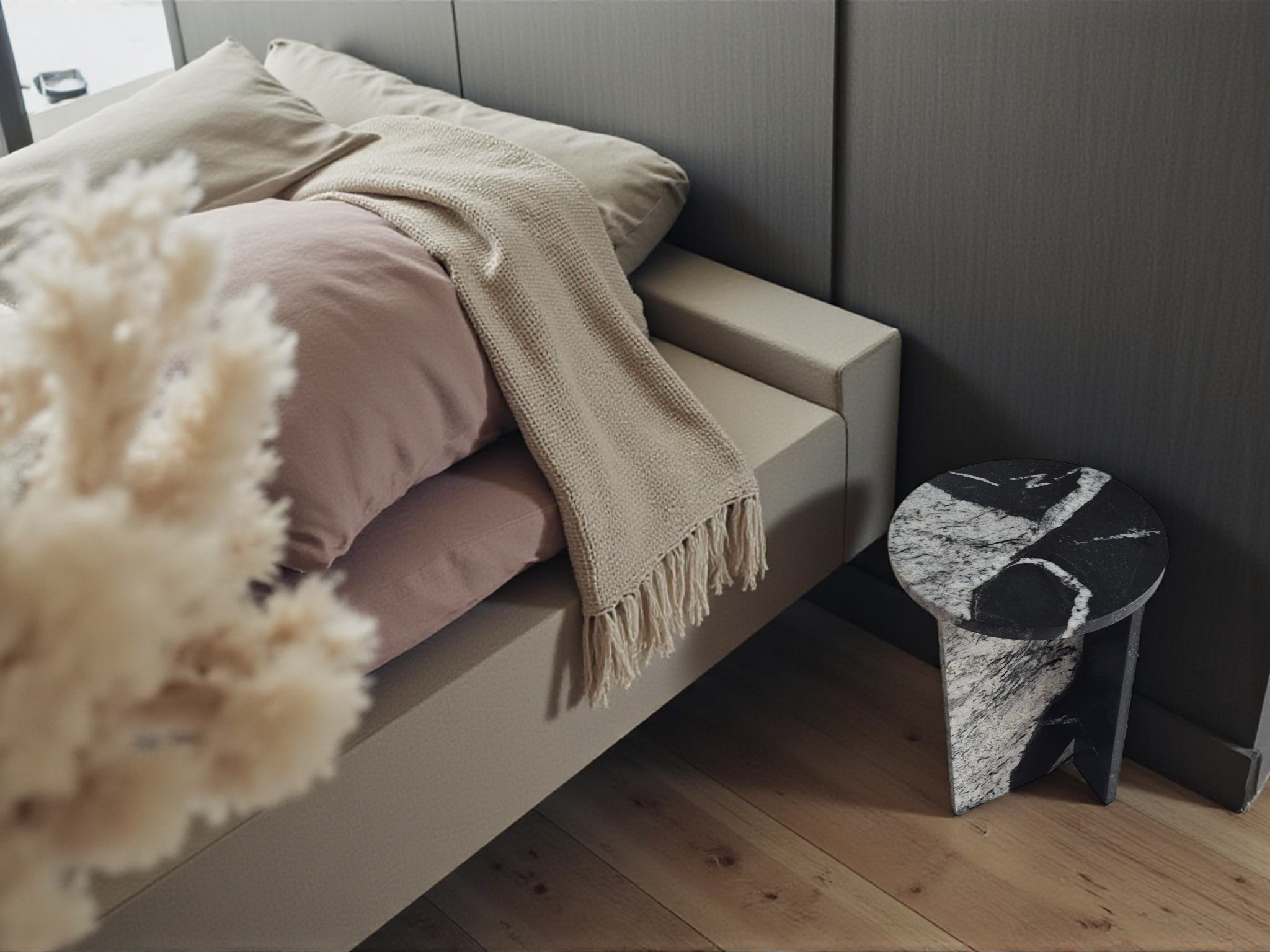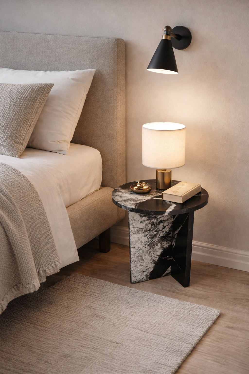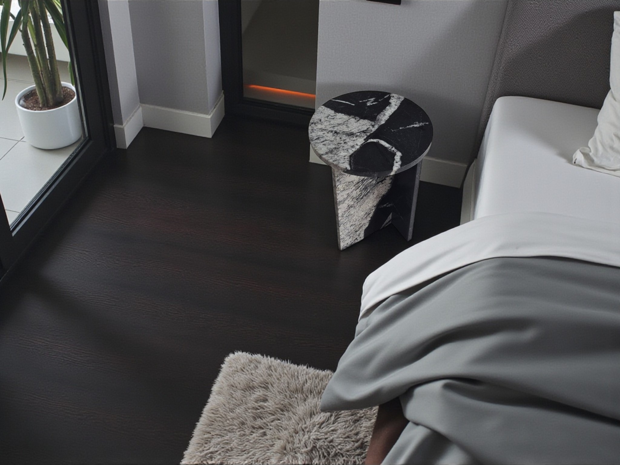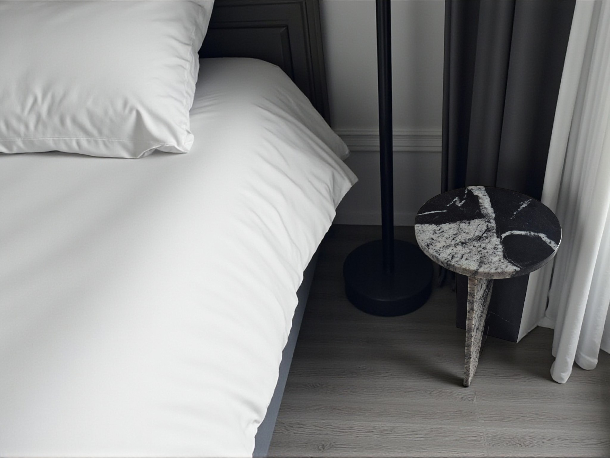 Granitowy stolik nocny Sky Fall, charakteryzujący się głęboką czernią przełamaną dynamicznymi, białymi akcentami. Okrągły blat o lustrzanym połysku oraz minimalistyczna podstawa w kształcie litery „T” nadają meblowi elegancki i nowoczesny charakter.