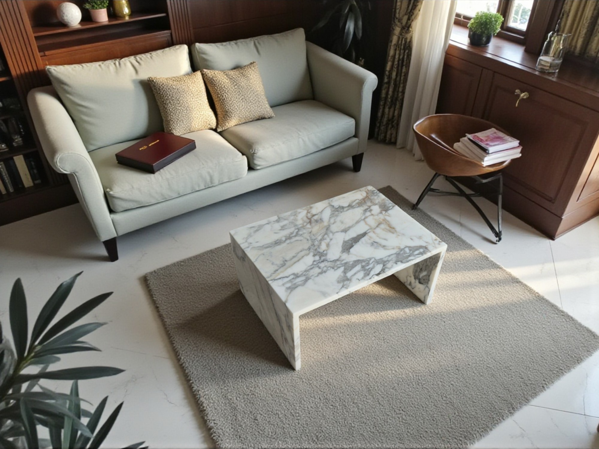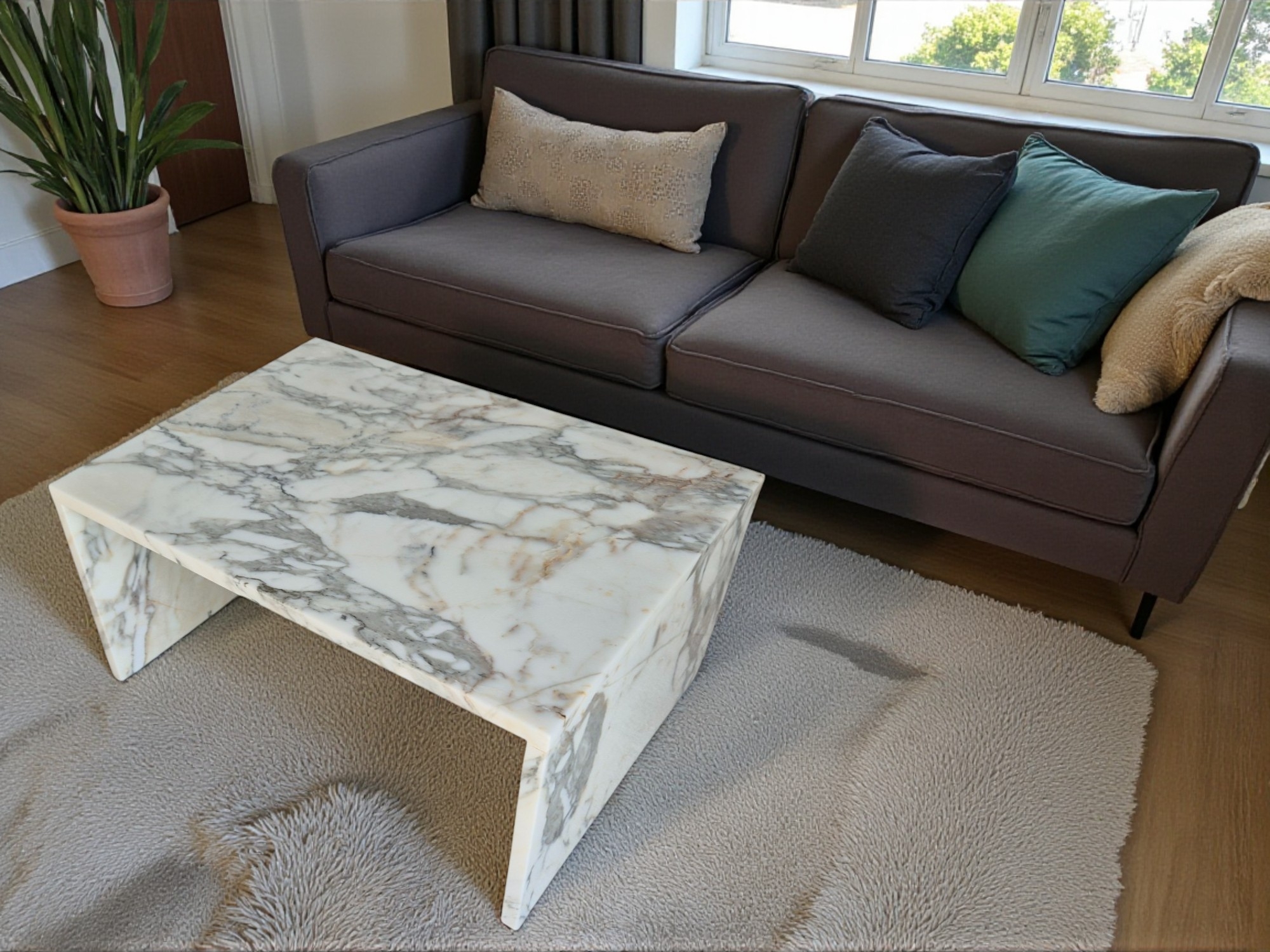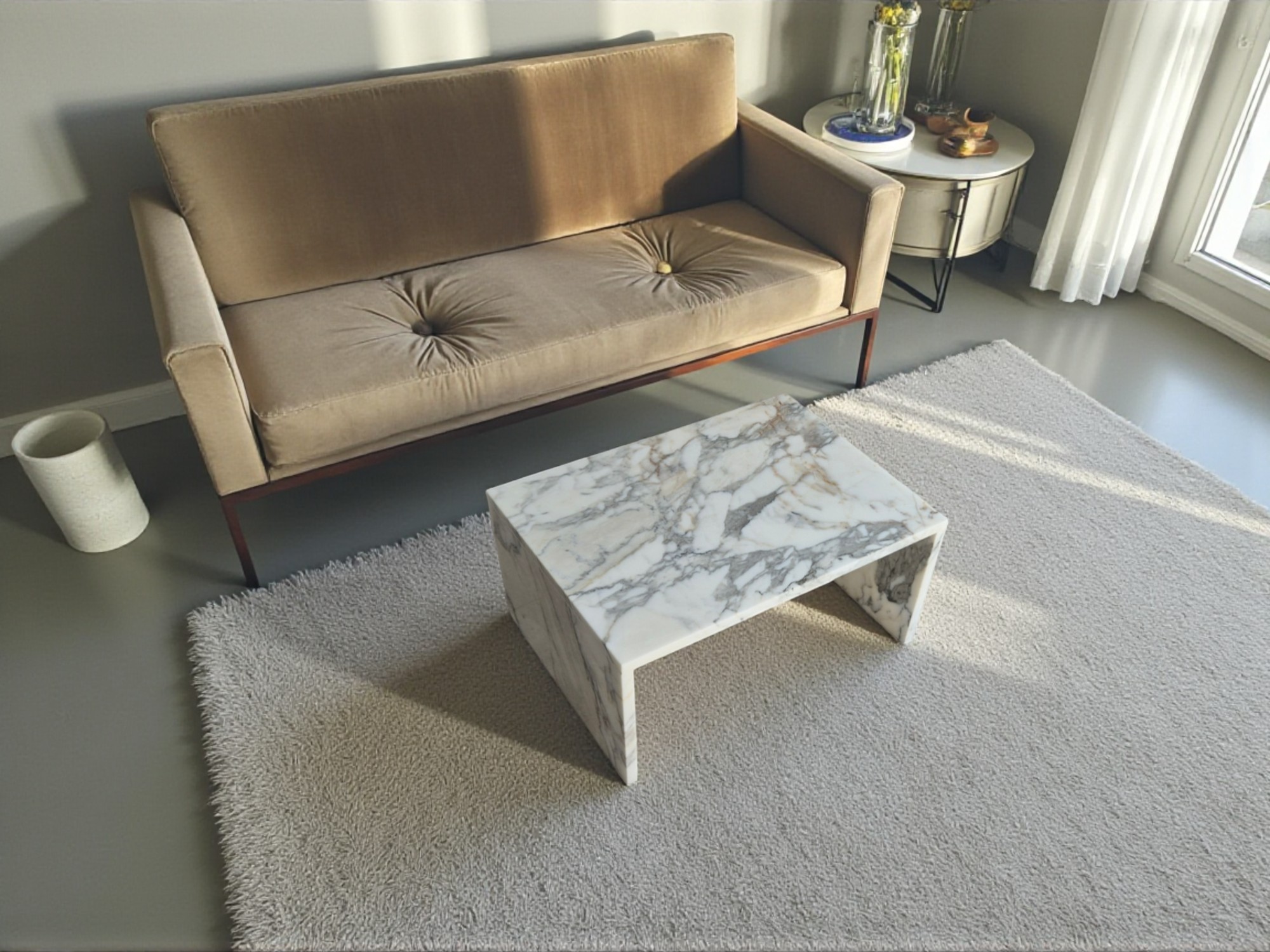 Ława z marmuru Arabescato Corchia to elegancki, dekoracyjny mebel wykonany z wyjątkowego marmuru o jasnej, mlecznobiałej tonacji z delikatnymi beżowymi i szarymi żyłkami.