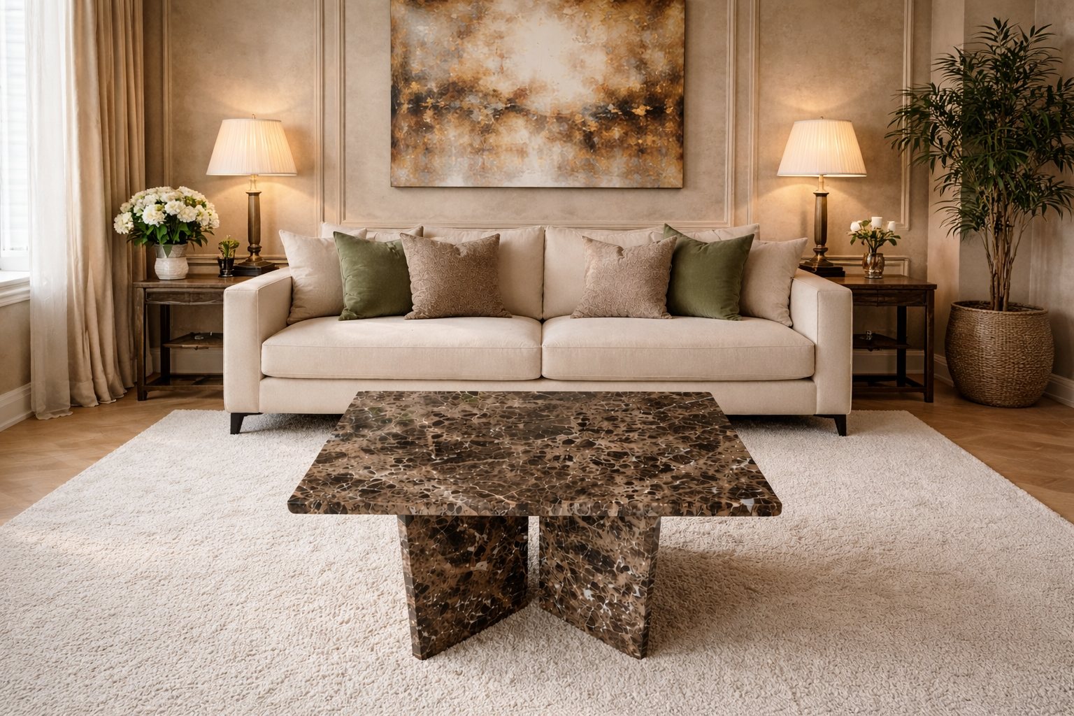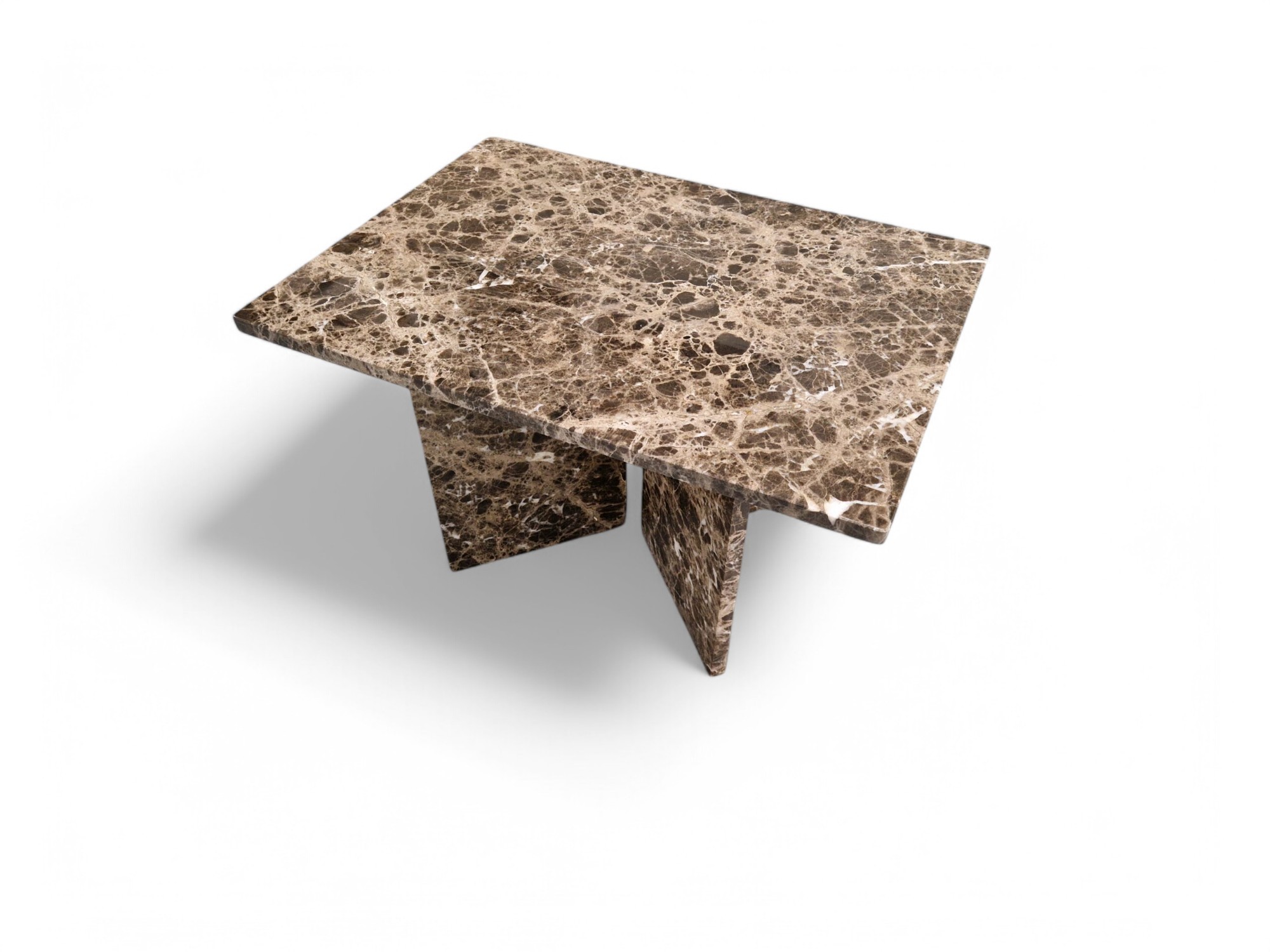 Prostokątny stolik z marmuru Emperador Dark to elegancki i masywny mebel wykonany z naturalnego kamienia o ciepłych, brązowych odcieniach. Prosta forma połączona z efektowną podstawą w kształcie litery V sprawia, że stolik doskonale odnajdzie się w salonie lub strefie wypoczynkowej.