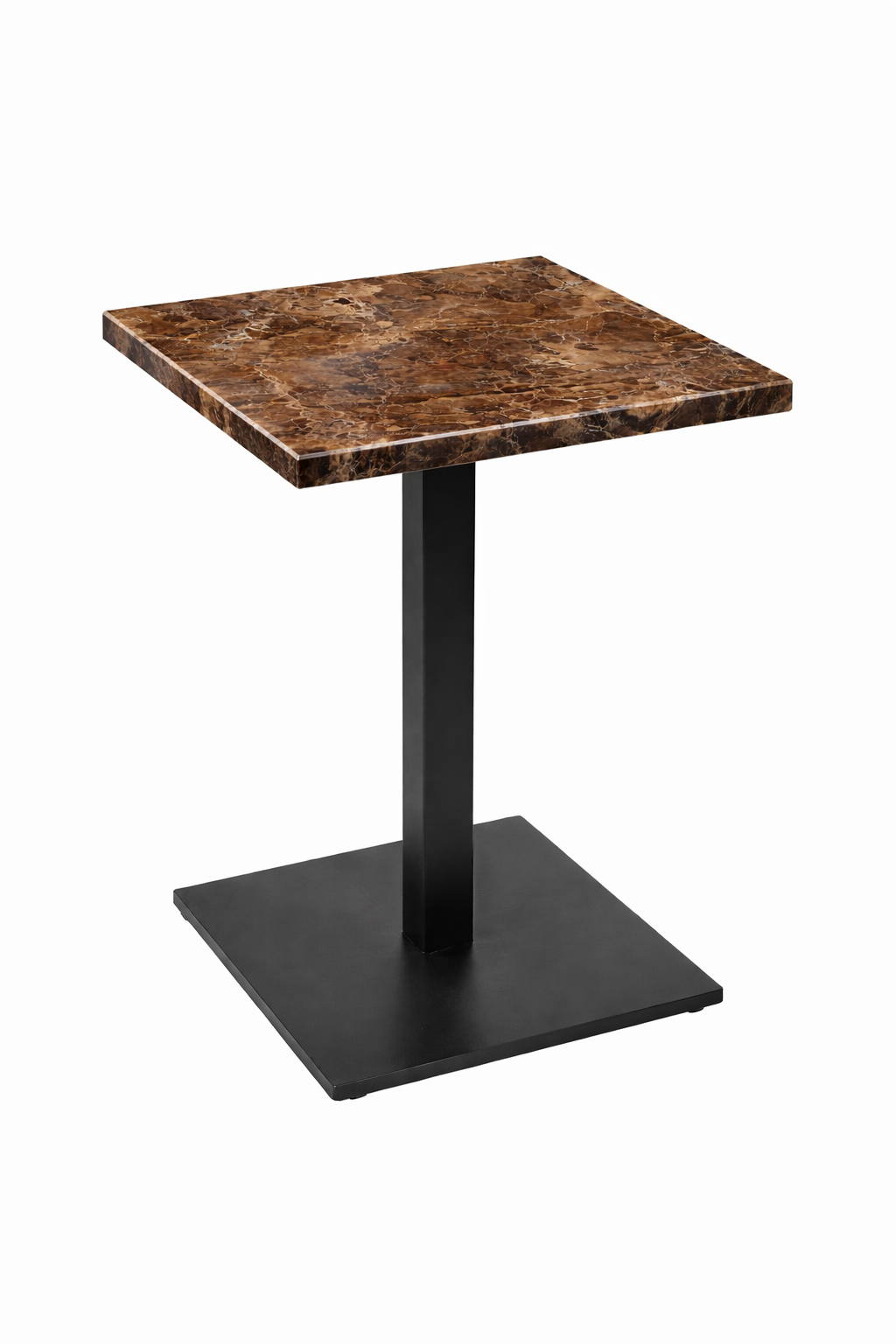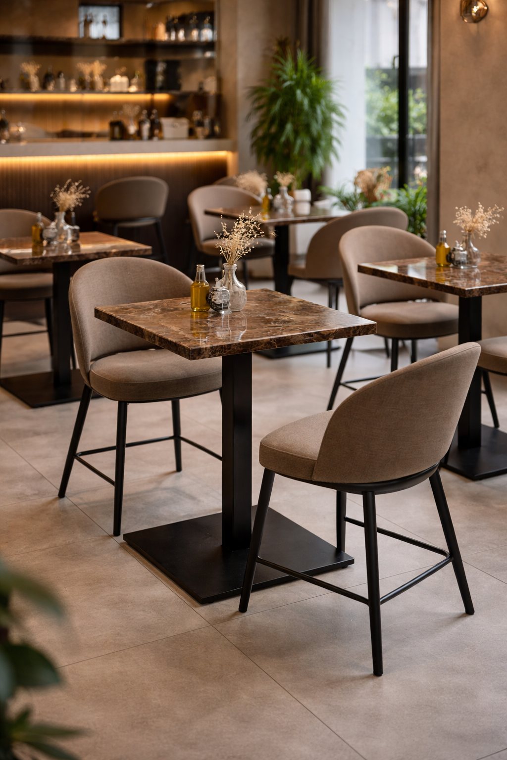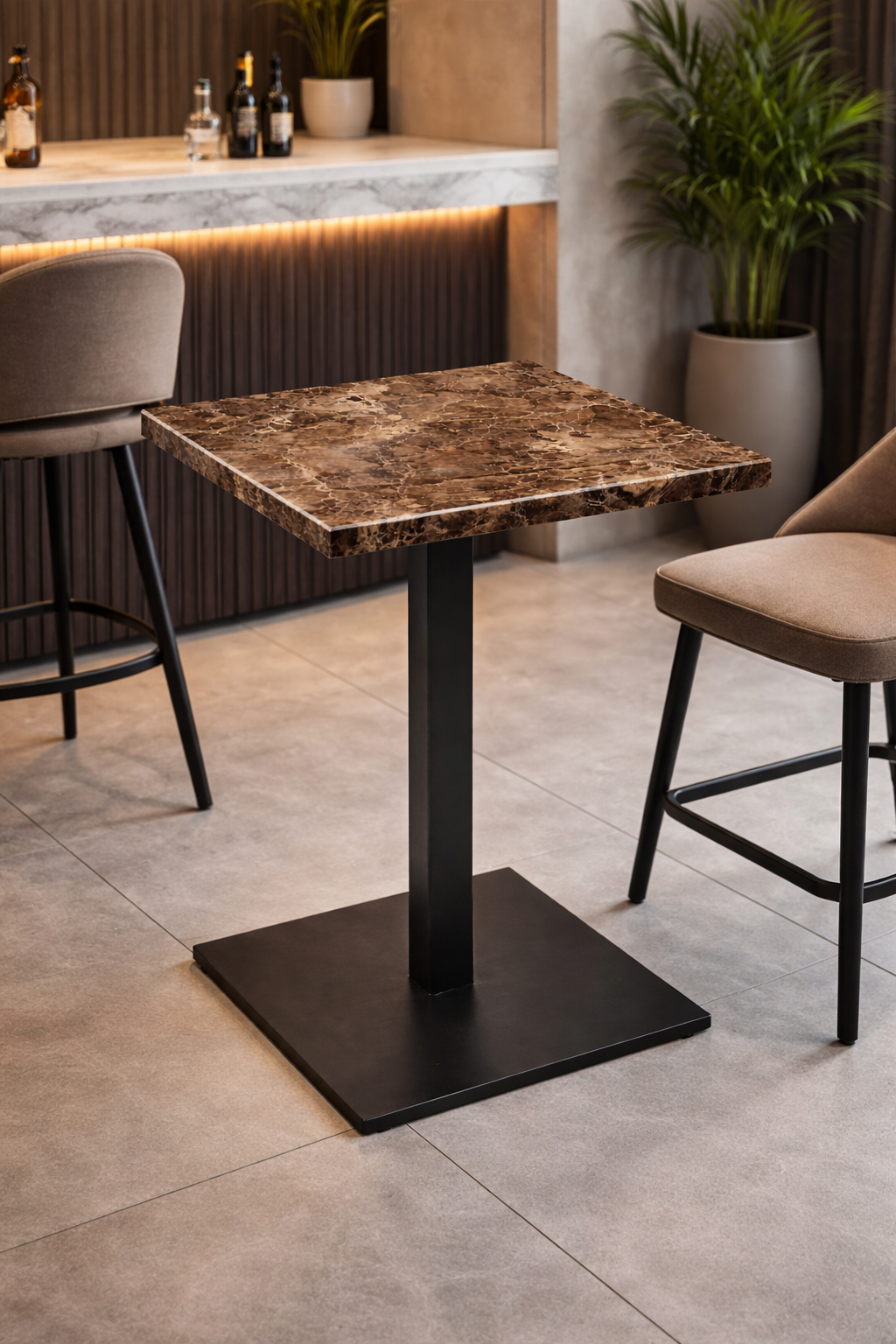 Stolik barowy z kamiennym blatem Emperador Dark to eleganckie i uniwersalne rozwiązanie do nowoczesnych wnętrz. Czekoladowo-brązowa kolorystyka z jasnym użyleniem oraz polerowana powierzchnia nadają mu luksusowy, ponadczasowy charakter. Solidna stalowa podstawa zapewnia stabilność i komfort codziennego użytkowania.