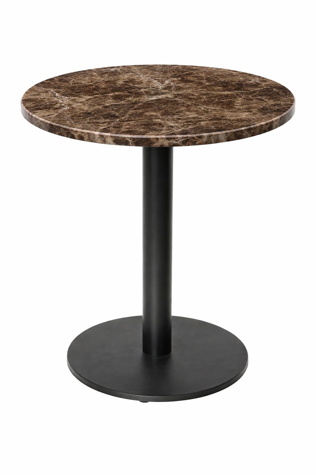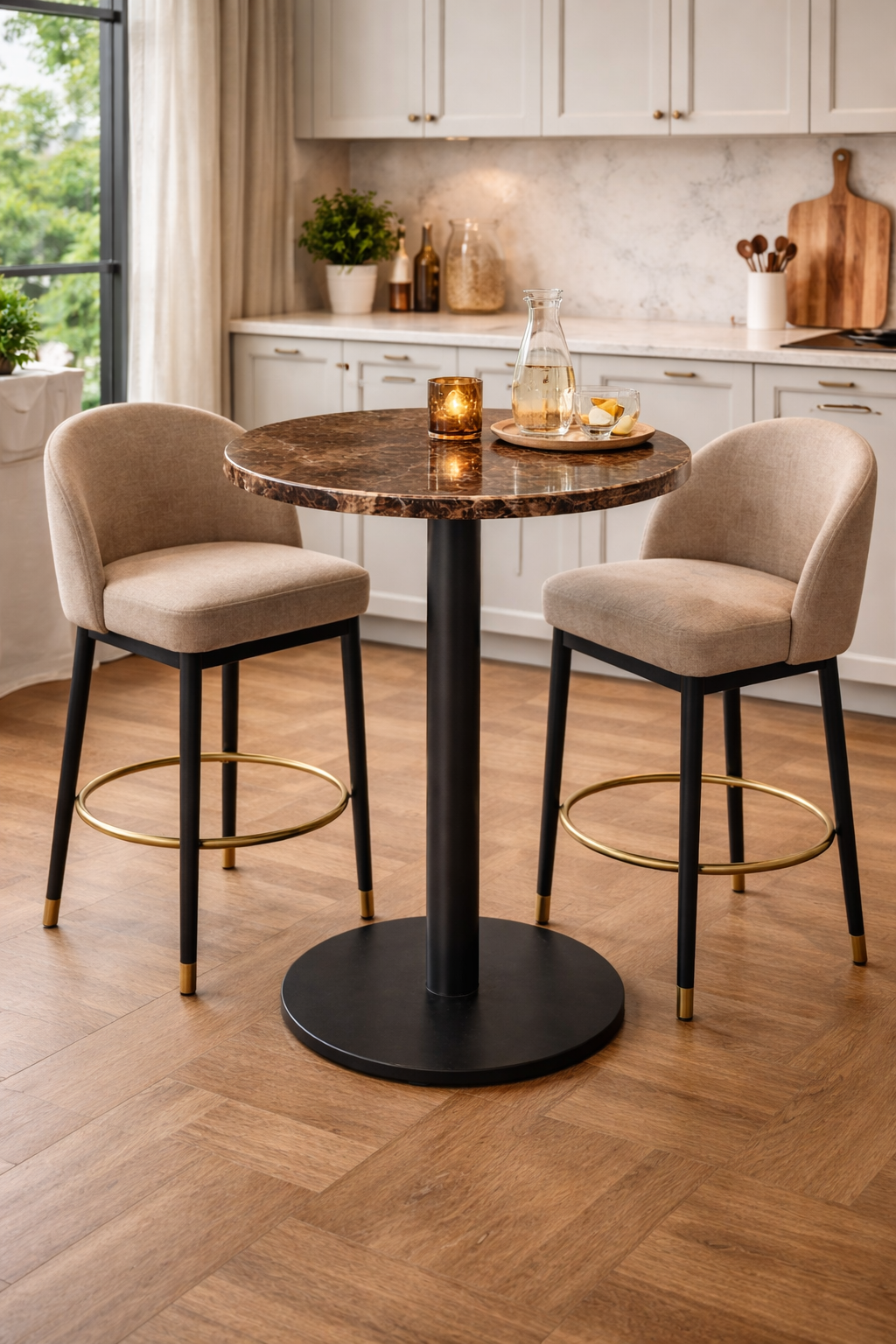 Stolik barowy marmurowy Emperador Dark to eleganckie połączenie naturalnego kamienia i nowoczesnej, stalowej podstawy. Czekoladowo-brązowe odcienie z jasnym użyleniem oraz polerowana powierzchnia nadają mu luksusowy, ponadczasowy charakter. Doskonale sprawdzi się w kuchni, jadalni lub strefie barowej we wnętrzach premium.