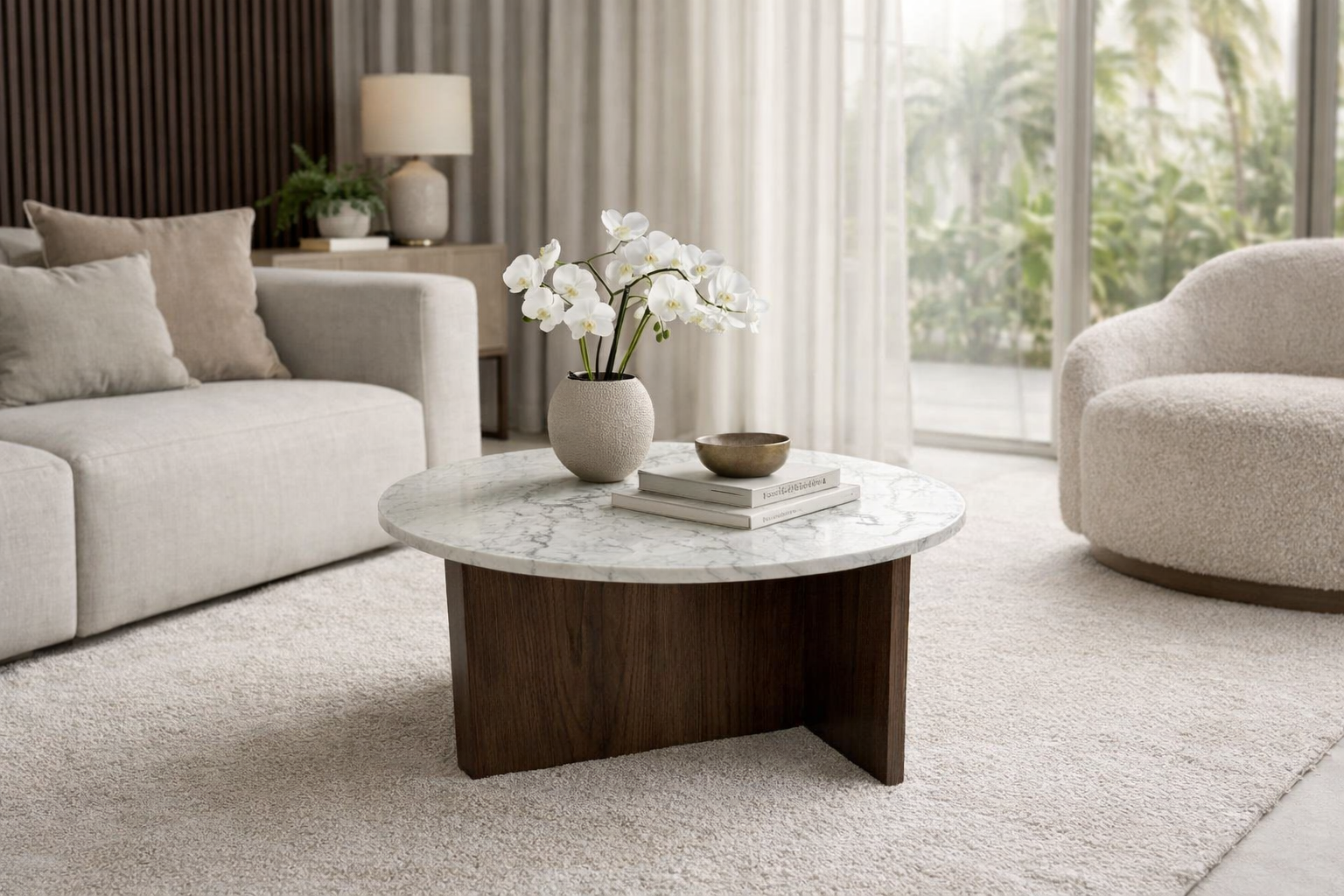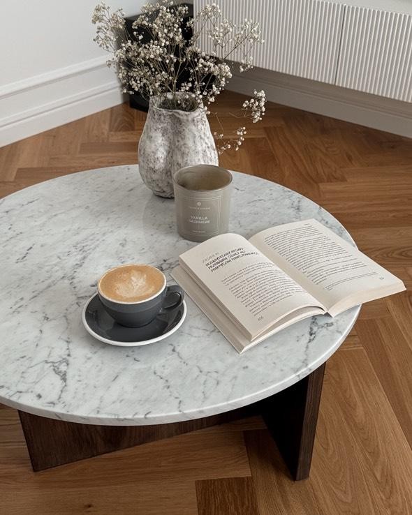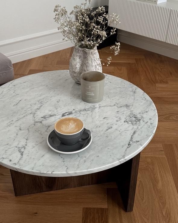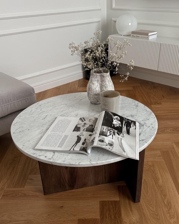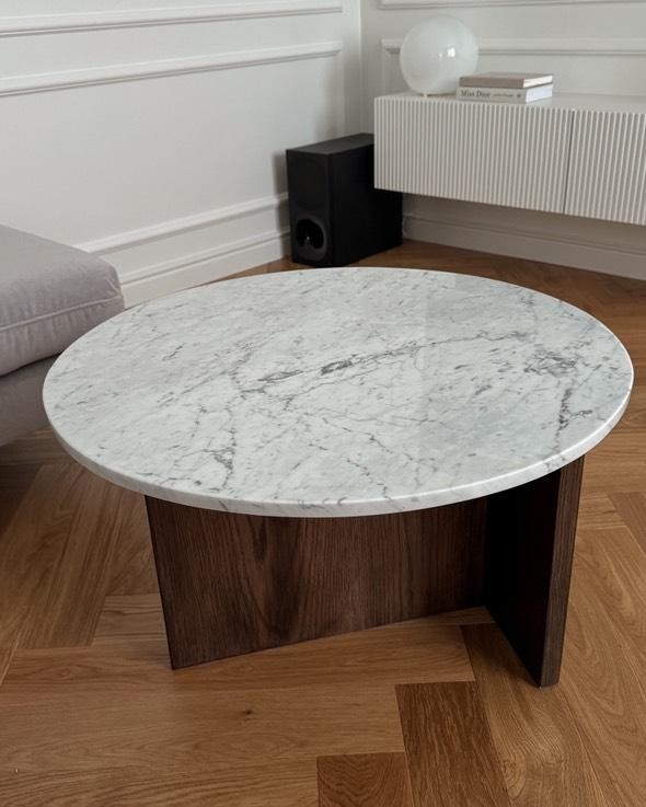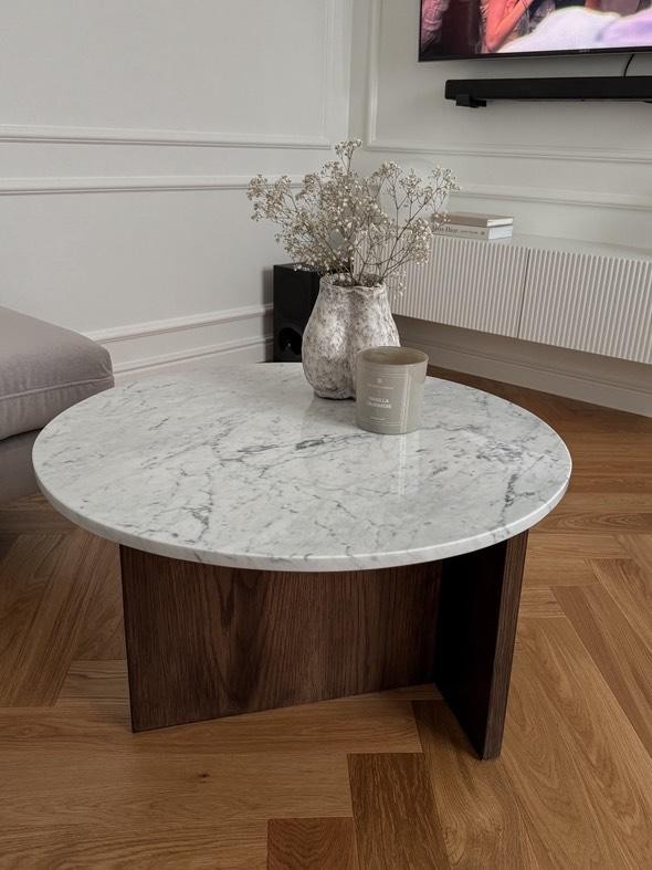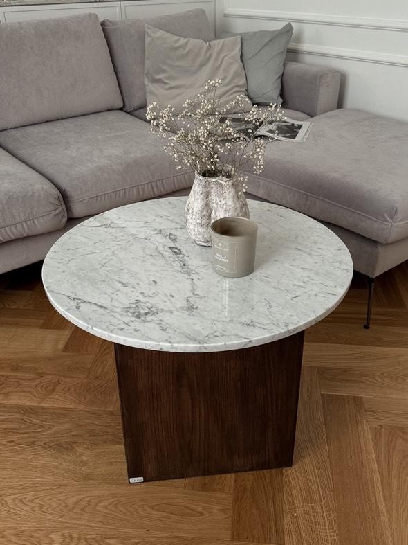 Stolik carrara z dębową podstawą to eleganckie połączenie naturalnego marmuru Bianco Carrara z masywną, dębową nogą w ciepłym odcieniu palisandru.