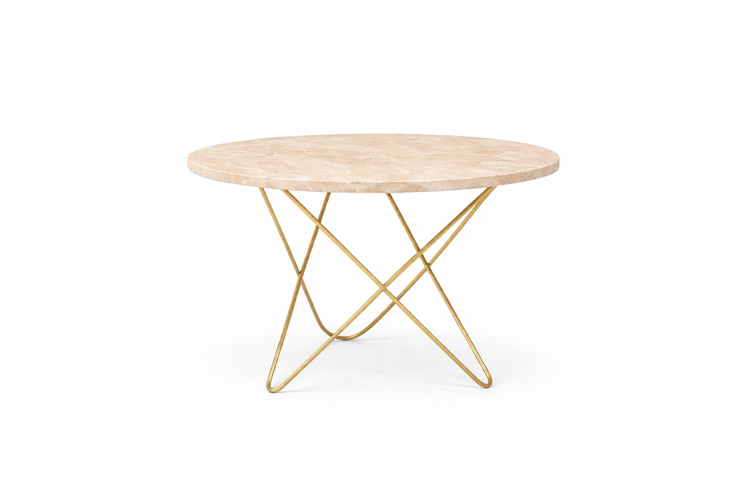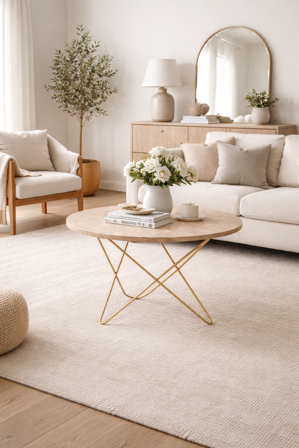 Stolik kawowy loftowy wykonany z naturalnego trawertynu w ciepłej, beżowej kolorystyce. Minimalistyczna metalowa podstawa typu hairpin nadaje mu nowoczesny i lekki charakter, dzięki czemu doskonale pasuje do wielu aranżacji wnętrz.