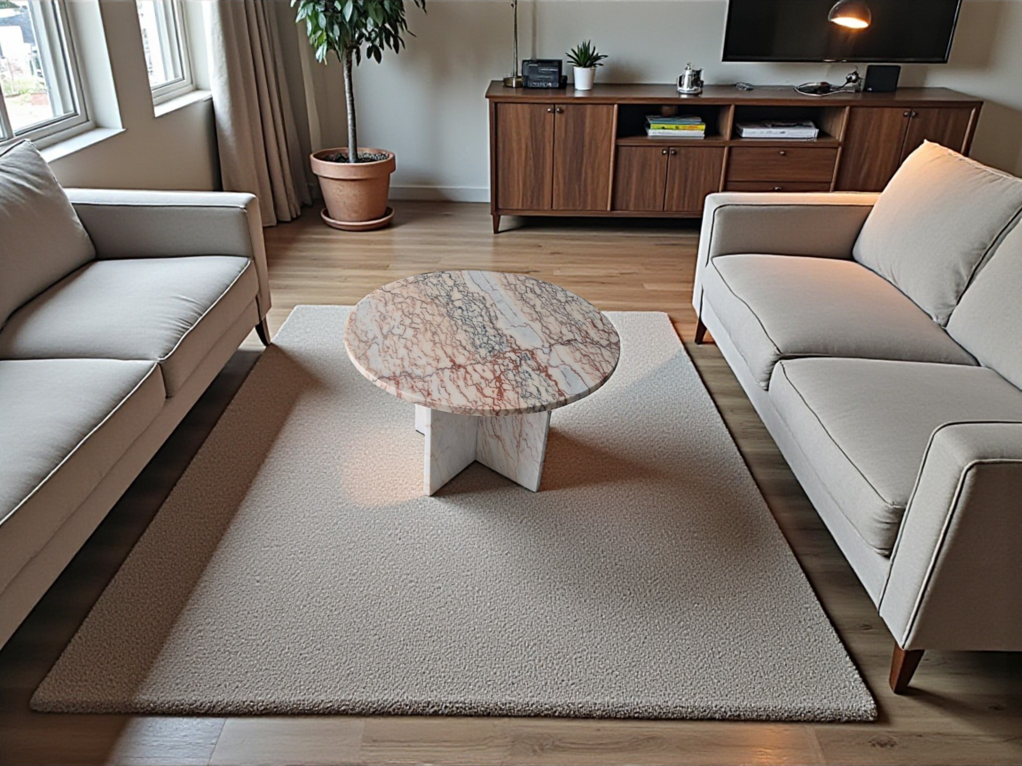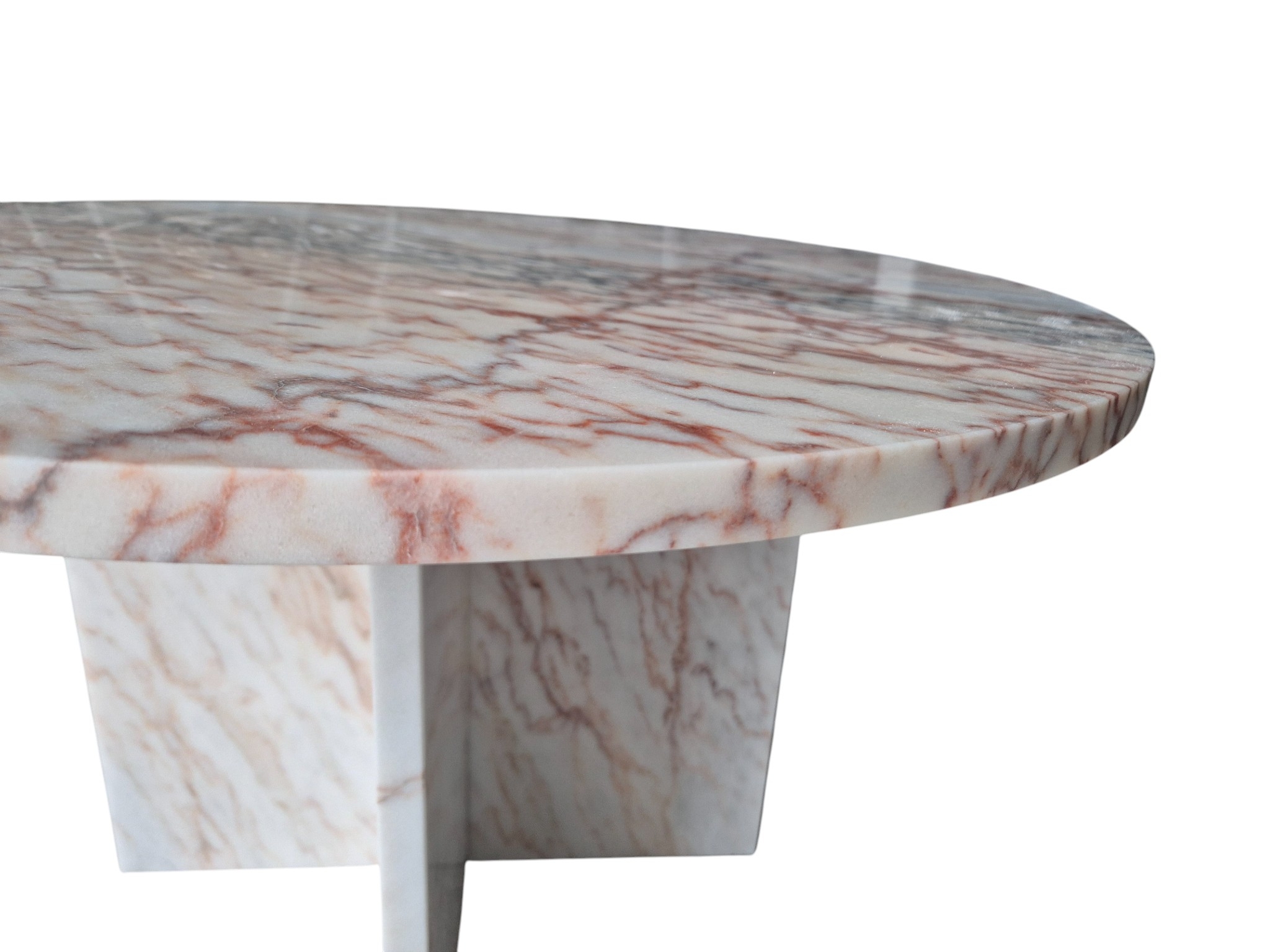 Stolik kawowy z różowego marmuru Rosa Portogallo, który zachwyca ciepłymi odcieniami różu oraz wyrazistym użyleniem w kolorach czerni, bieli i beżu. Nowoczesna forma i szlachetne wykończenie sprawiają, że stolik stanowi wyjątkowy element aranżacji salonu.