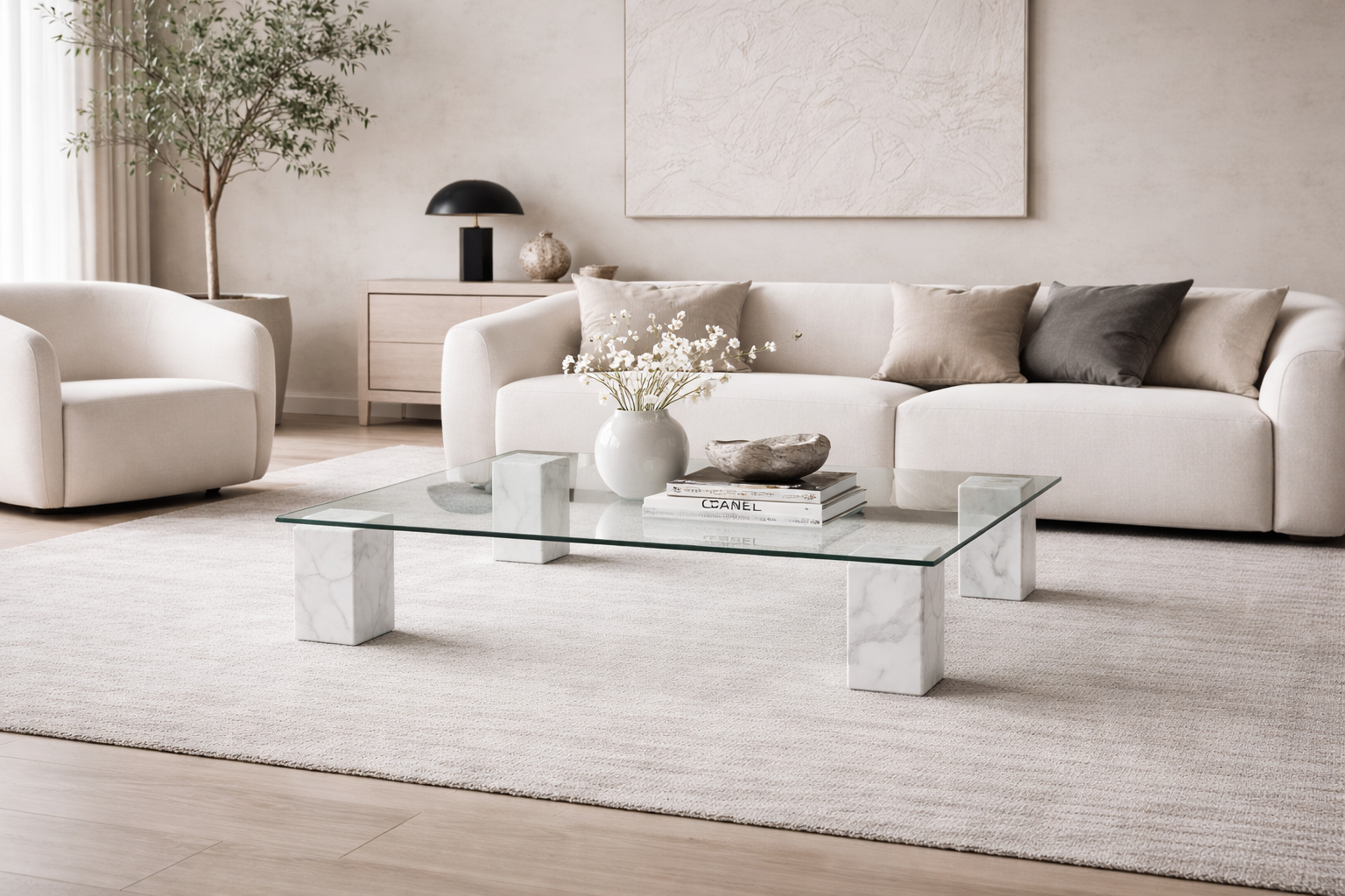 Stolik kawowy ze szklanym blatem to elegancki i nowoczesny mebel łączący lekkość szkła z ponadczasowym charakterem naturalnego kamienia. Minimalistyczna forma oraz cztery masywne kolumny z marmuru Bianco Carrara tworzą wyjątkową kompozycję, która doskonale podkreśla charakter nowoczesnych i luksusowych wnętrz.