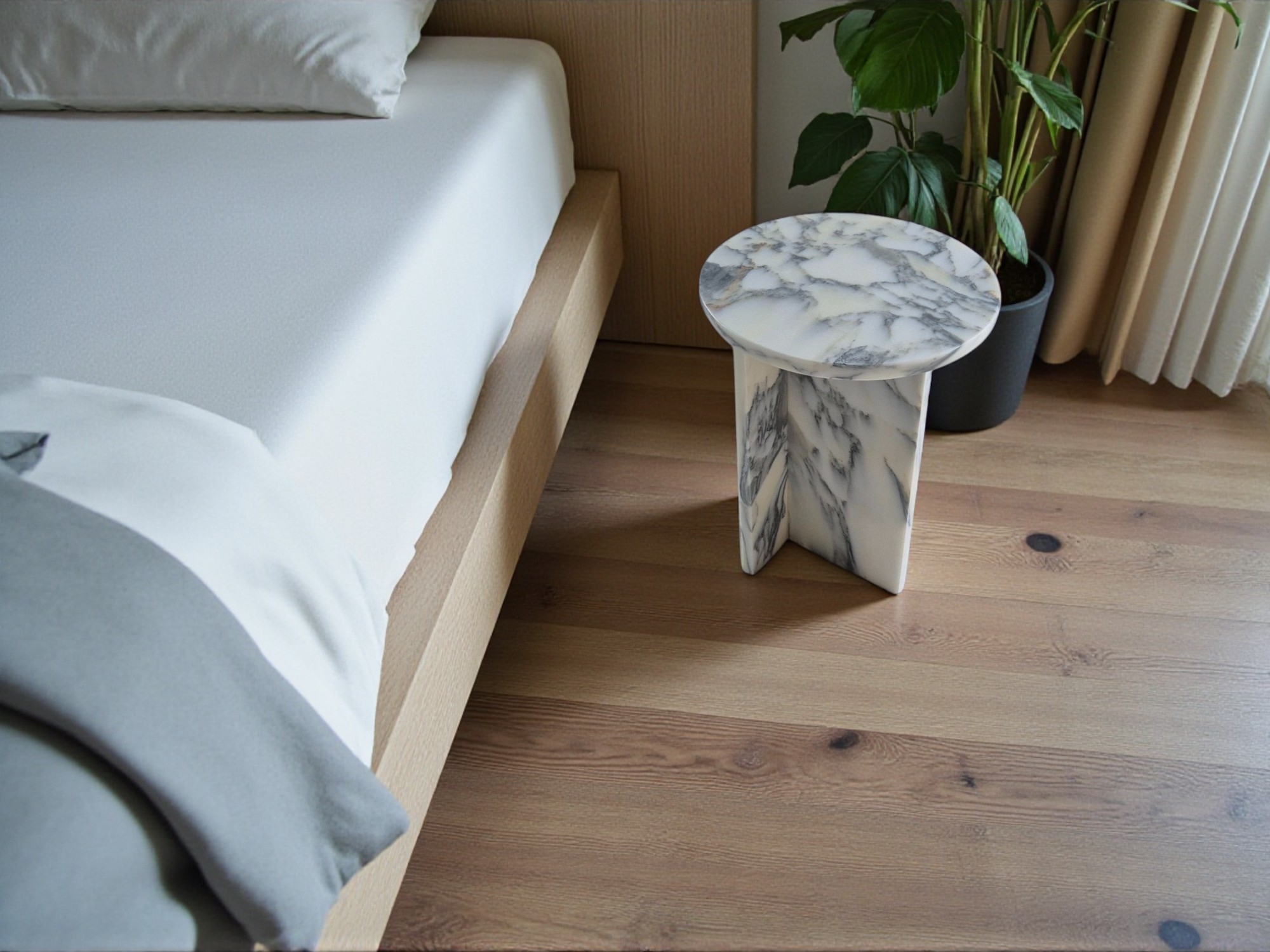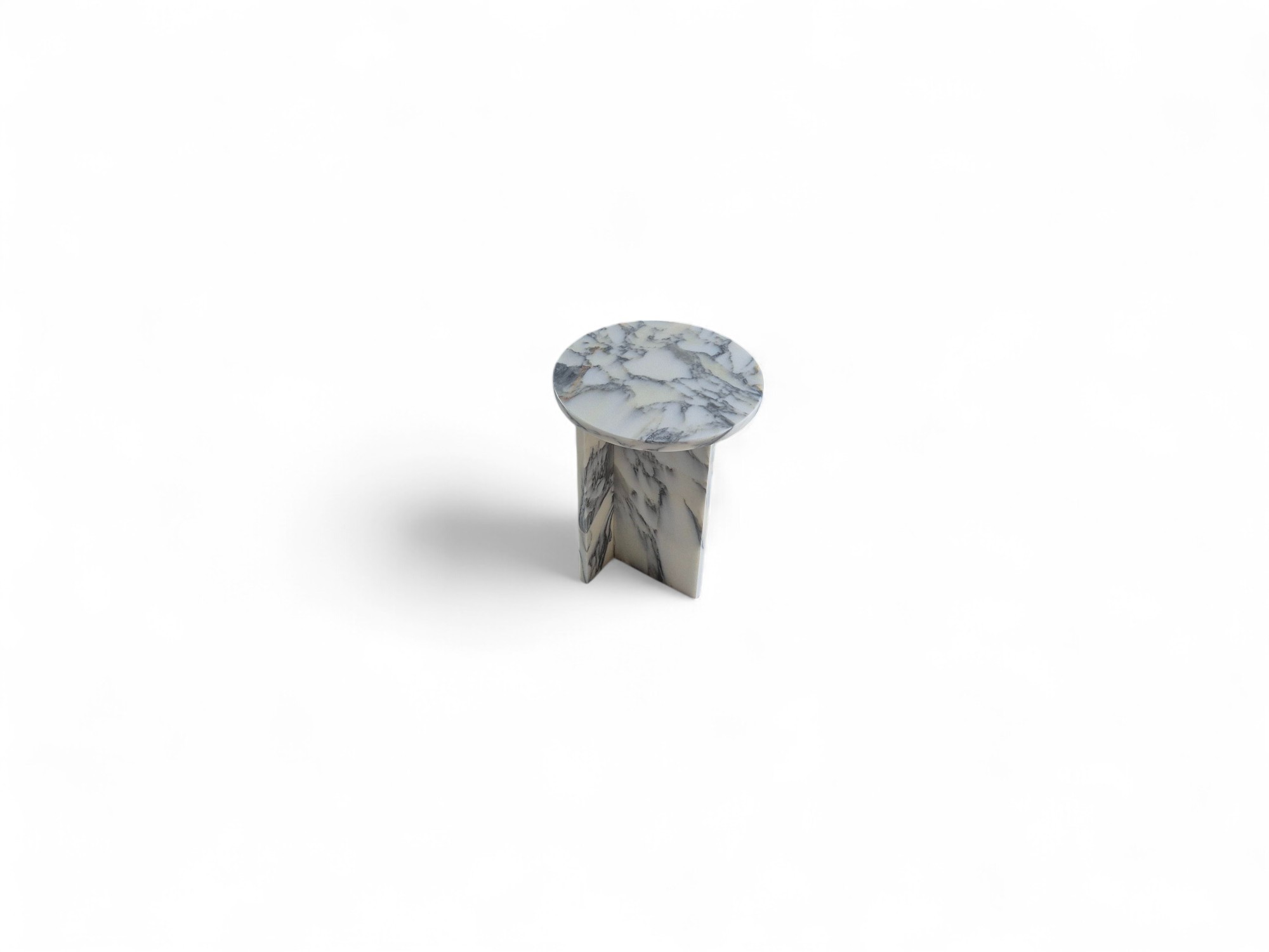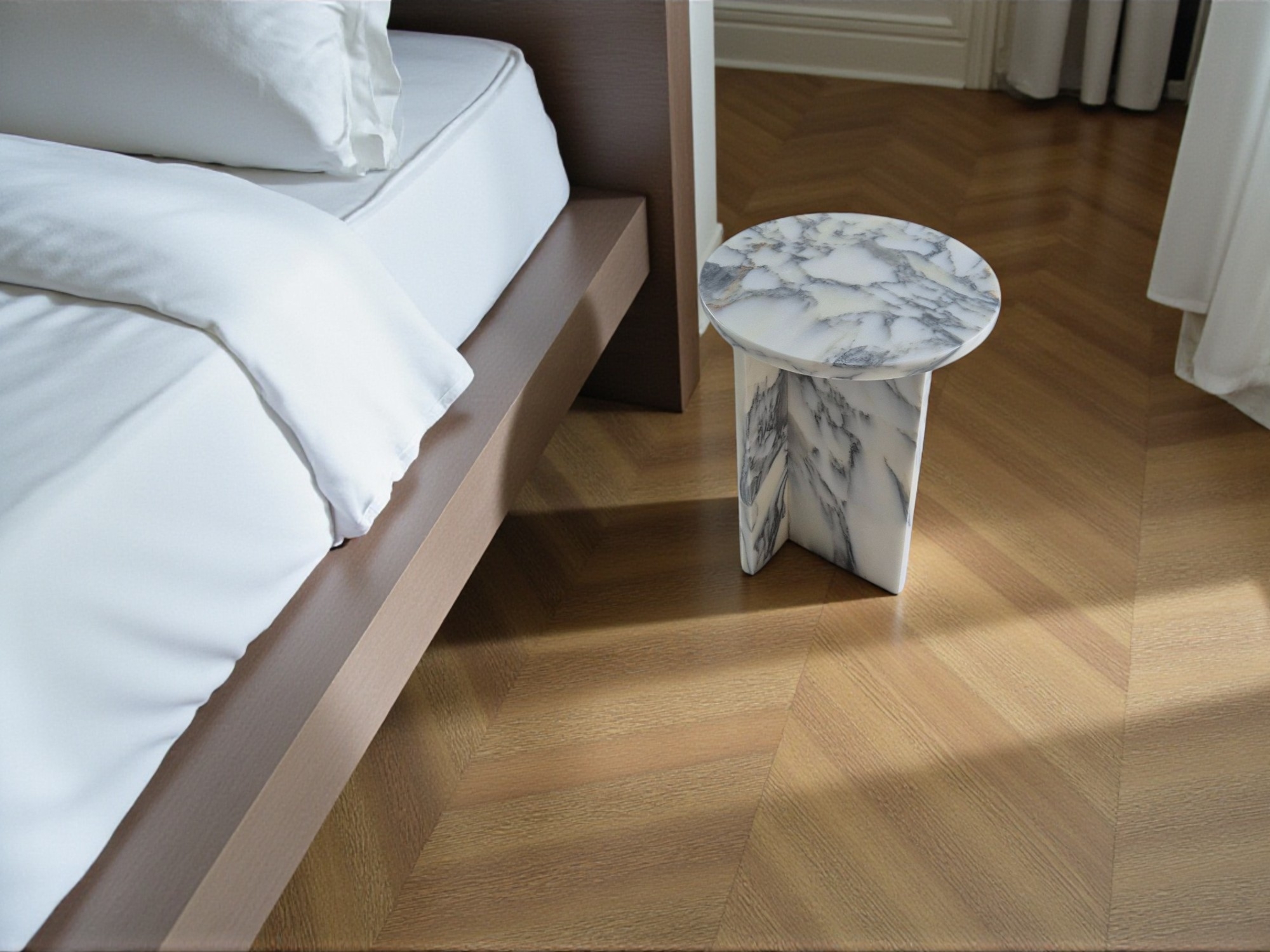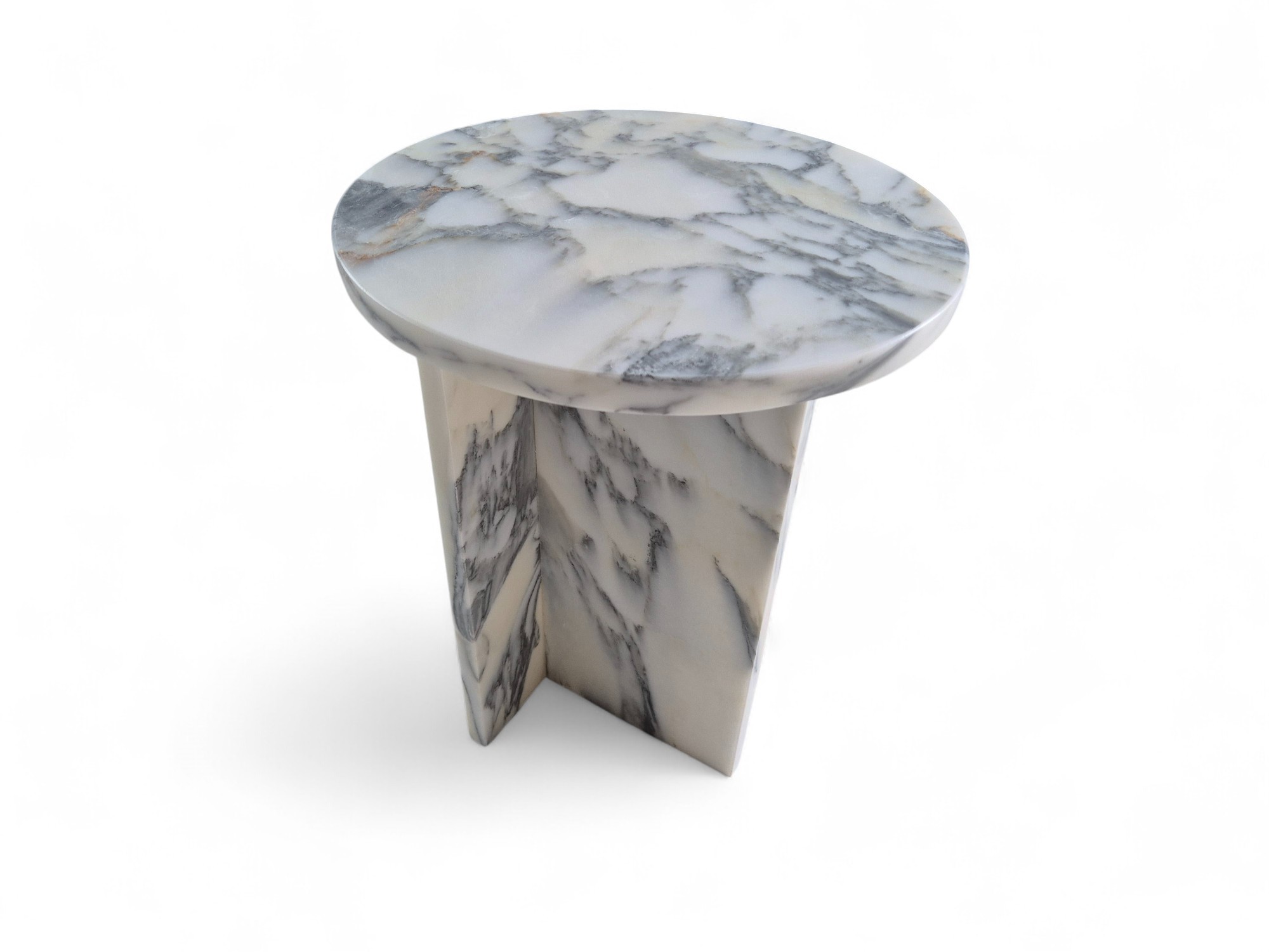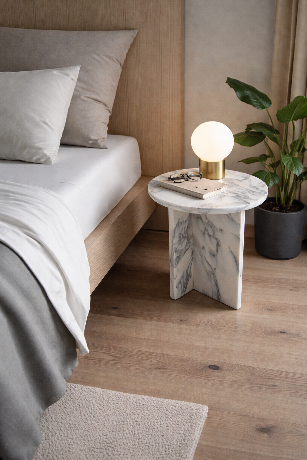 Stolik nocny z marmuru Arabescato Corchia to elegancki i minimalistyczny mebel wykonany z naturalnego kamienia o mlecznobiałej kolorystyce z delikatnym, szarym użyleniem.
