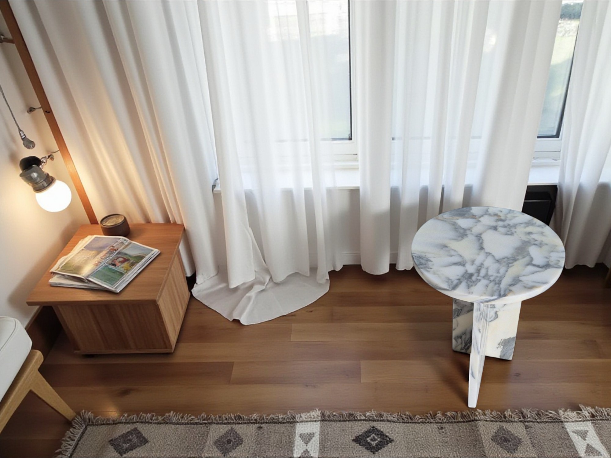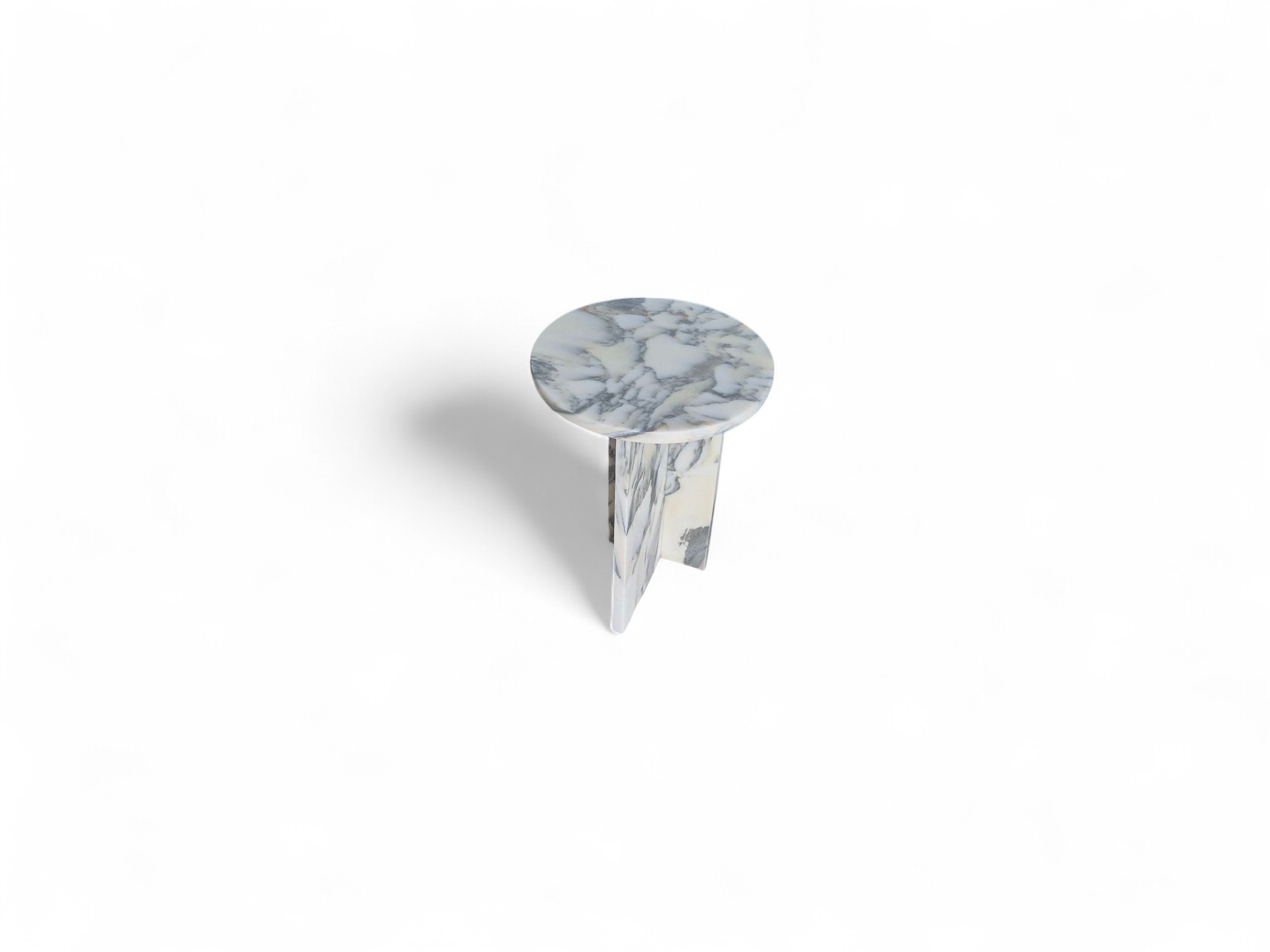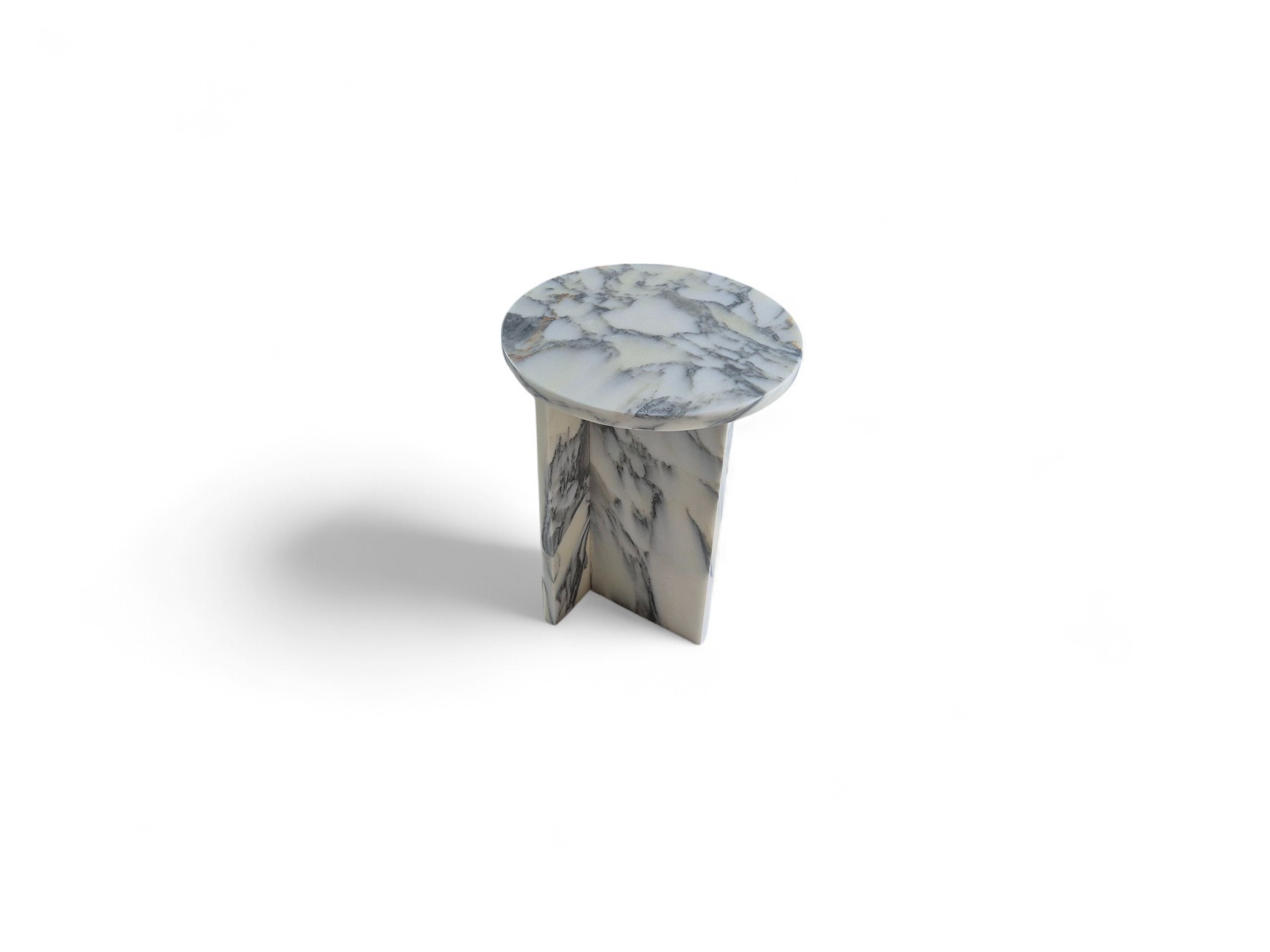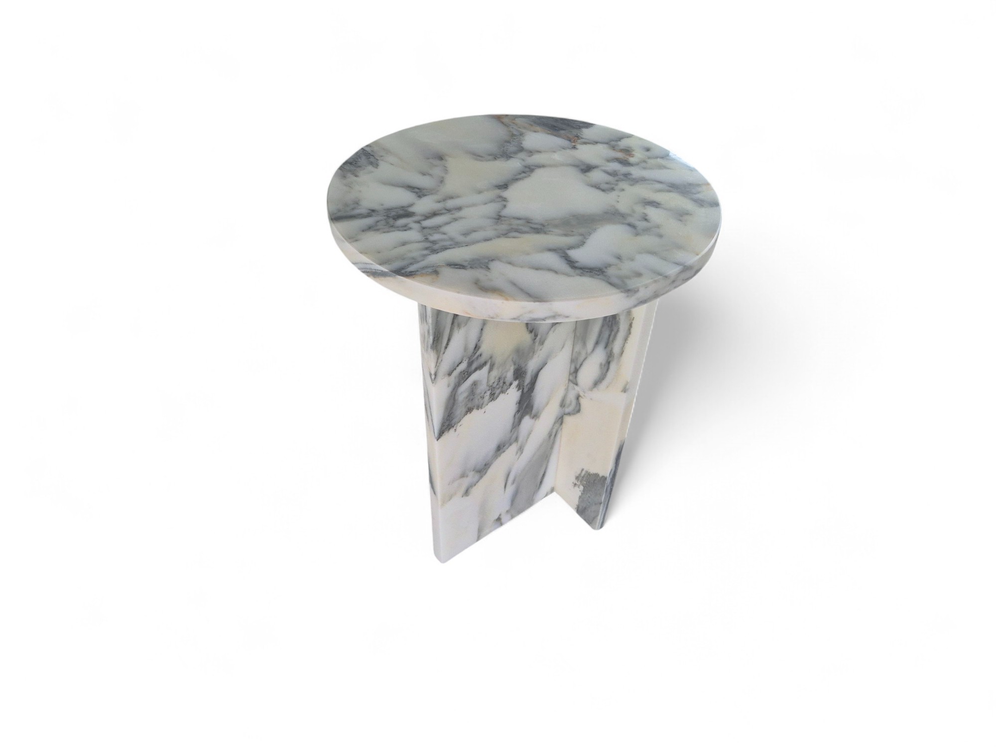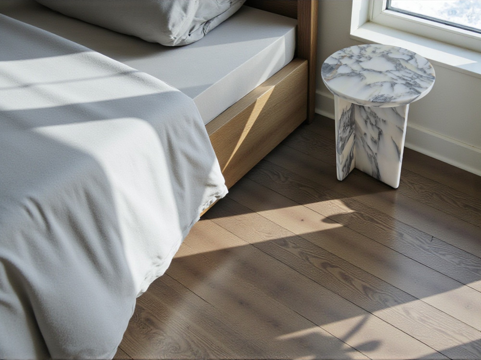 Stolik nocny z marmuru Arabescato Corchia to elegancki i minimalistyczny mebel wykonany z naturalnego kamienia o mlecznobiałej kolorystyce z delikatnym, szarym użyleniem.