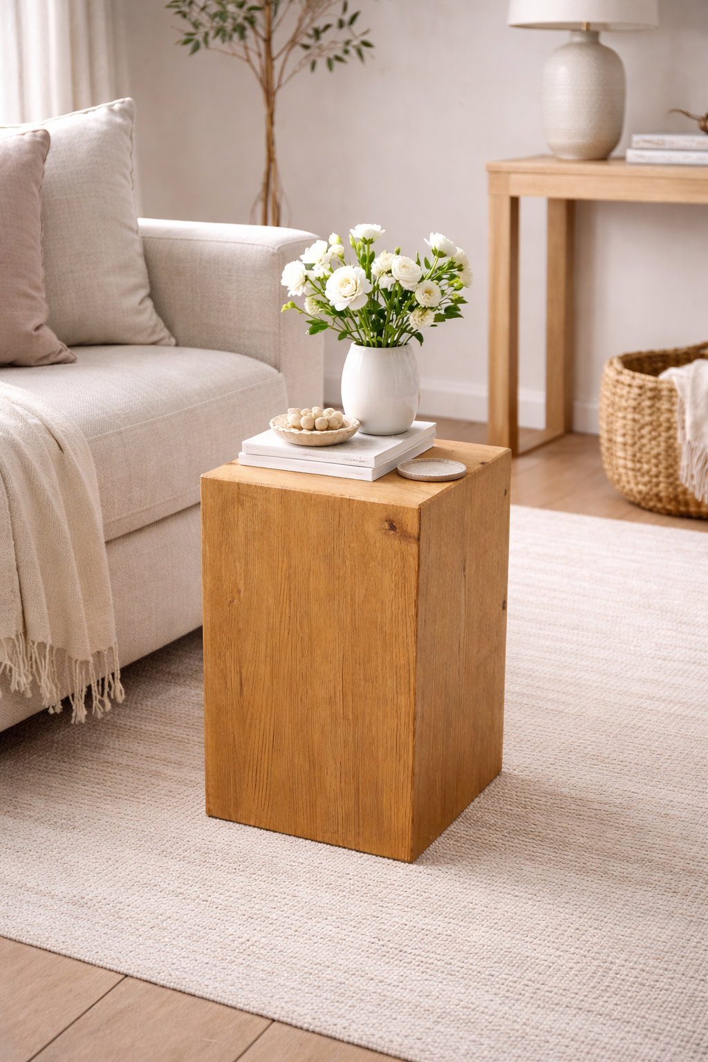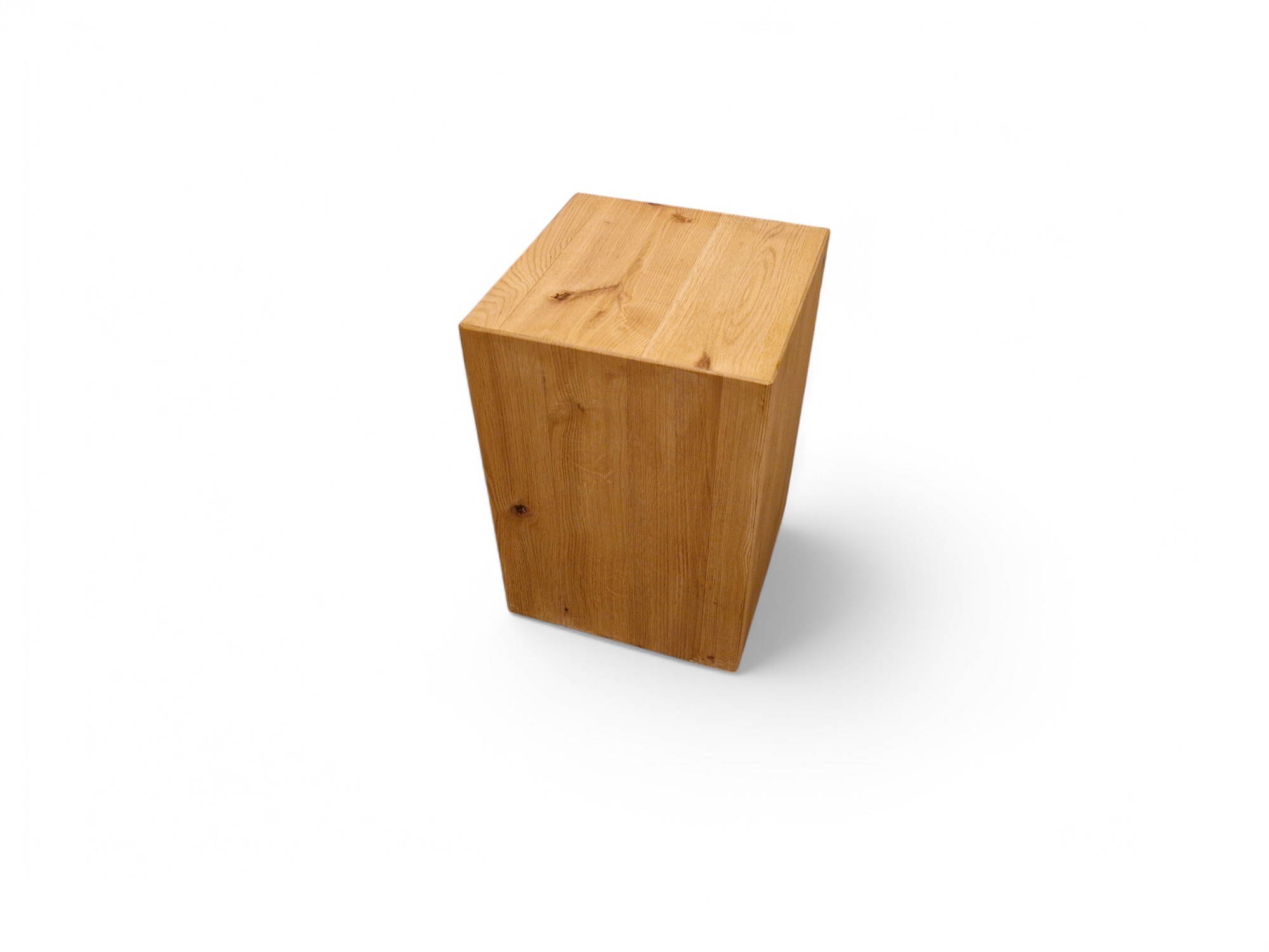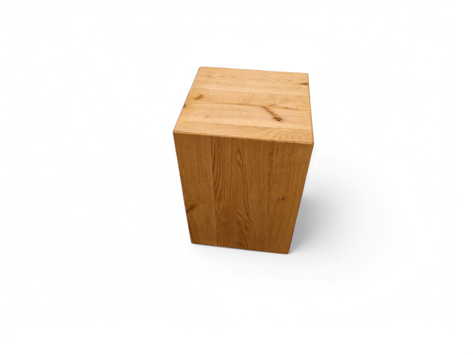 Stolik pomocniczy z drewna dębowego to minimalistyczny mebel wykonany z litego, klejonego drewna dębowego. Naturalne usłojenie, precyzyjne łączenia pod kątem 45° oraz kompaktowe wymiary sprawiają, że stolik doskonale sprawdzi się jako element funkcjonalny i dekoracyjny we wnętrzach.