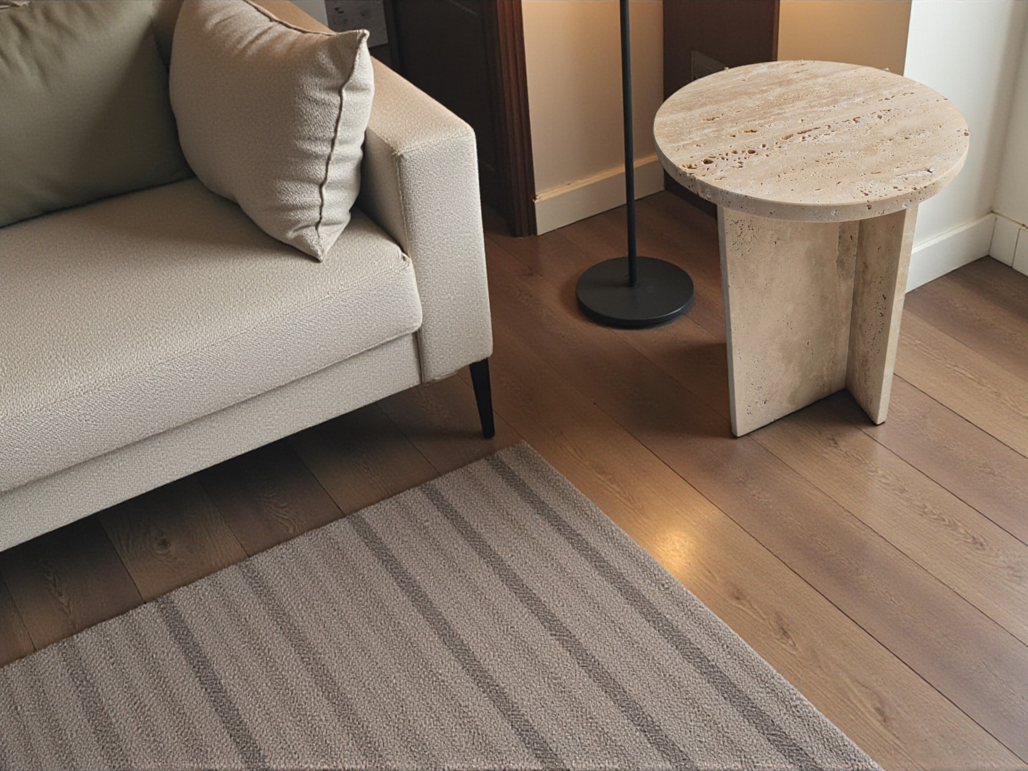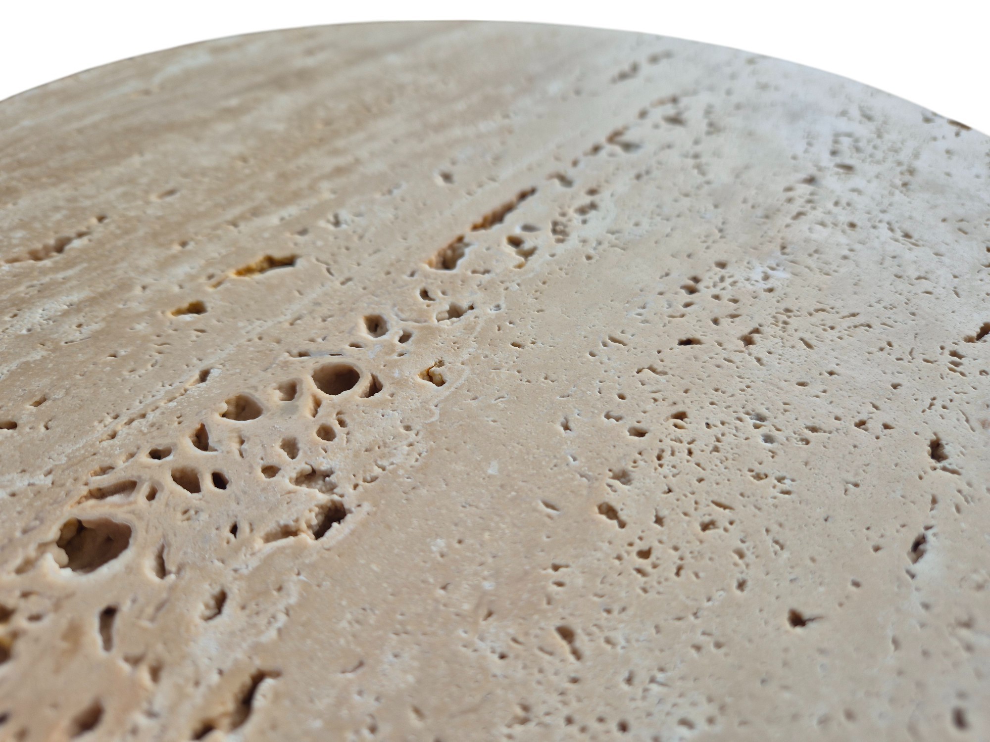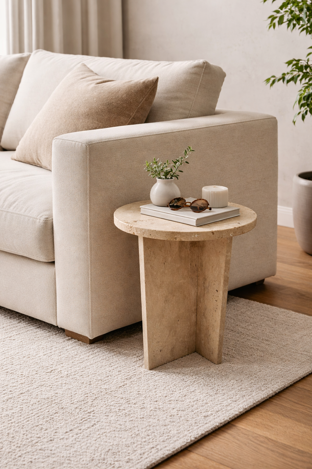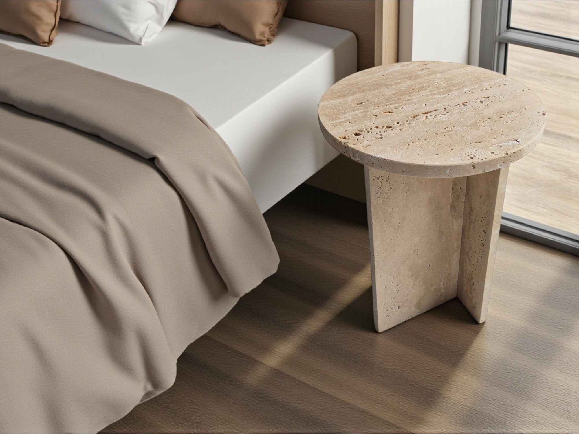 Stolik pomocniczy z trawertynu to naturalny, kamienny akcent o lekkiej formie i surowym charakterze. Jasna, beżowo-kremowa kolorystyka oraz widoczna struktura kamienia sprawiają, że stolik doskonale uzupełnia wnętrza w stylu naturalnym, japandi i minimalistycznym.