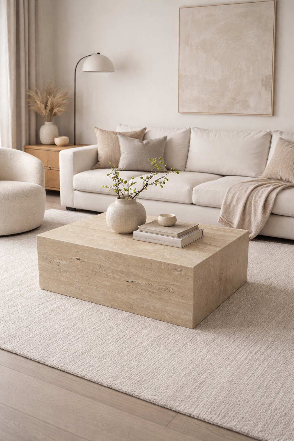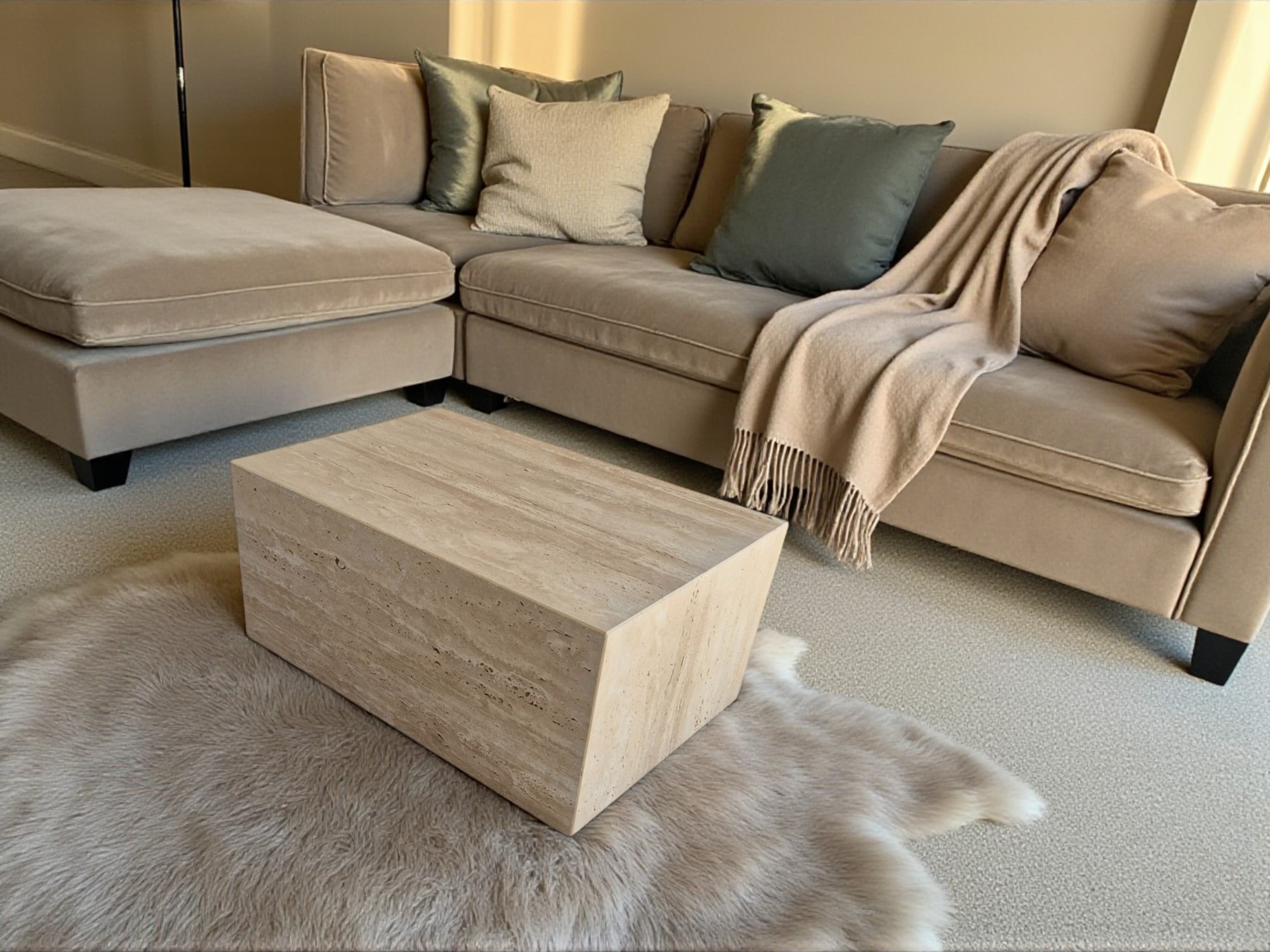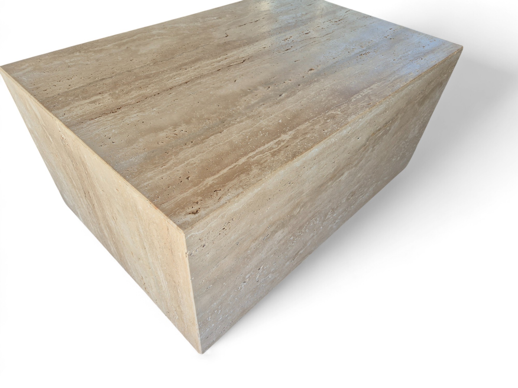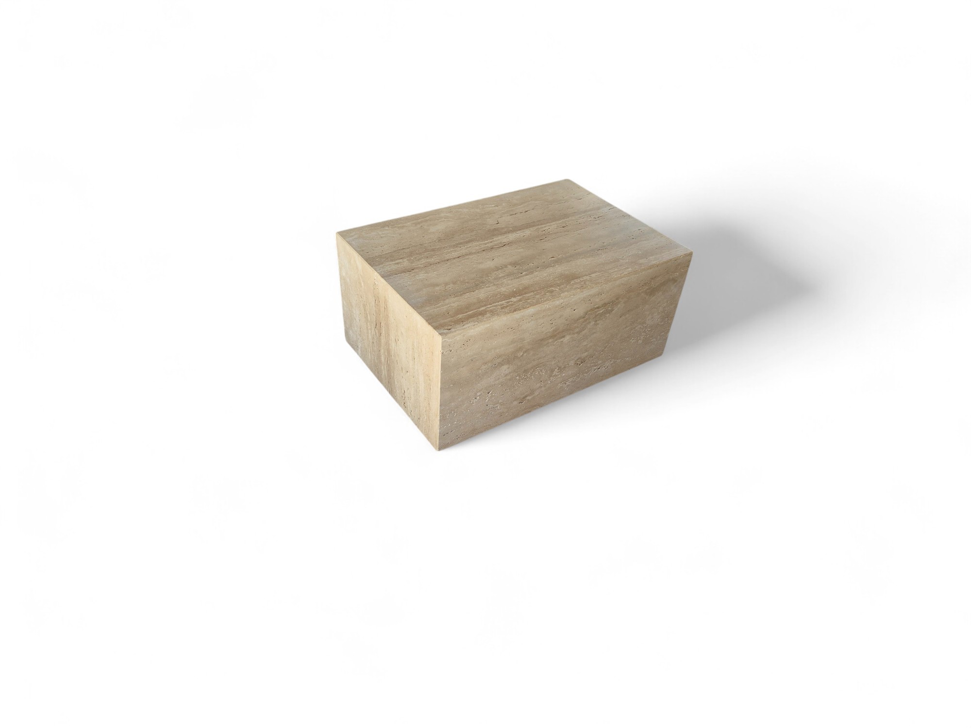 Stolik typu cube z naturalnego trawertynu Ivory to masywny, minimalistyczny mebel o wyrazistej, bryłowej formie. Kremowo-beżowa kolorystyka i matowe wykończenie podkreślają naturalny charakter kamienia, dzięki czemu stolik doskonale wpisuje się w spokojne, eleganckie wnętrza.