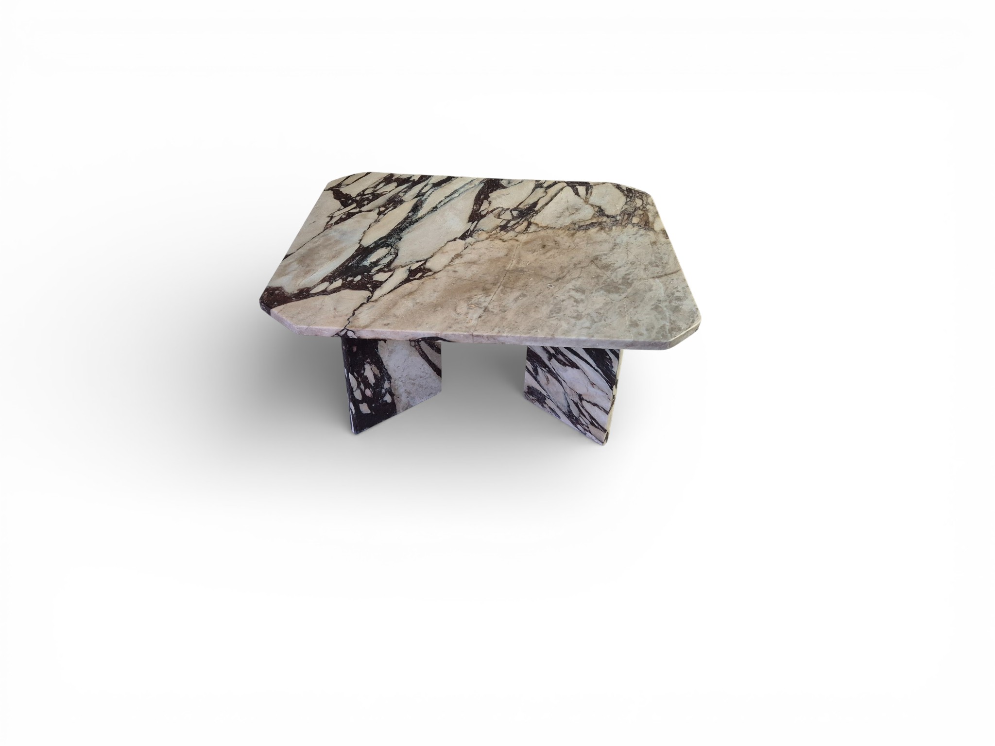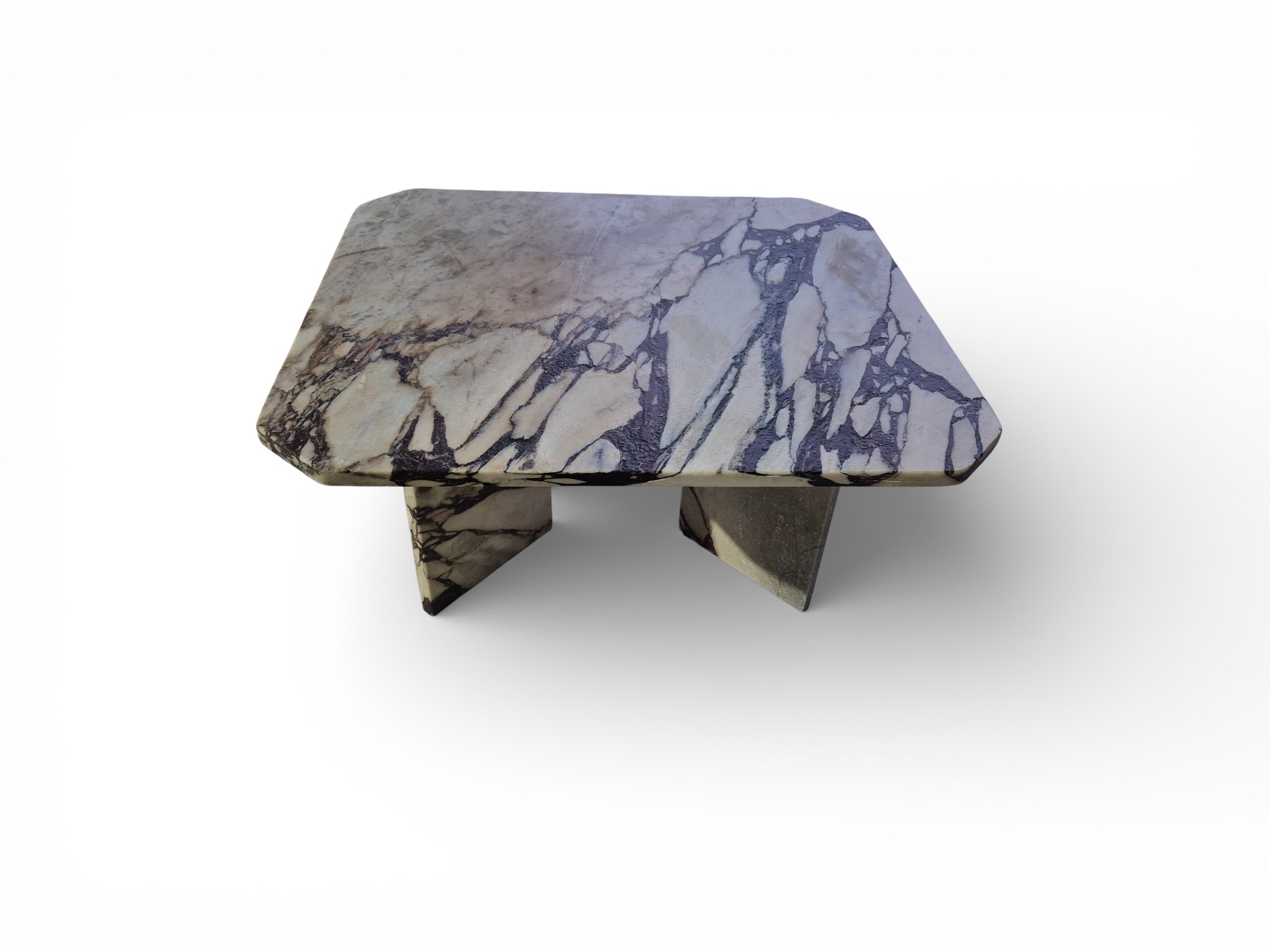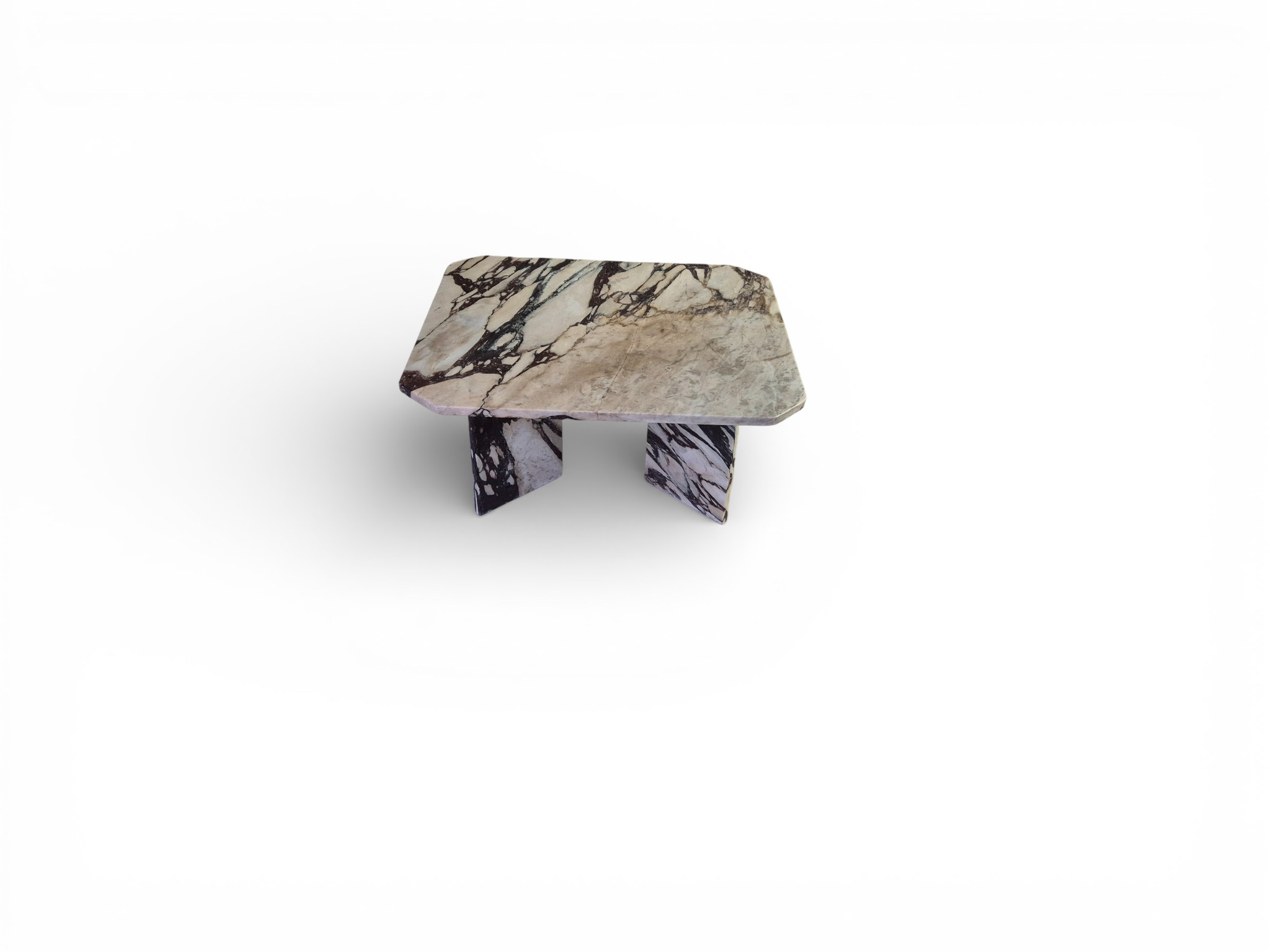 Stolik z Calacatta Viola to wyrazisty element aranżacji salonu, łączący rzeźbiarską formę z naturalnym pięknem kamienia. Jasna, kremowo-mleczna kolorystyka przełamana intensywnym żyłkowaniem w odcieniach bordo i purpury nadaje mu unikatowy charakter.