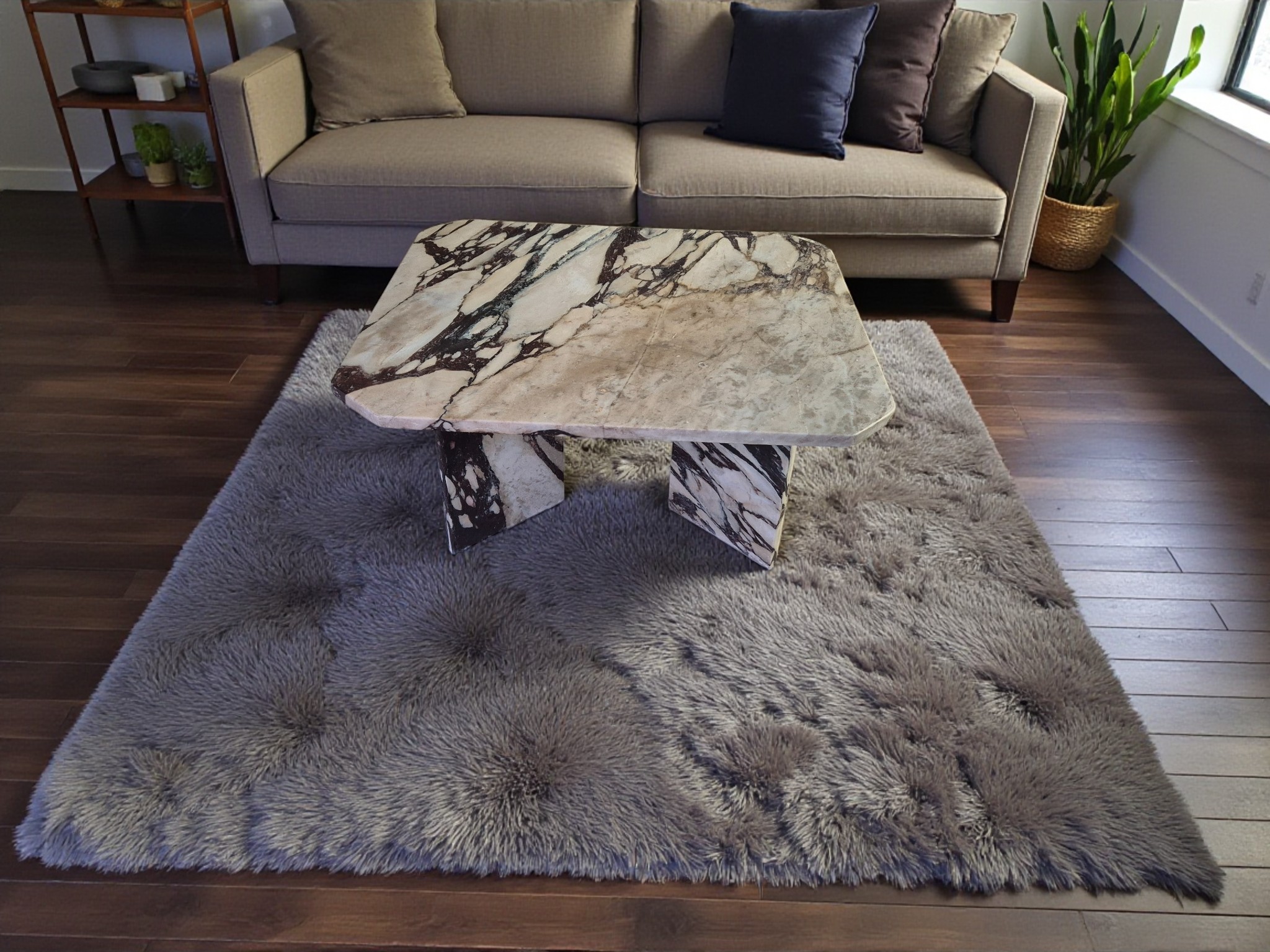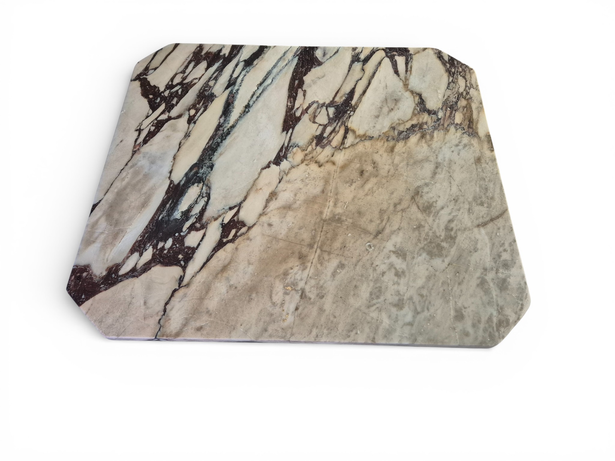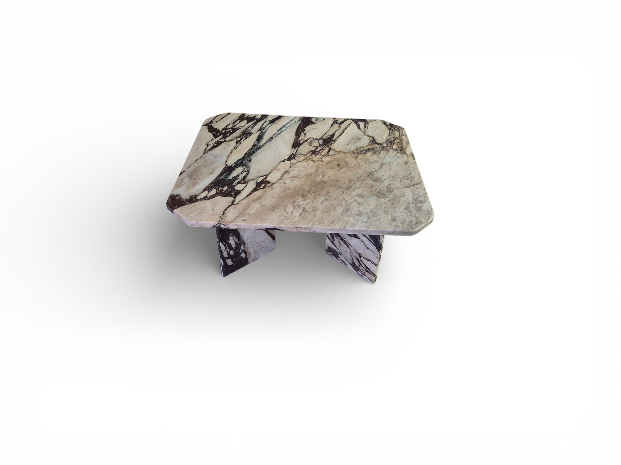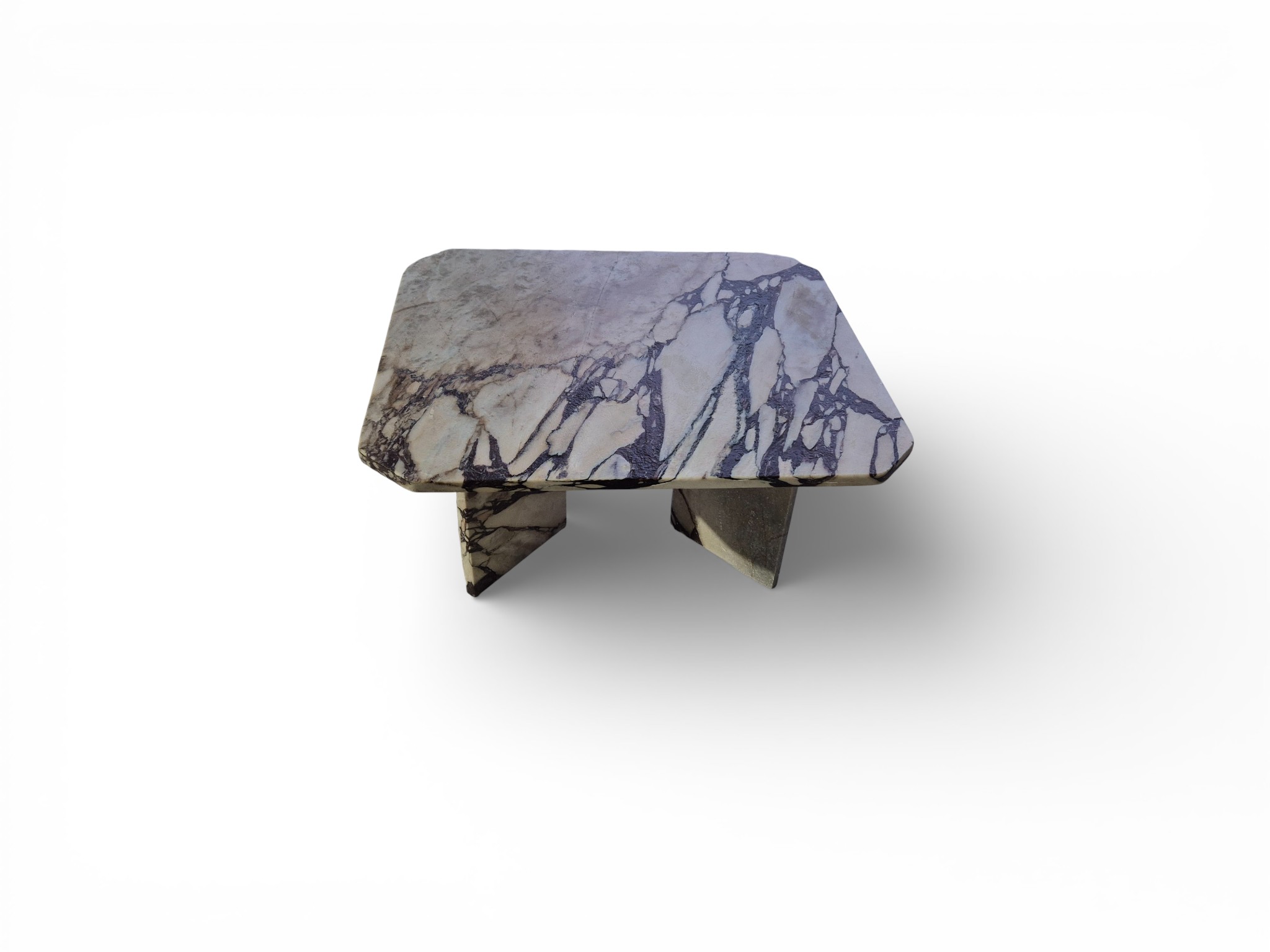 Stolik z Calacatta Viola to wyrazisty element aranżacji salonu, łączący rzeźbiarską formę z naturalnym pięknem kamienia. Jasna, kremowo-mleczna kolorystyka przełamana intensywnym żyłkowaniem w odcieniach bordo i purpury nadaje mu unikatowy charakter.