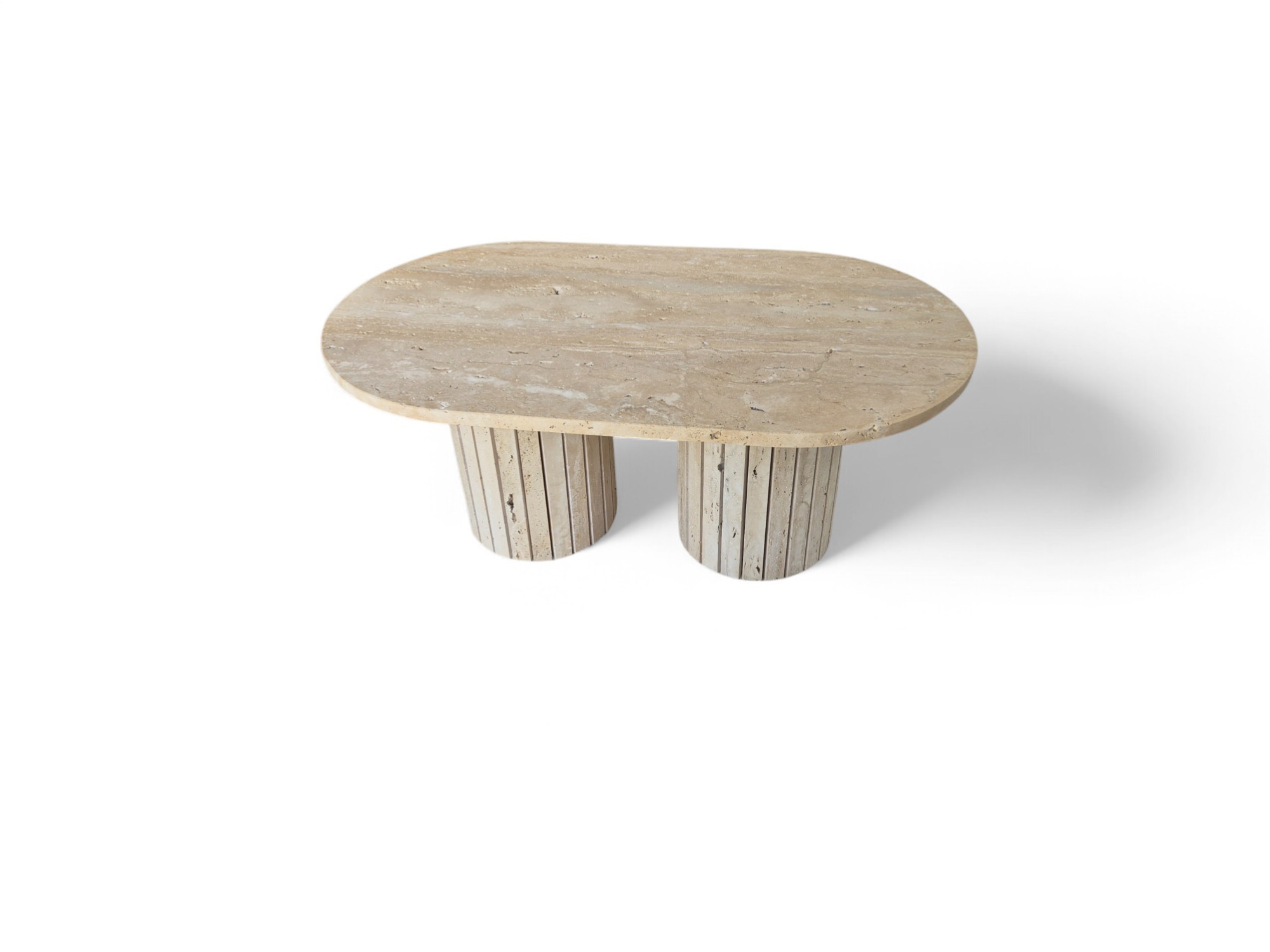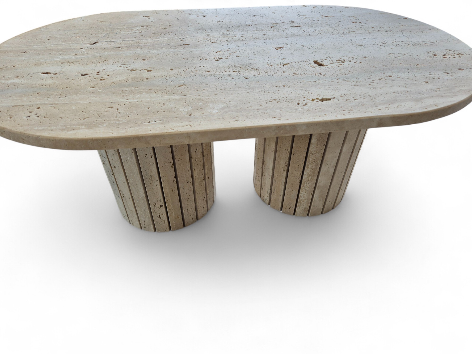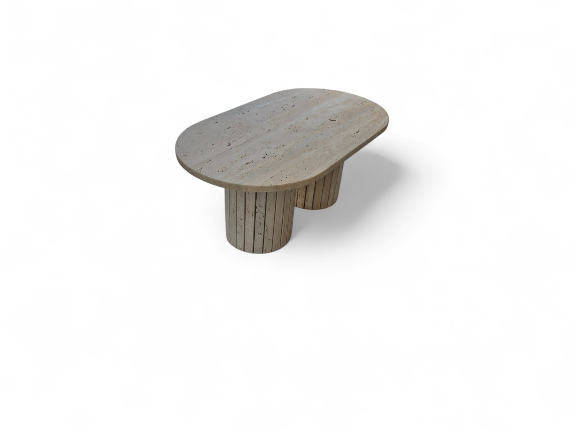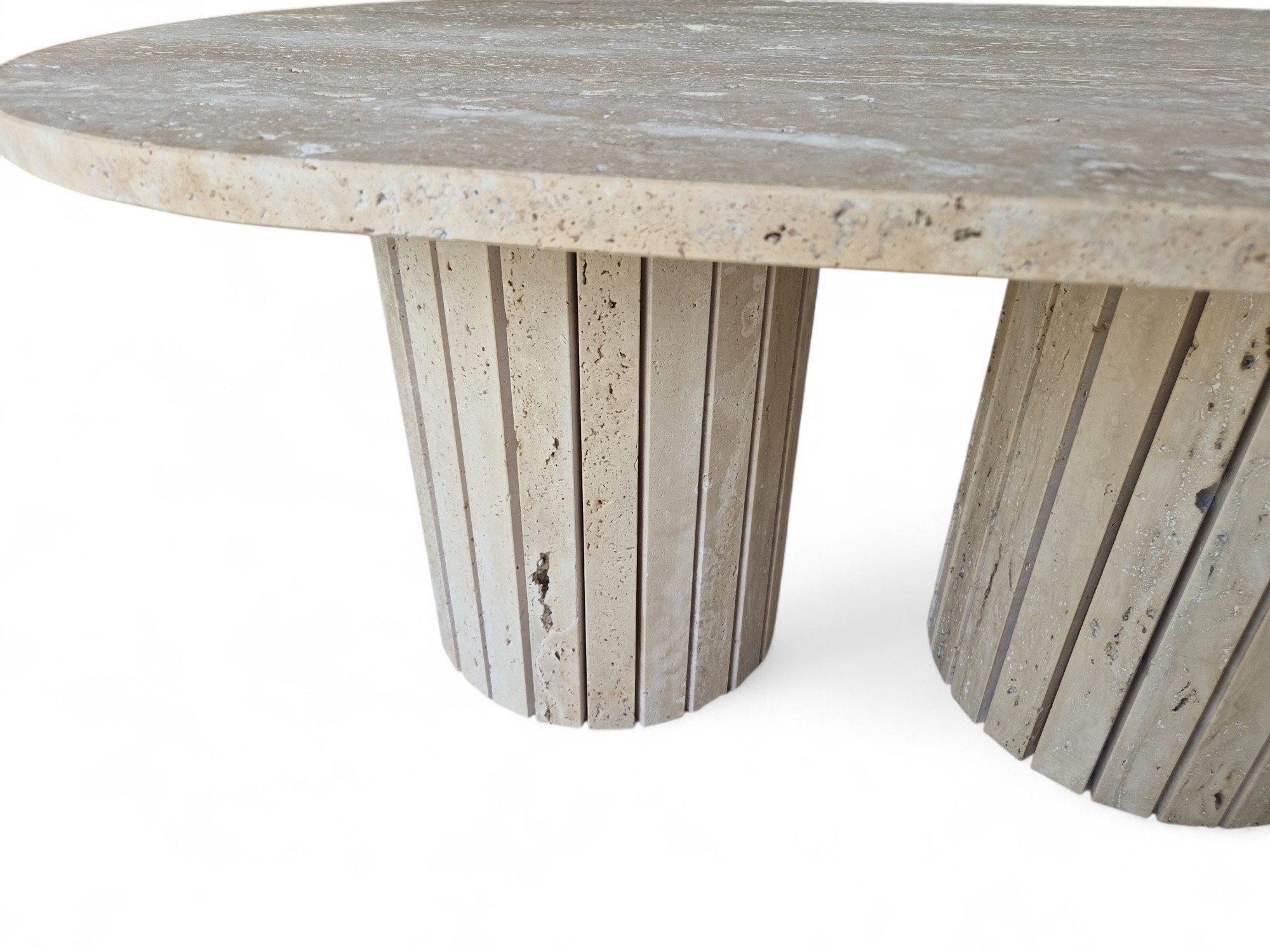 Stolik z podwójną ryflowaną podstawą wykonany z naturalnego trawertynu to wyrazisty i solidny mebel o surowym, autentycznym charakterze.