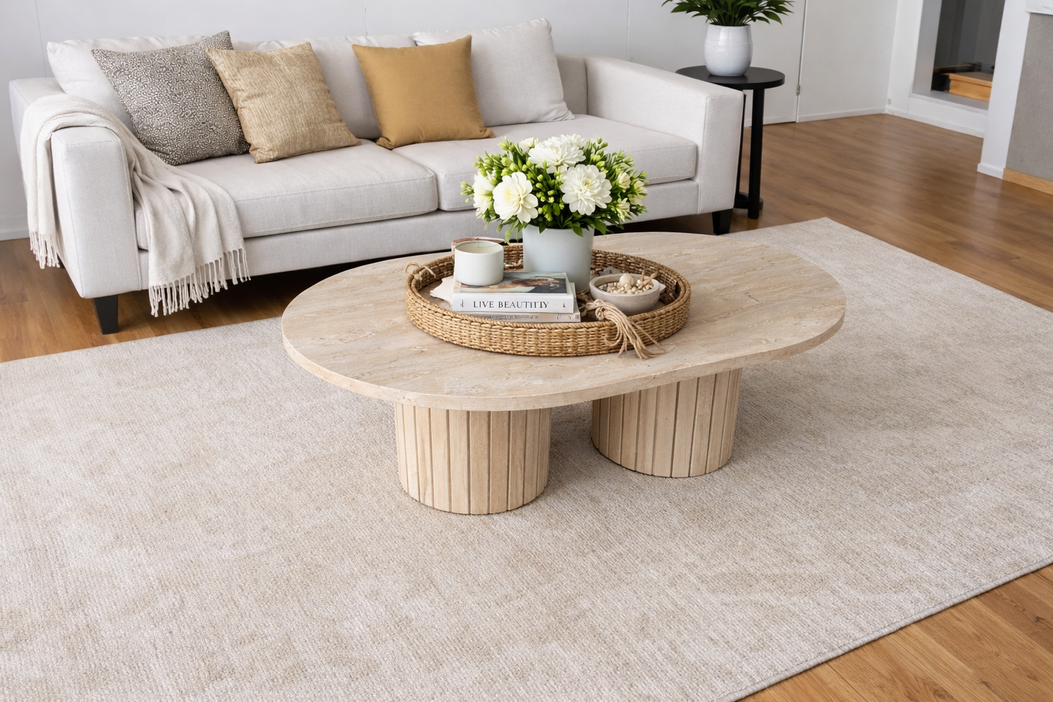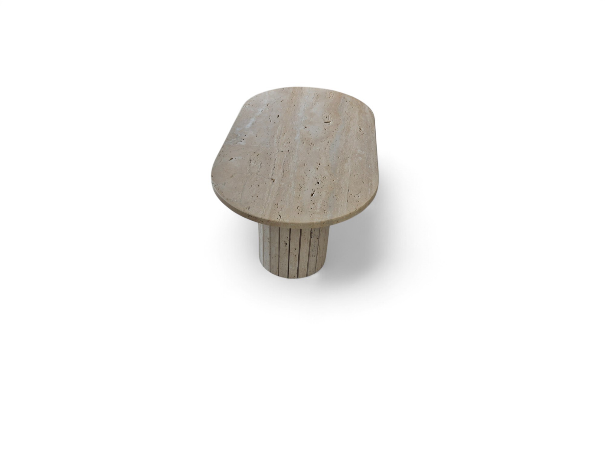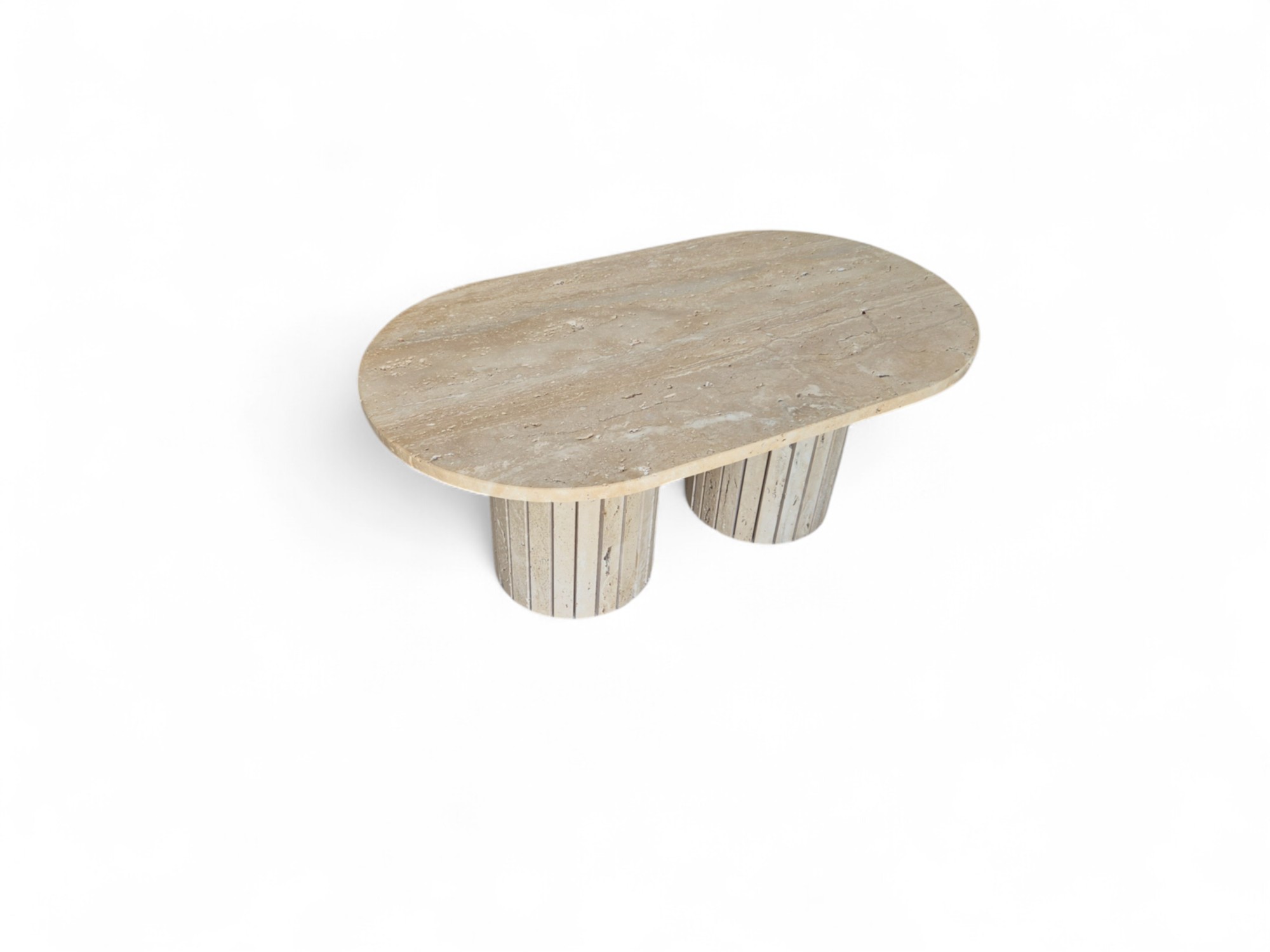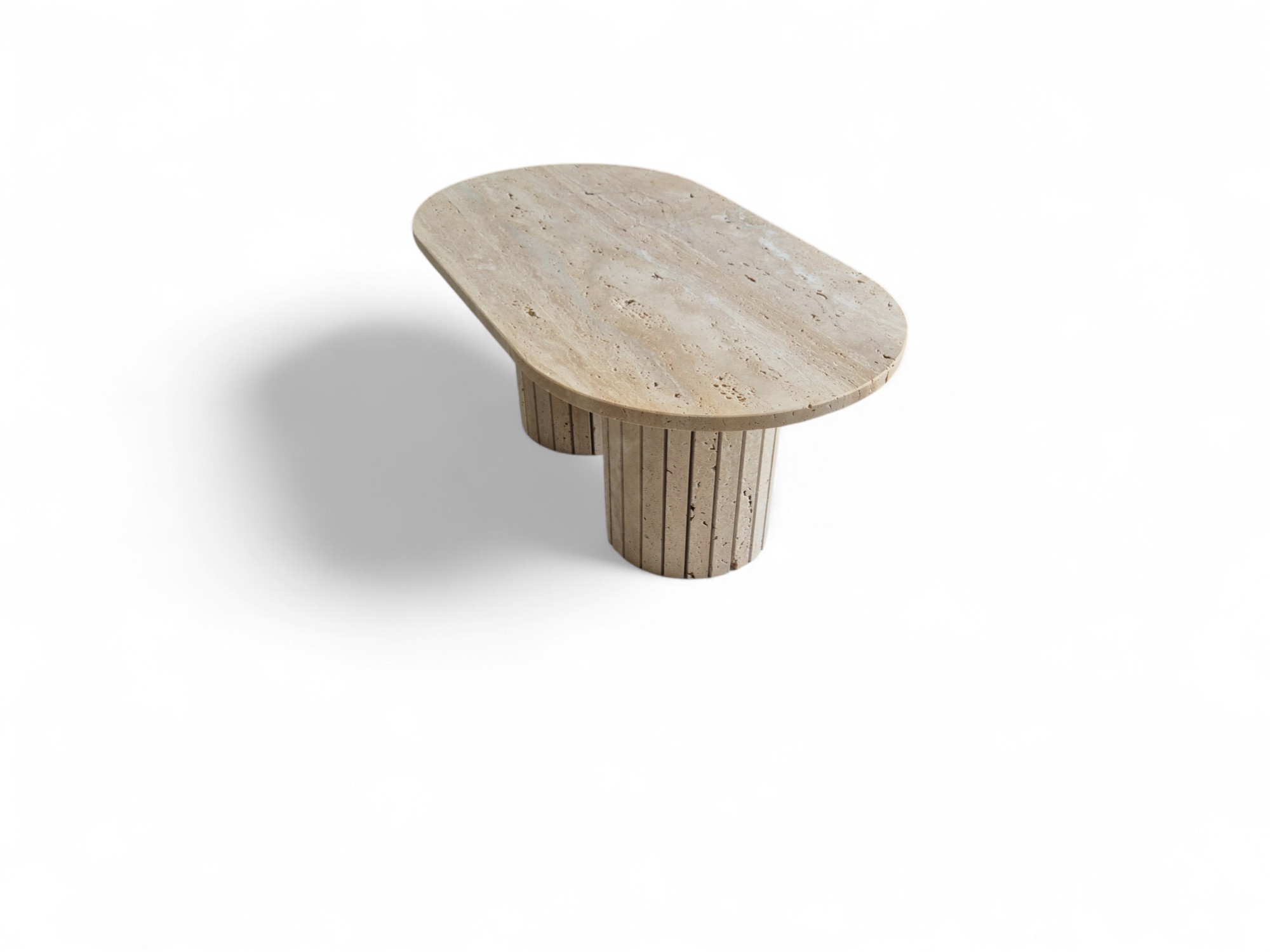 Stolik z podwójną ryflowaną podstawą wykonany z naturalnego trawertynu to wyrazisty i solidny mebel o surowym, autentycznym charakterze.