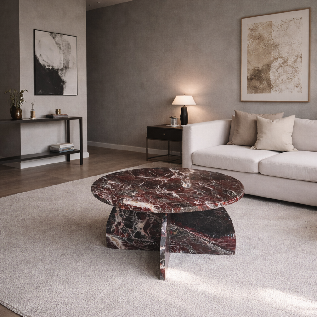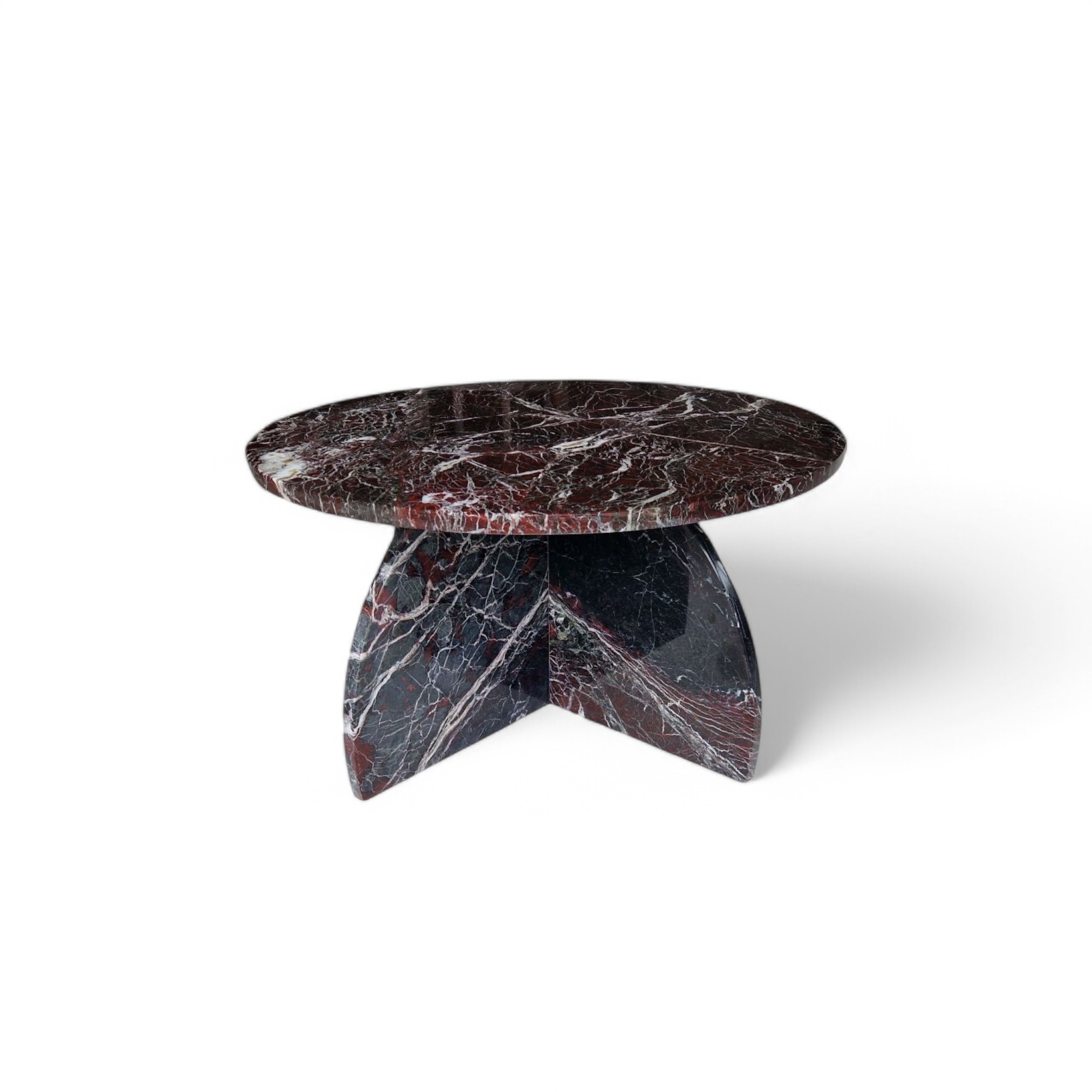 Stolik Rosso Levanto z zaokrągloną podstawą to elegancki i wyrazisty mebel wykonany z naturalnego marmuru o głębokiej, bordowej kolorystyce z charakterystycznym białym i czarnym użyleniem.