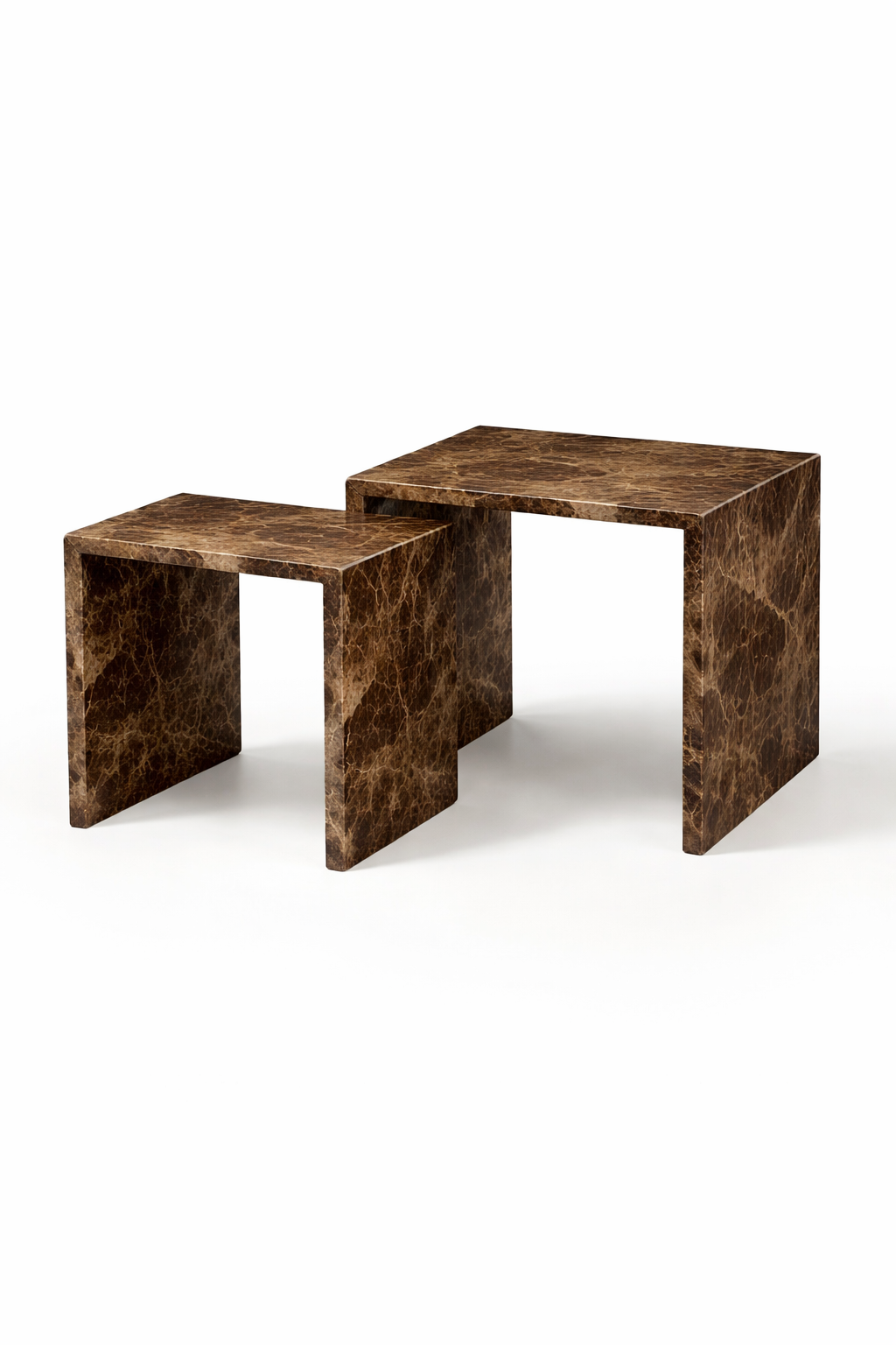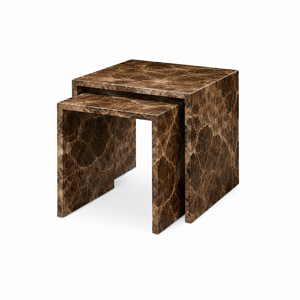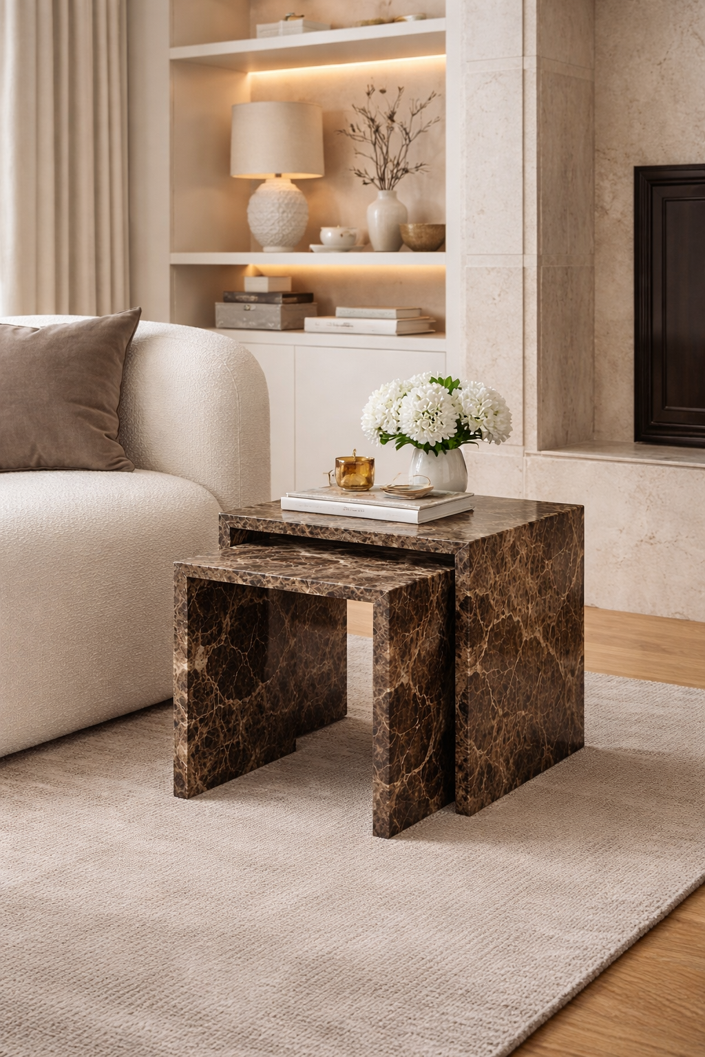 Stoliki wsuwane pod siebie z brązowego marmuru Emperador Dark to elegancki i funkcjonalny zestaw wykonany z naturalnego kamienia o głębokiej, czekoladowo-brązowej kolorystyce z jasnym użyleniem. Zróżnicowane wymiary pozwalają na wsuwanie jednego stolika pod drugi, dzięki czemu zestaw jest praktyczny i efektowny wizualnie.