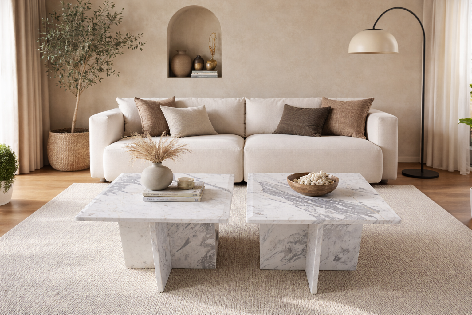 Zestaw stolików marmurowych Pirgon to elegancka i spójna kompozycja wykonana z naturalnego marmuru o jasnej, białej kolorystyce z delikatnym szarym użyleniem. Doskonale sprawdzi się w salonie jako funkcjonalny i dekoracyjny element wnętrza.