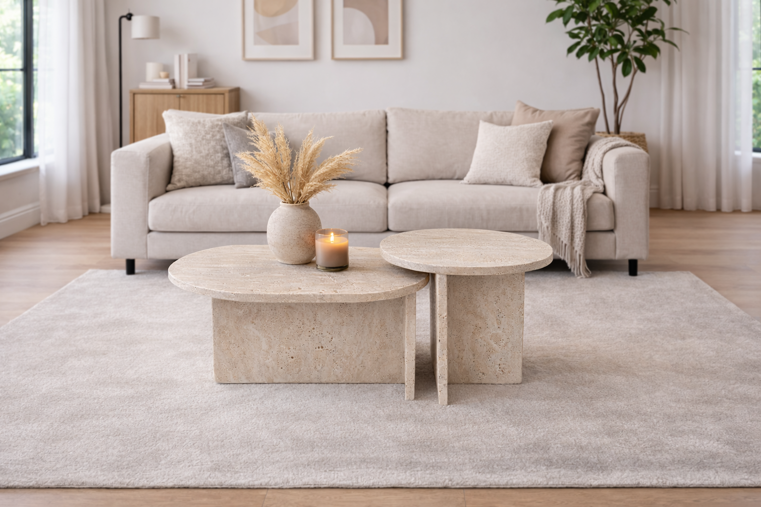 Zestaw stolików z trawertynu Romano Classico to naturalna i elegancka kompozycja wykonana z kamienia o ciepłych, beżowych odcieniach. Zróżnicowane formy blatów oraz matowe, szczotkowane wykończenie podkreślają surowy i autentyczny charakter trawertynu.