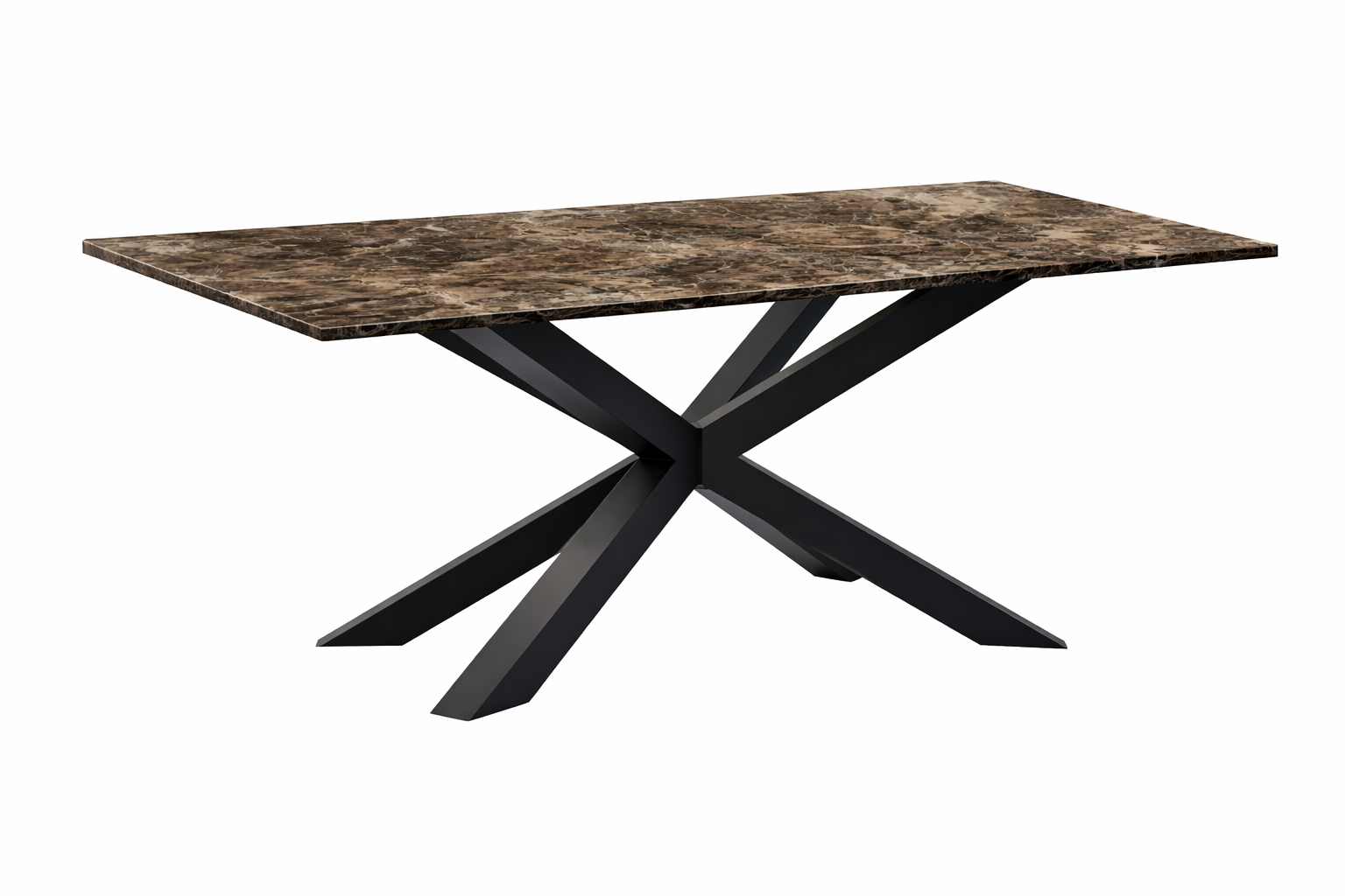 Duży stół z marmurowym prostokątnym blatem Emperador Dark, który stanowi elegancki i wyrazisty element wnętrza. Ciemne odcienie brązu w połączeniu z metalową podstawą typu „pająk” tworzą nowoczesną, luksusową formę. Każdy egzemplarz jest unikalny dzięki naturalnemu użyleniu kamienia.