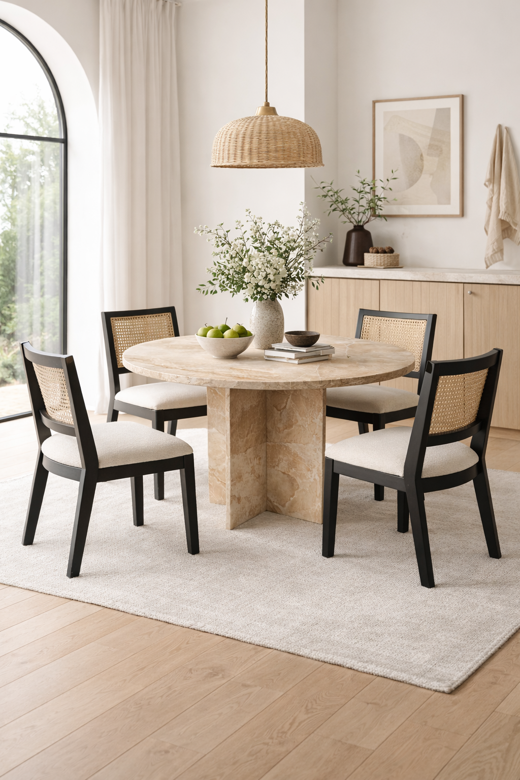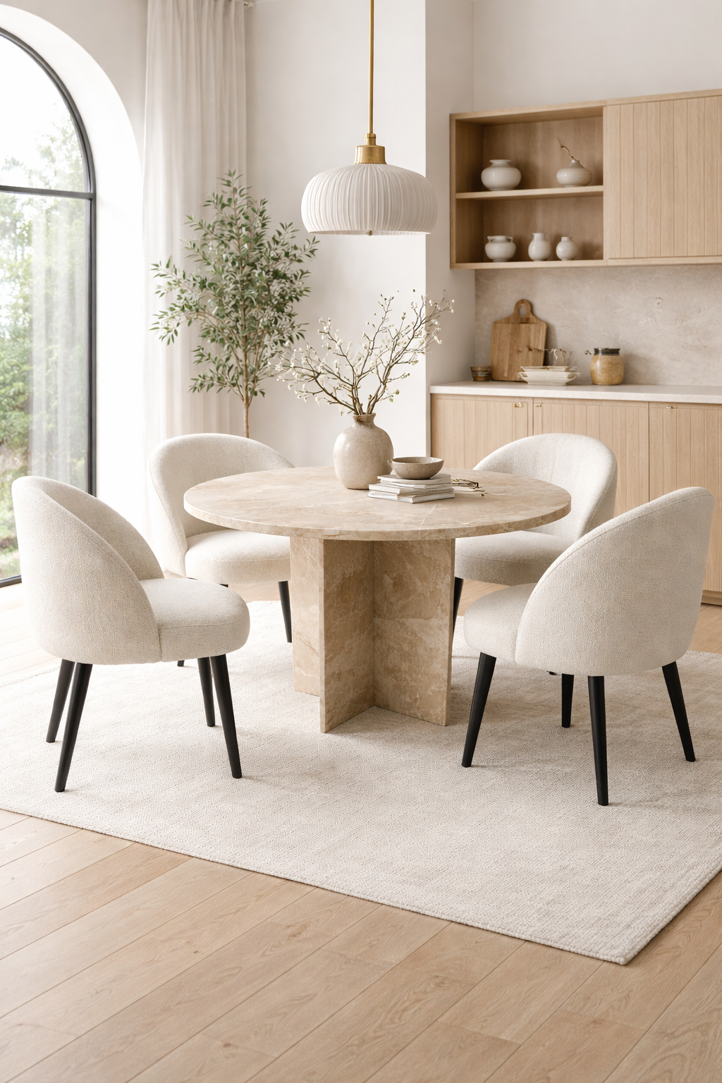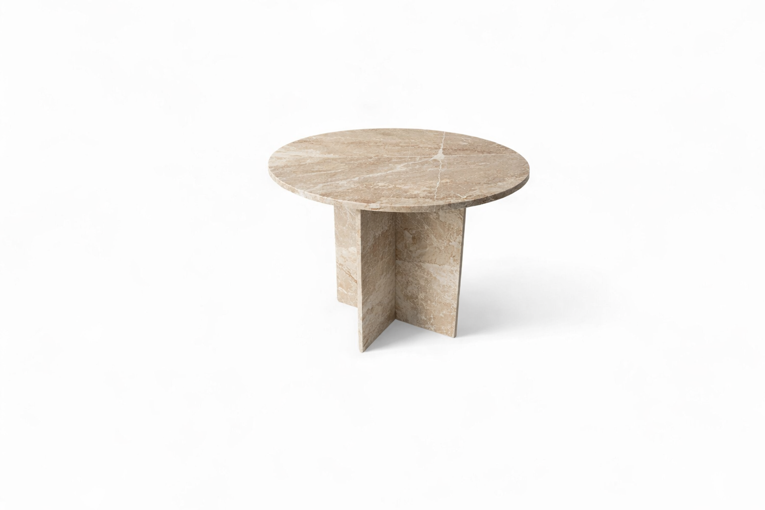 Stół beżowy okrągły z marmuru Daino Reale to elegancki i masywny mebel wykonany z naturalnego kamienia o ciepłych, beżowo-brązowych odcieniach.
