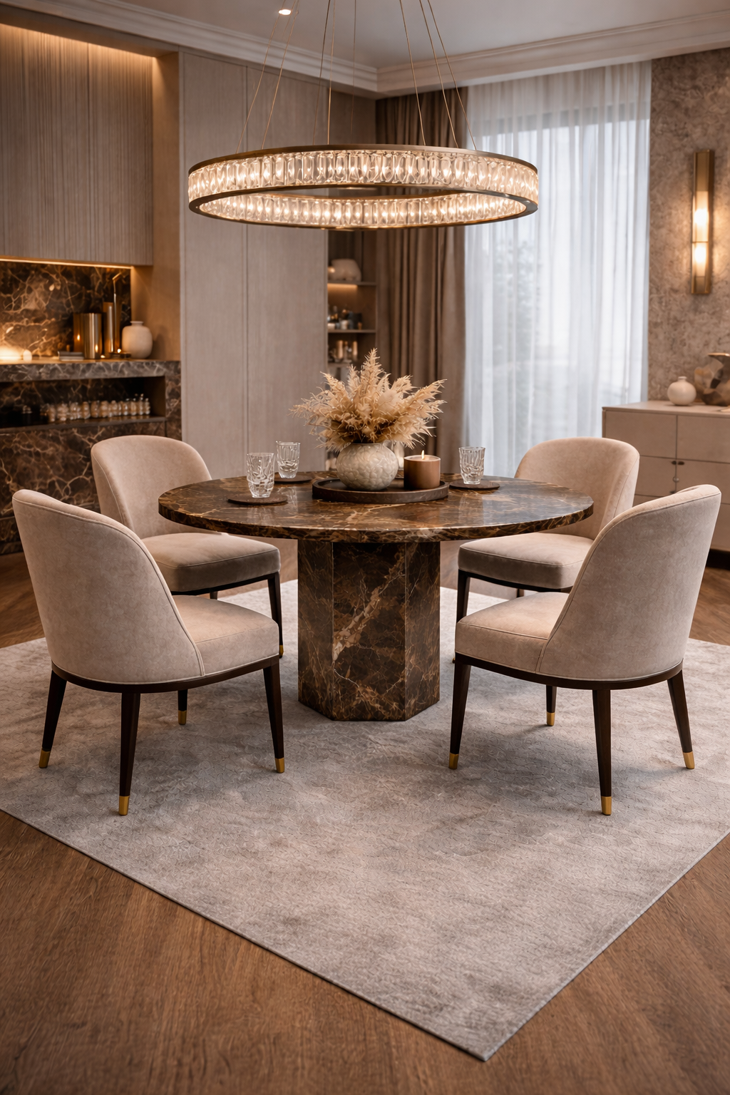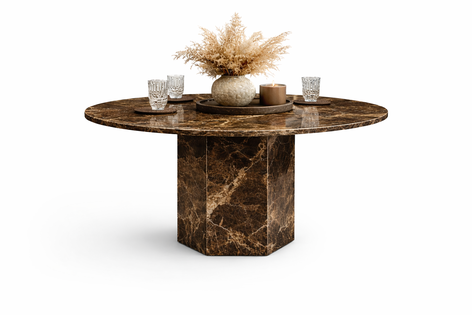 Stół z brązowego marmuru Emperador Dark to elegancki i masywny mebel wykonany z naturalnego kamienia o głębokiej, brązowej kolorystyce z jasnym, kontrastowym użyleniem.
